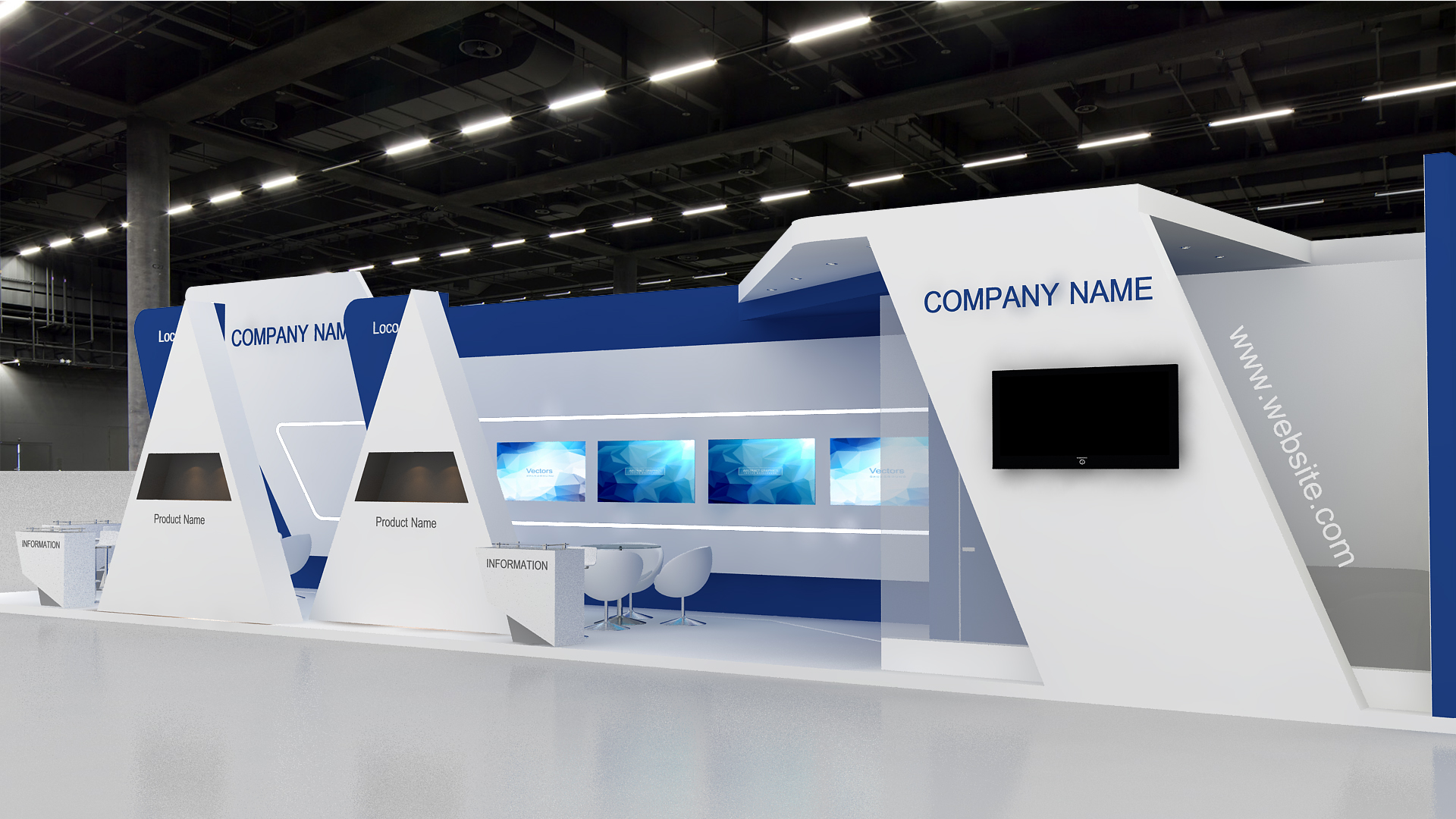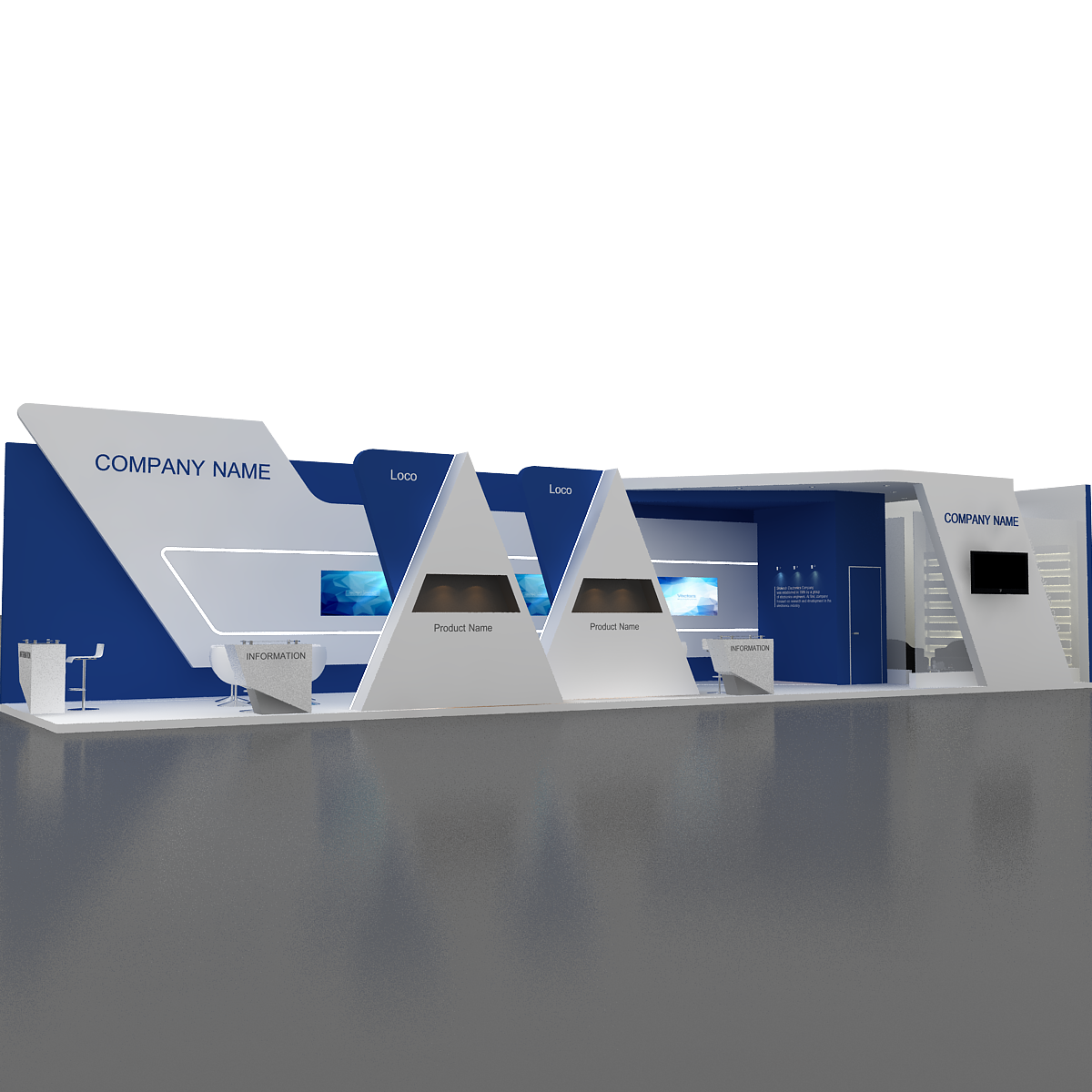 include design all necessary area in Exhibition and Booth Such as Vip and Storage and Counters and also Stand for products