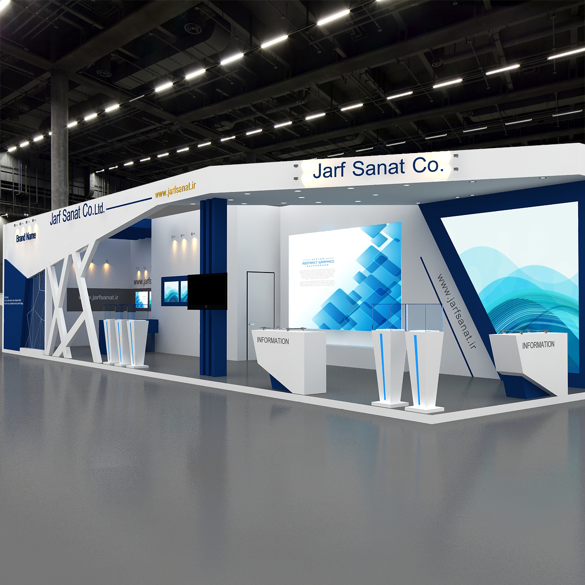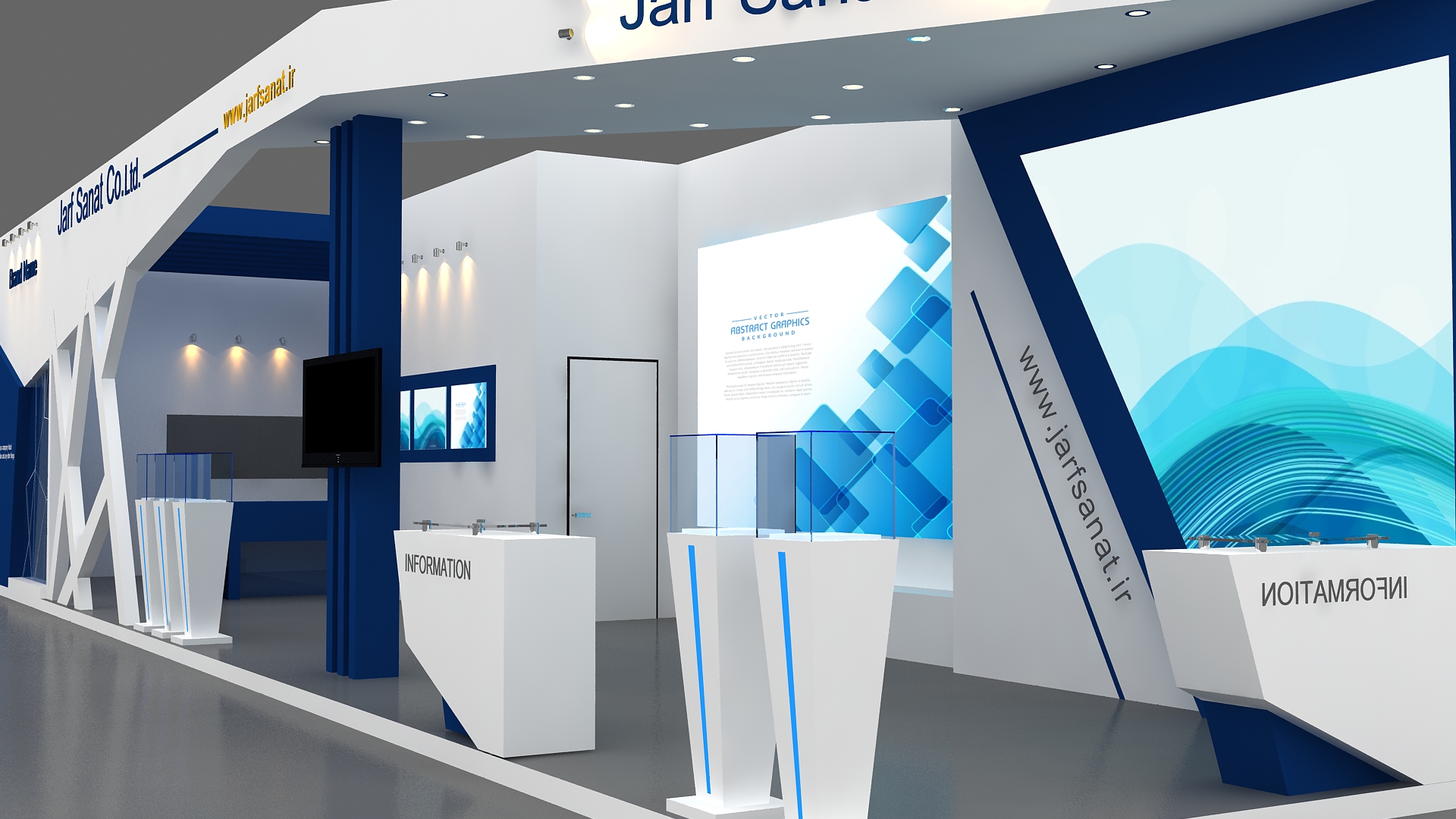 include design all necessary area in Exhibition and Booth Such as Vip and Storage and Counters and also Stand for products