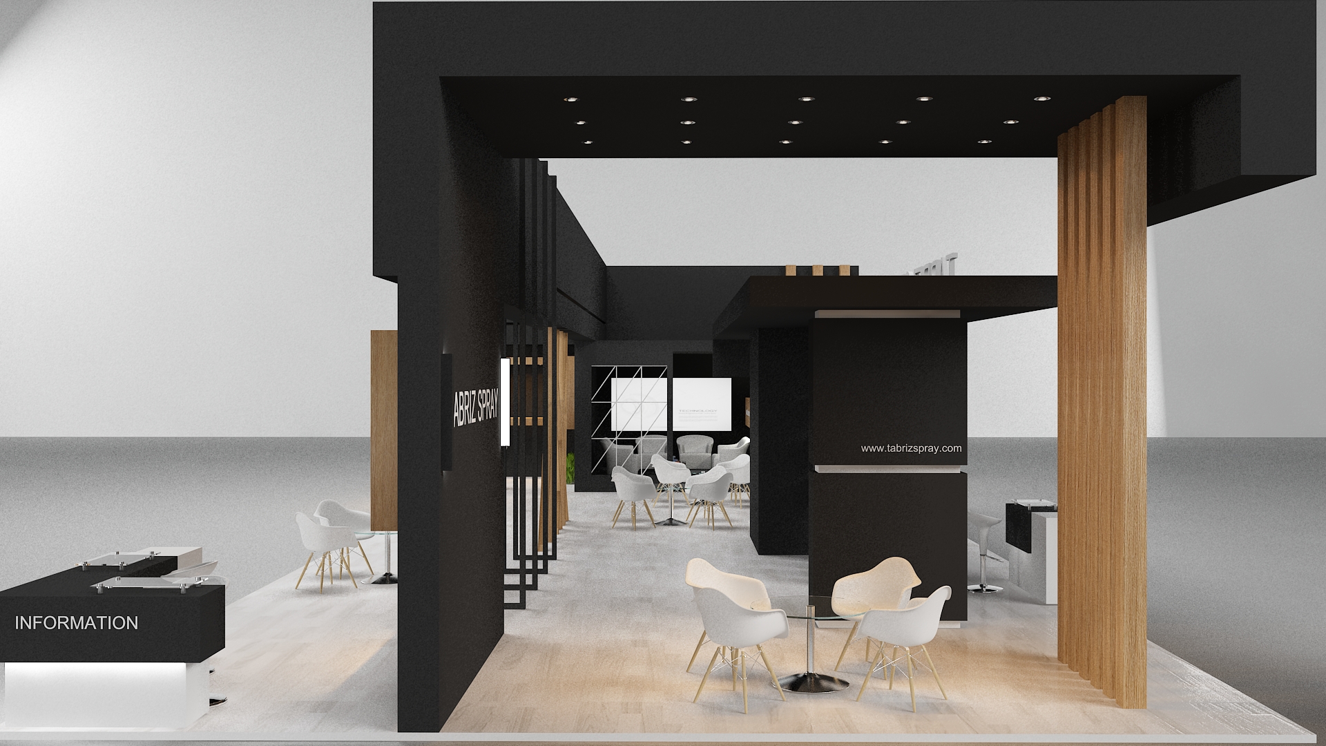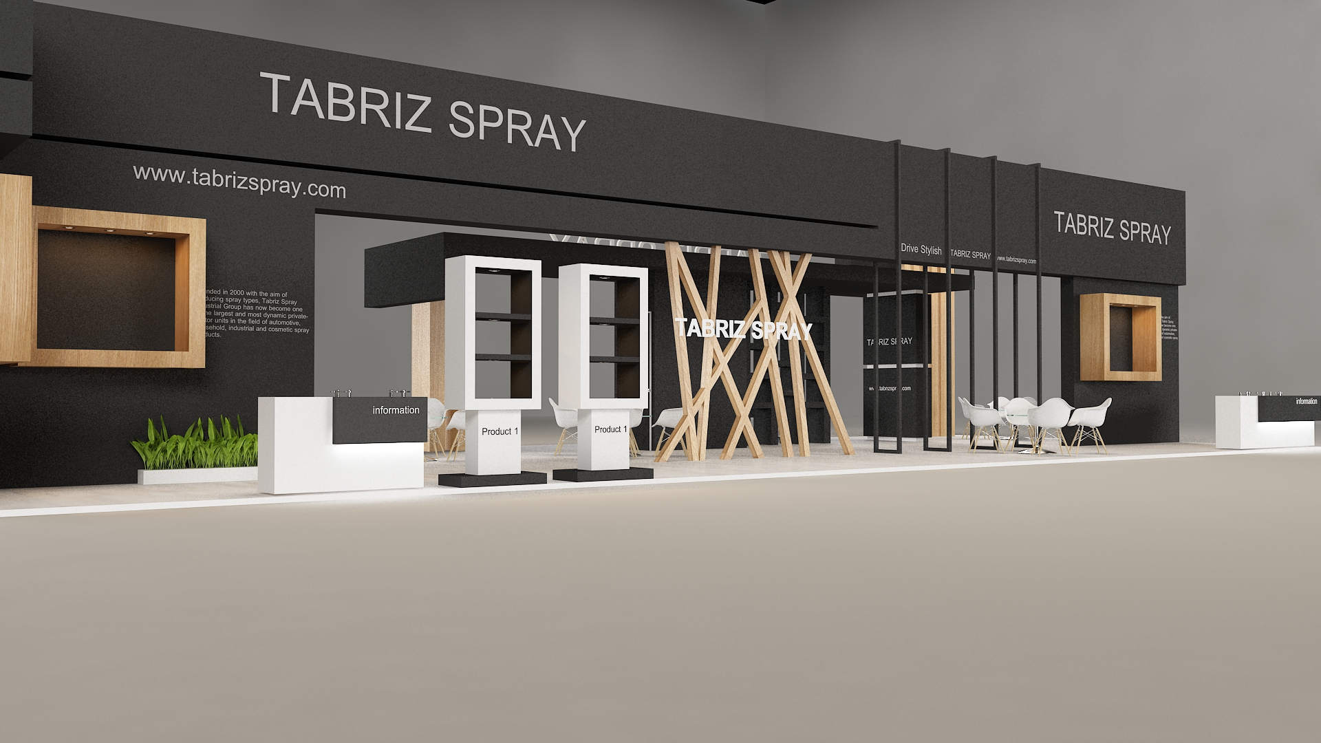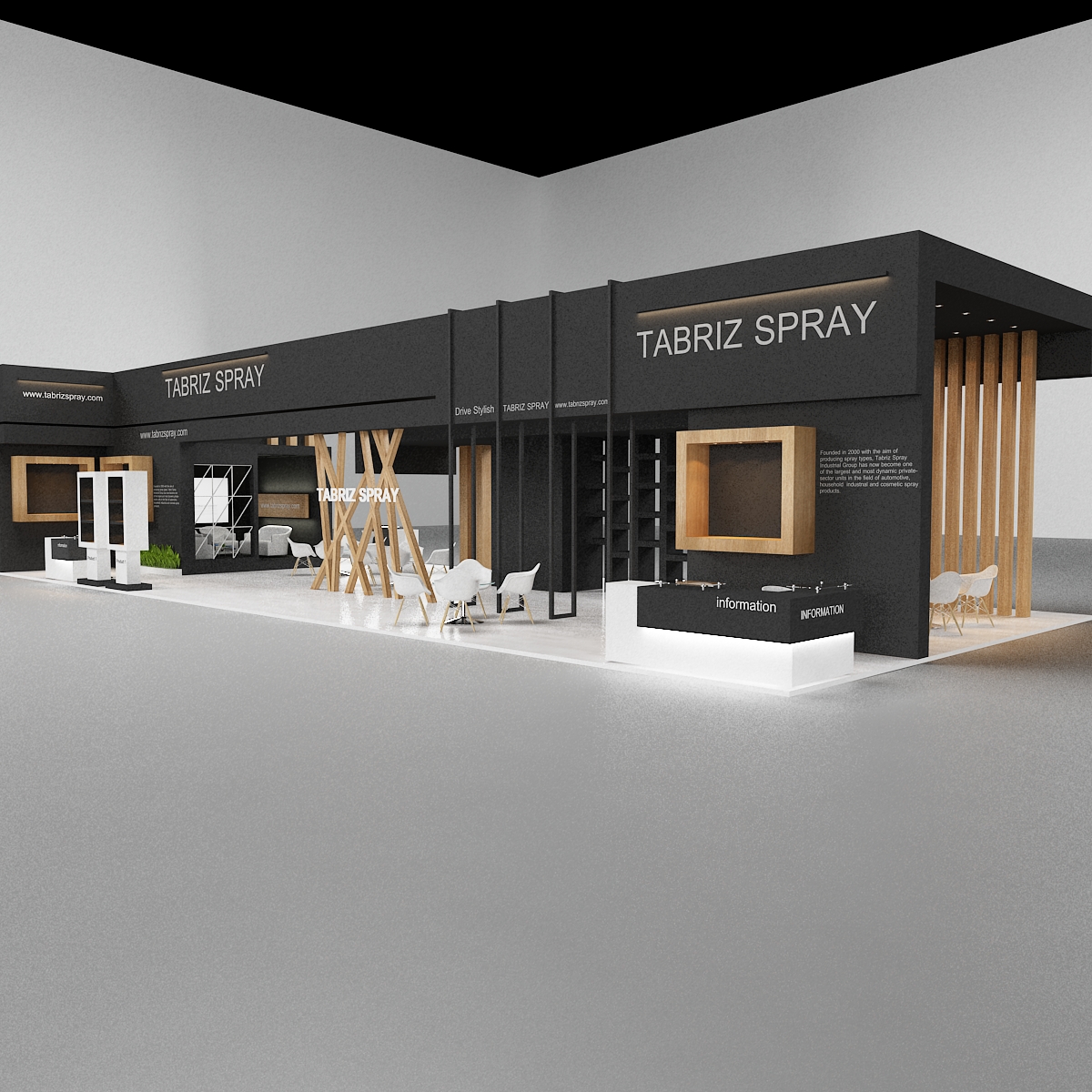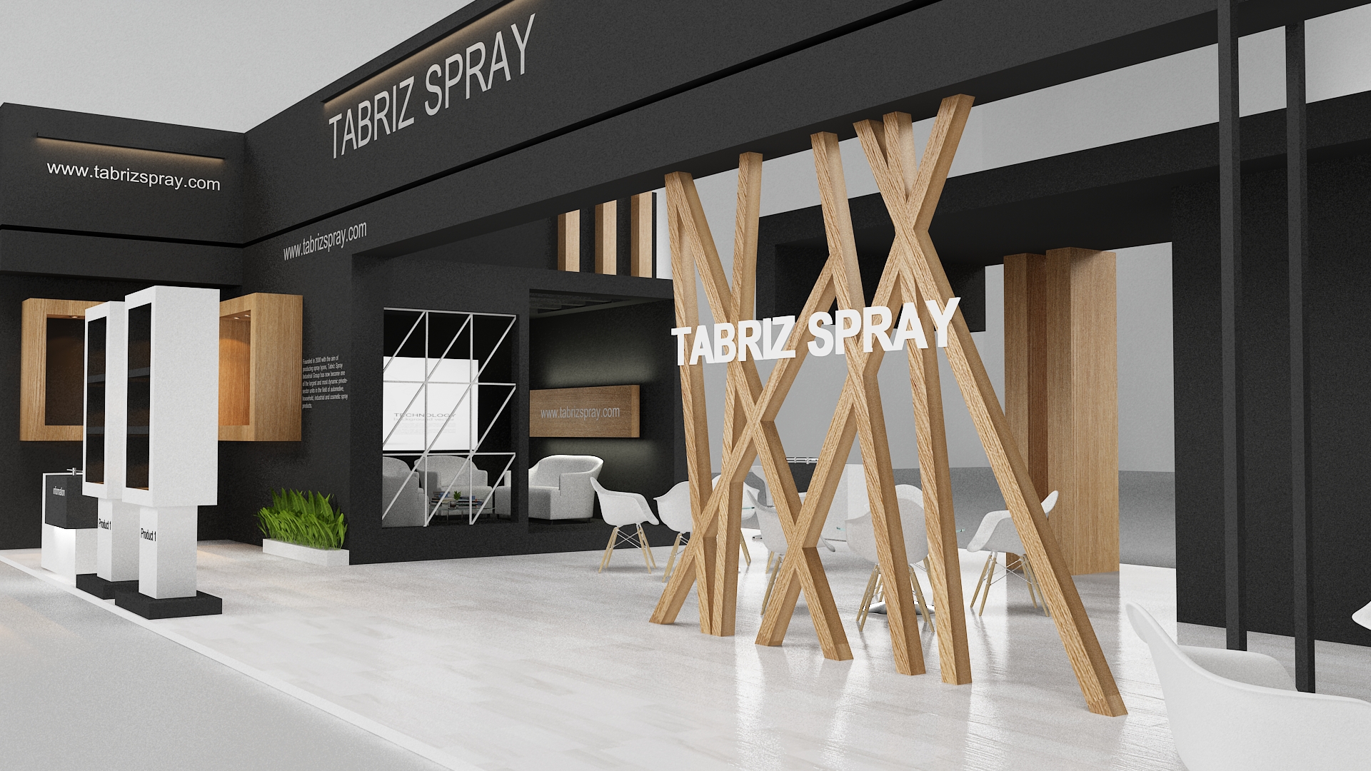 include design all necessary area in Exhibition and Booth Such as Vip and Storage and Counters and also Stand for products