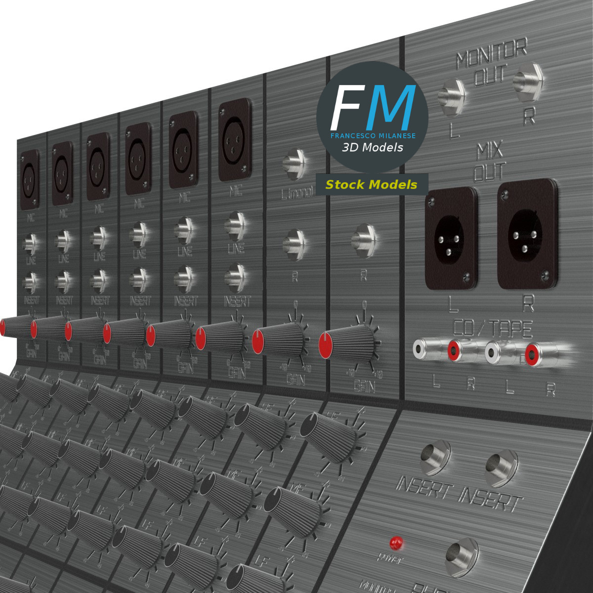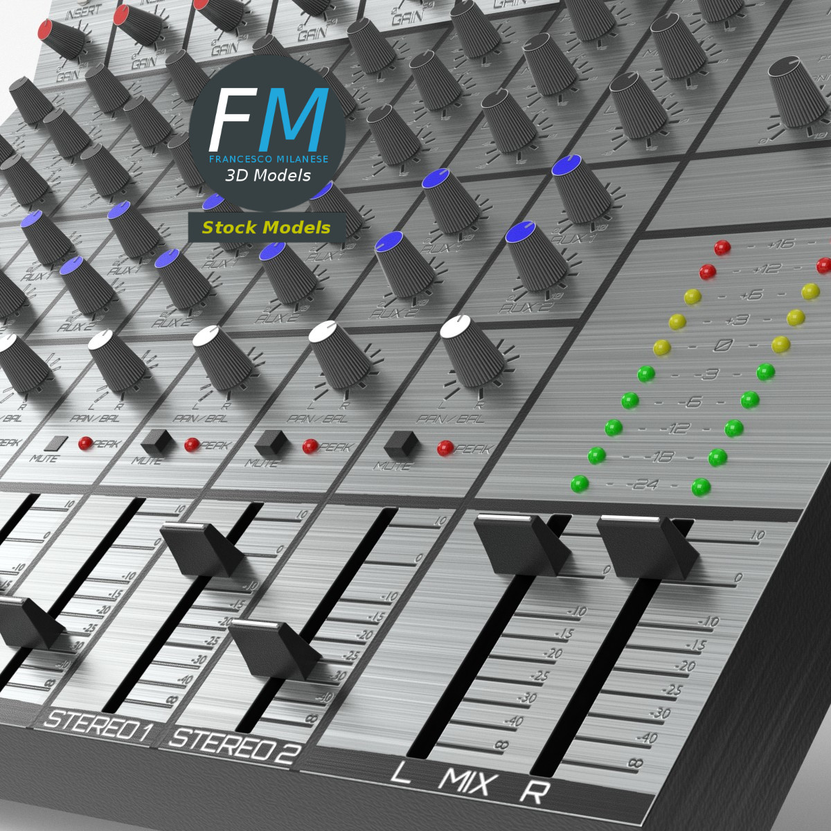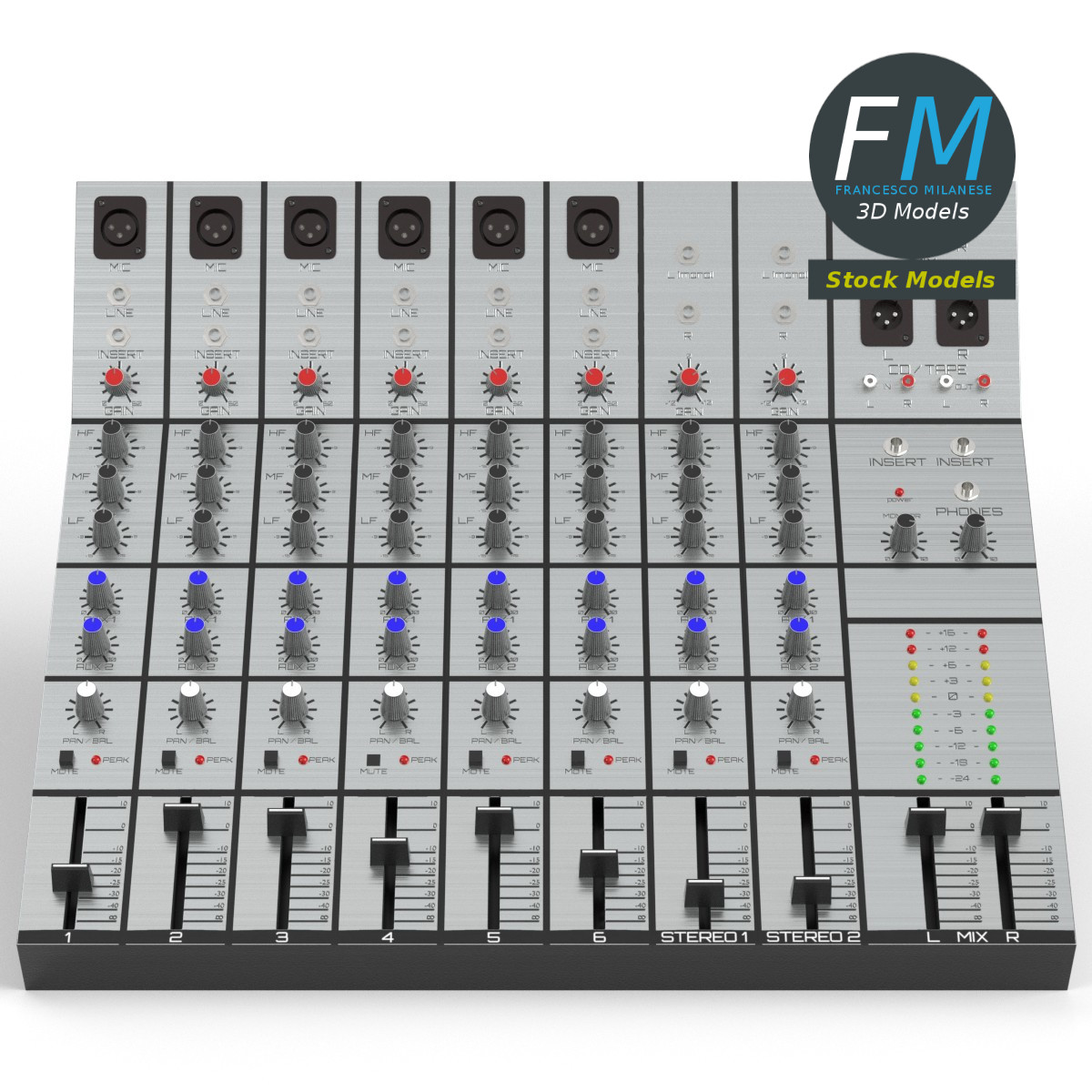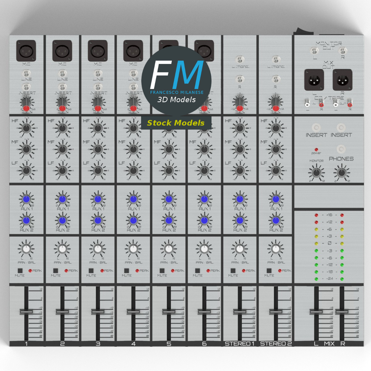 Audio mixer 3D Model, nr. 1 in my collection; 6+2 version: 6 mono + 2 stereo inputs. 77 individual objects (you can rotate or move each knob or slider), sharing the same OVERLAPPING UV Layout map, Material and PBR Textures set. Production-ready 3D Model, with PBR materials, textures, overlapping UV Layout map provided in the package.