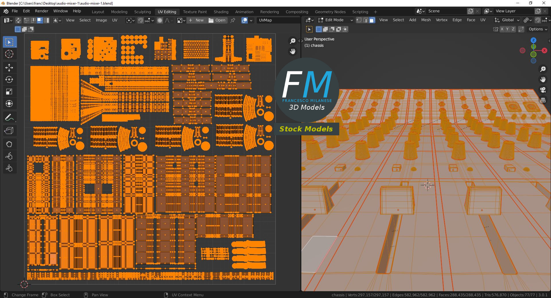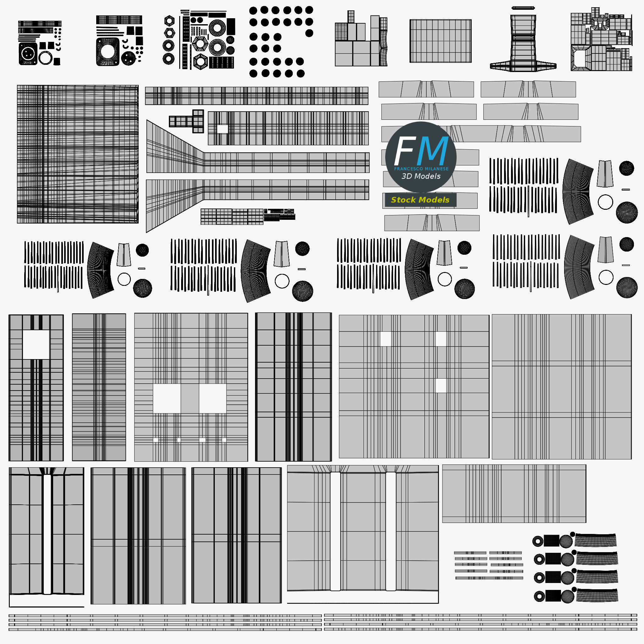 Easily customizable: UV unwrapped geometries, so you can create new Textures (or modify the existing ones) using the UV Layout maps provided in the package (as png with alpha).