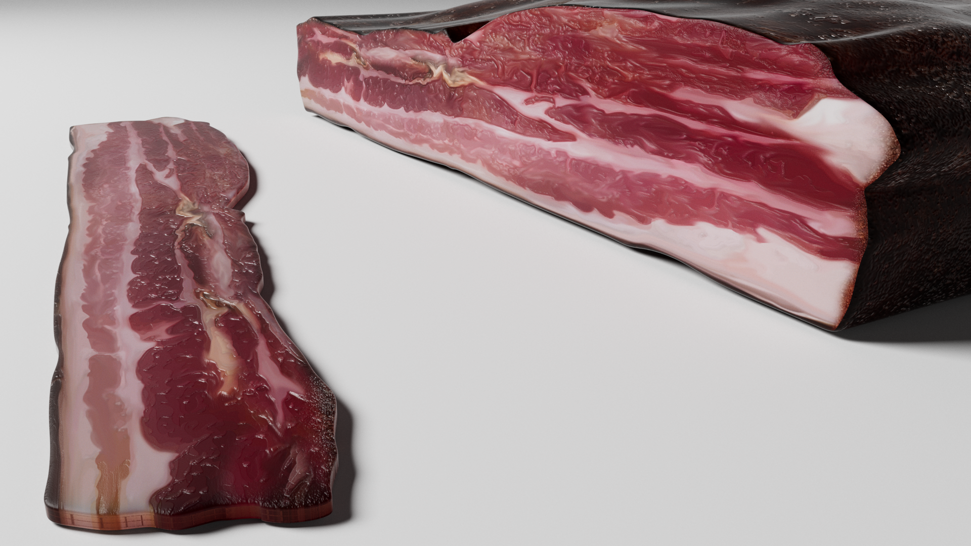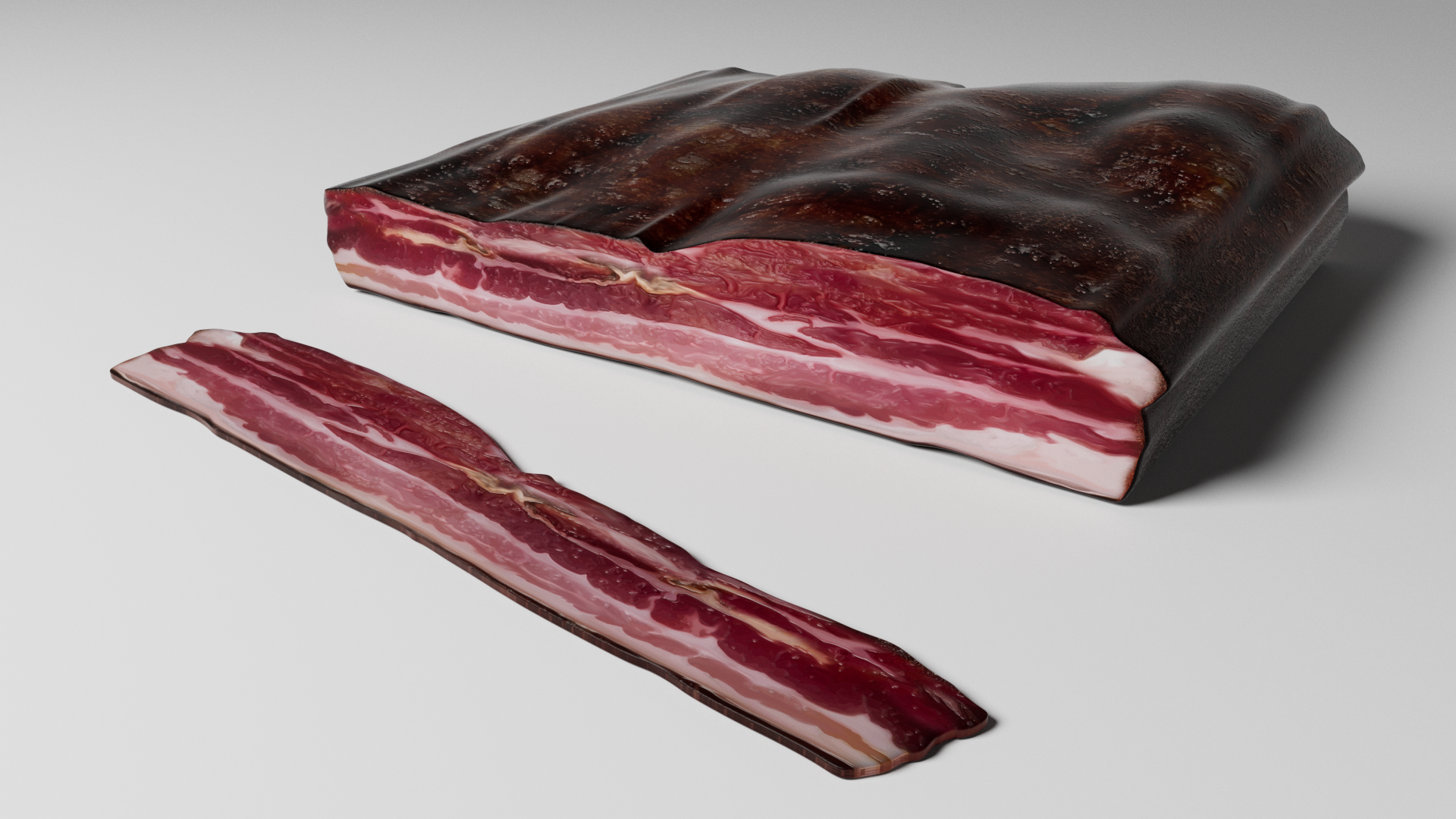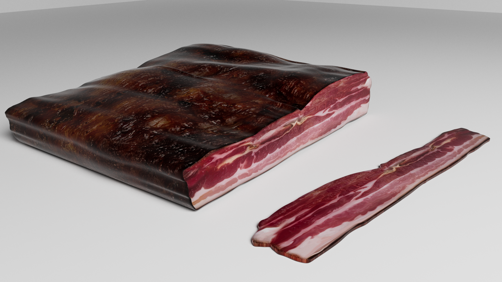 3d moddel of bacon. The file contains texture maps, color maps, bump maps, normal maps and mesh. The materials are not included. Cover images are rendered with vray materials and lights.