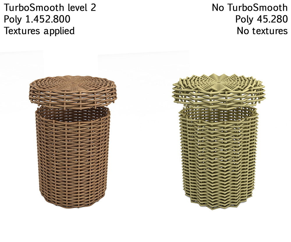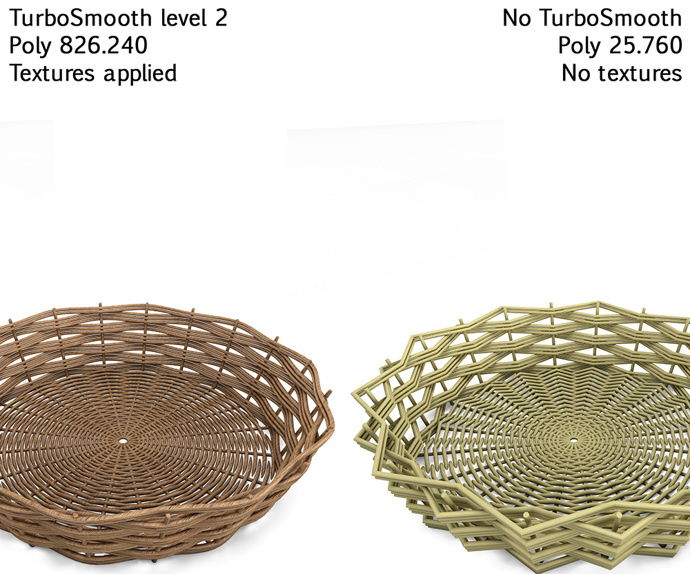 - 9 types of basket - The pack are over 300.000 poly - With Turbosmooth level 2: 9.900.000 poly - Low poly and High poly included (clean / turbosmoothed applied and converted poly)