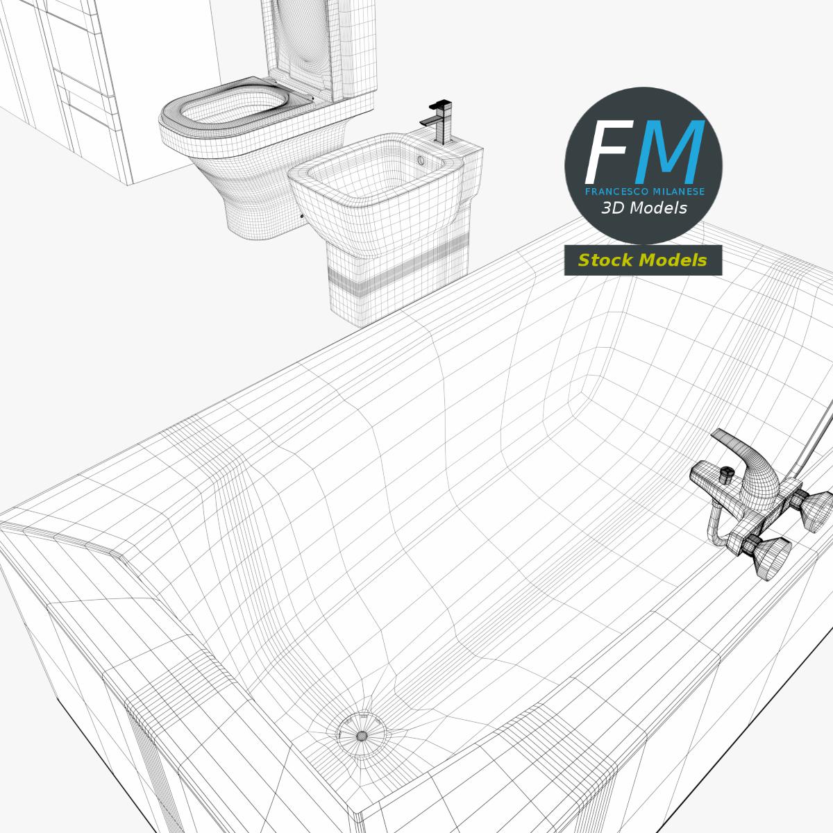 Bathroom set 3D Model. 4 individual objects (water closet, bidet, washbasin sink, bathtub), sharing the same non overlapping UV Layout map, Material and PBR Textures set. Production-ready 3D Model, with PBR materials, textures, non overlapping UV Layout map provided in the package.