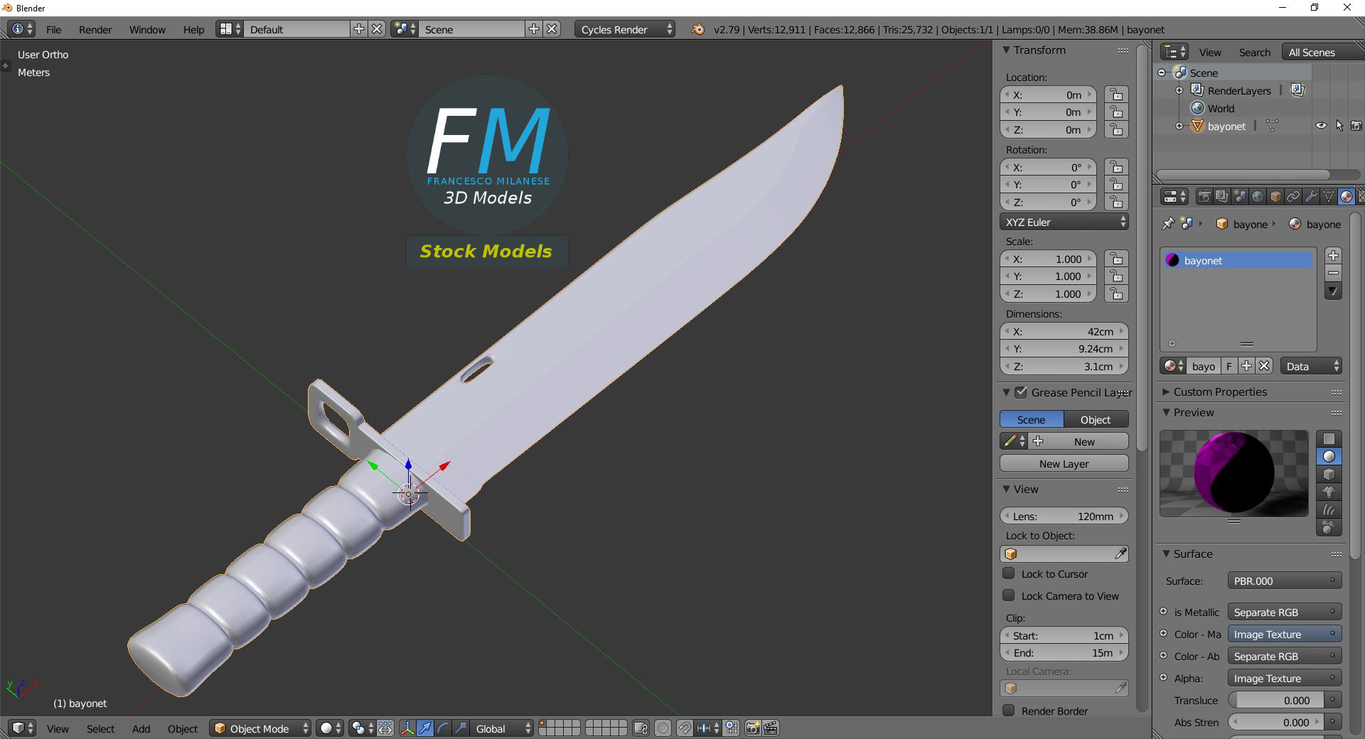 Bayonet 3D Model. Production-ready 3D Model, with PBR materials, textures, non overlapping UV Layout map provided in the package.