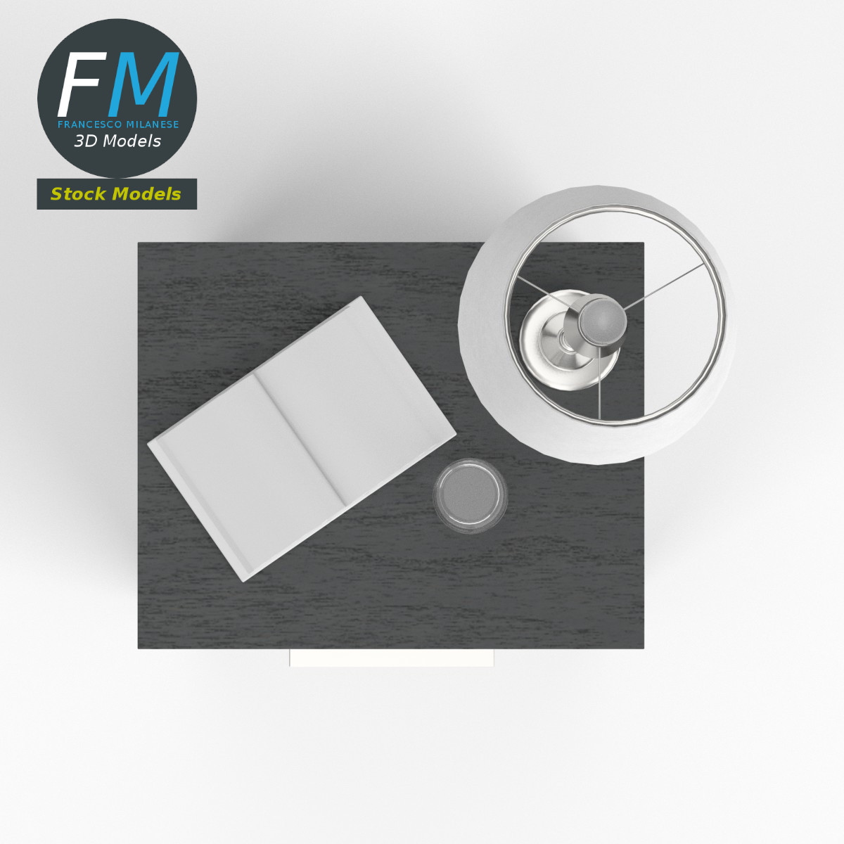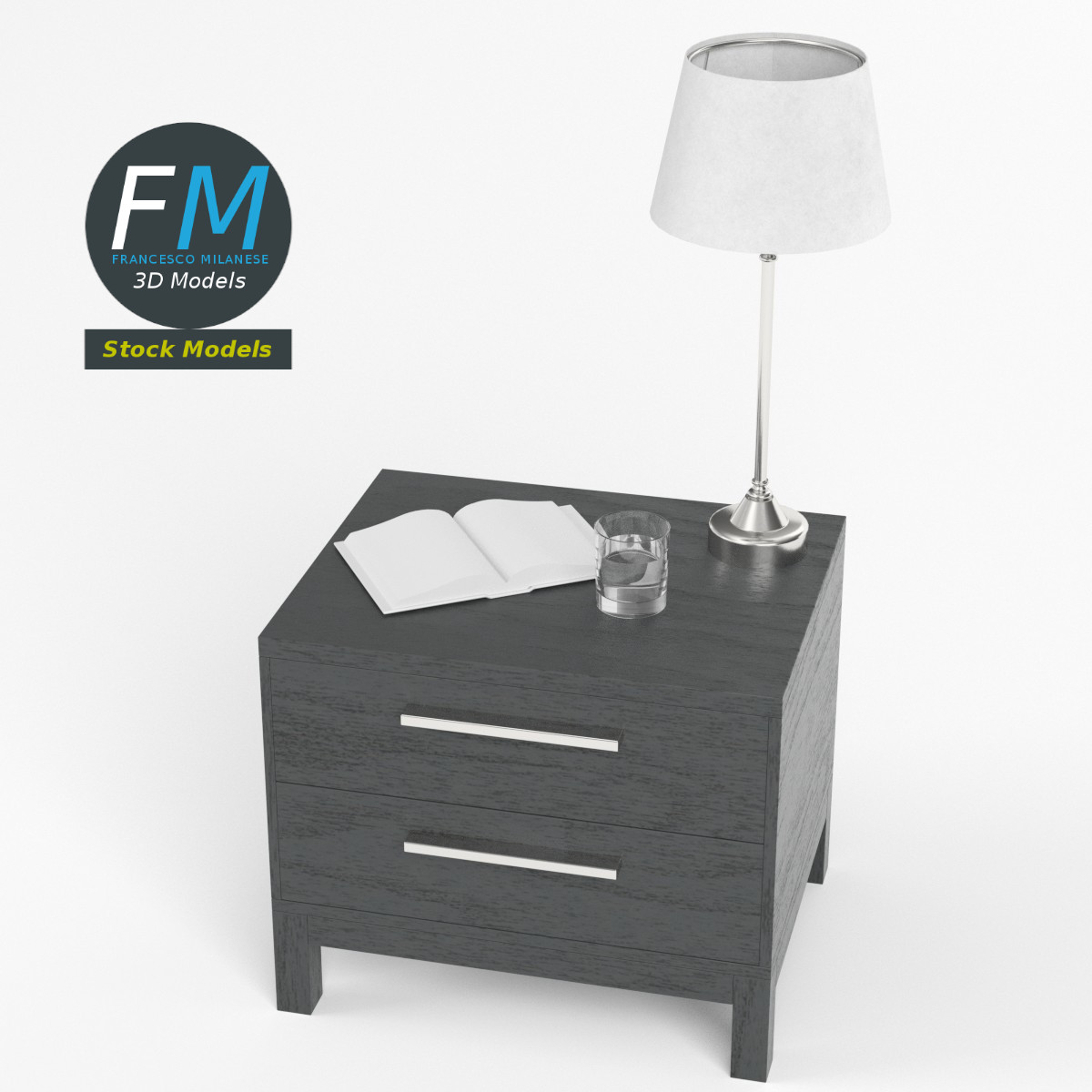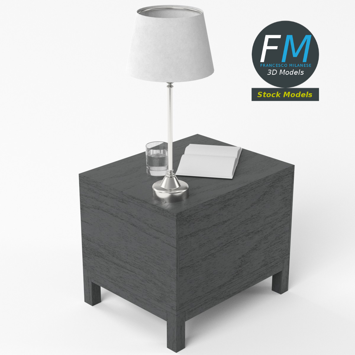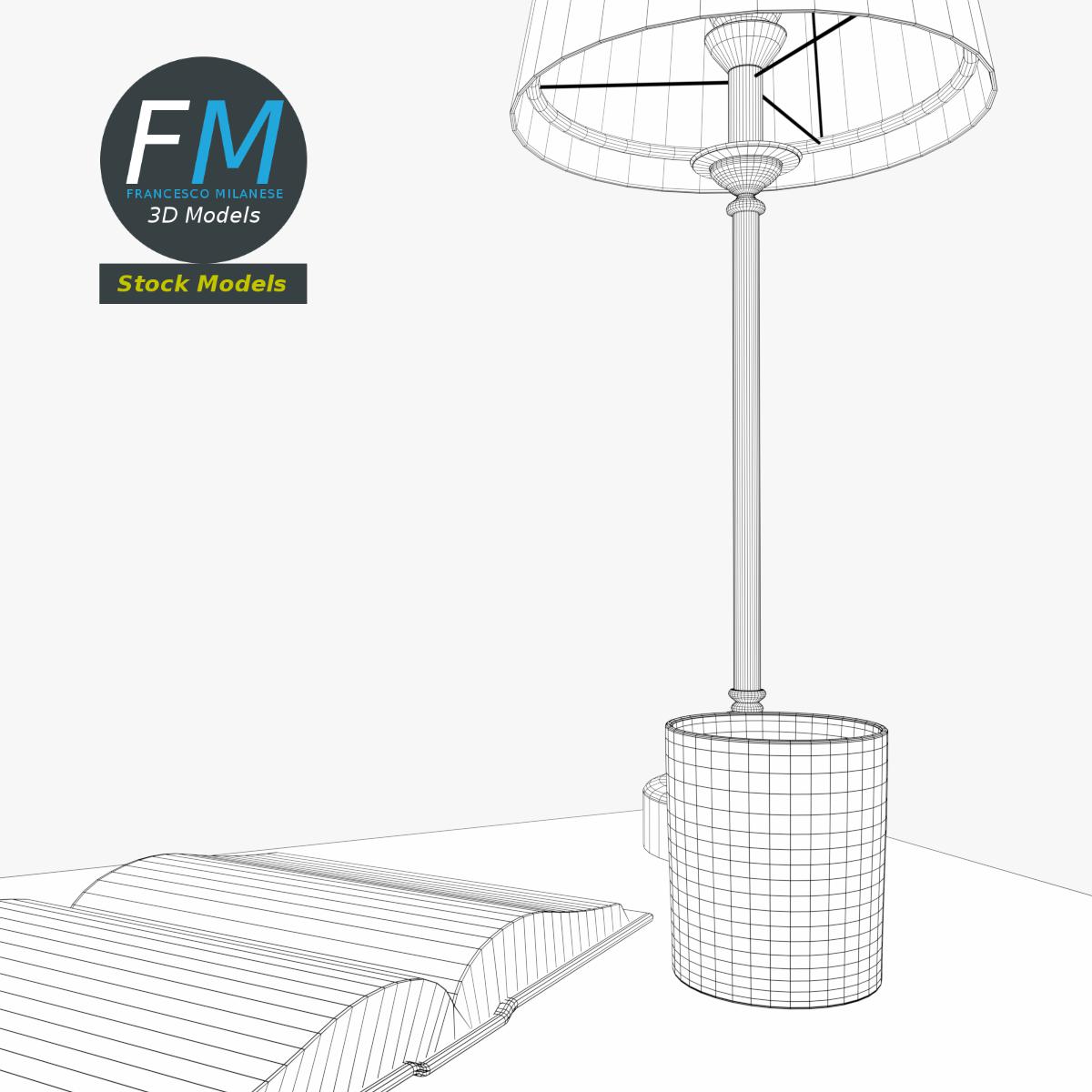 Bedside table set 3D Model, nr. 3 in my collection. 5 individual objects (table, lamp, book, glass, liquid) sharing 1 non-overlapping UV Layout map, 3 Materials (set; glass; liquid) and PBR Textures sets. Production-ready 3D Model, with PBR materials, textures, non overlapping UV Layout map provided in the package.