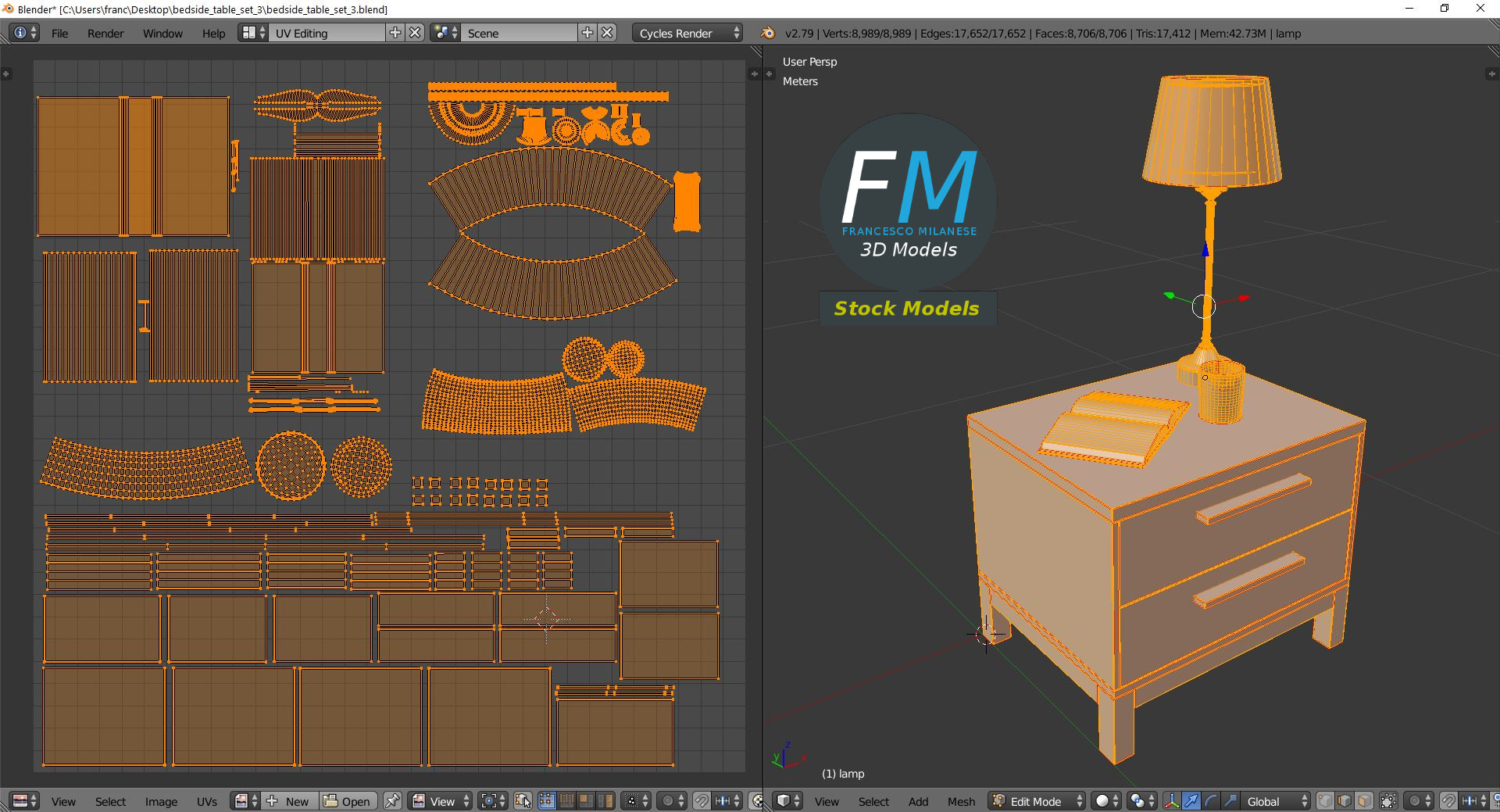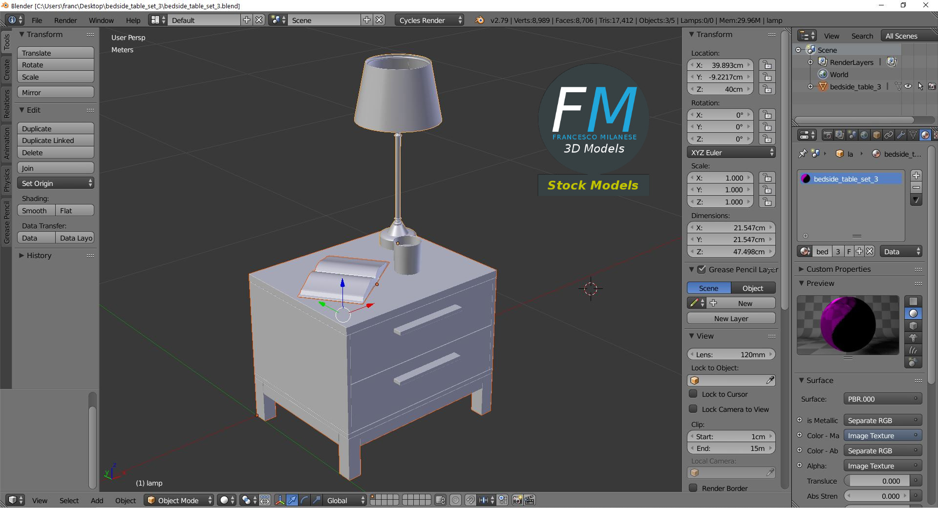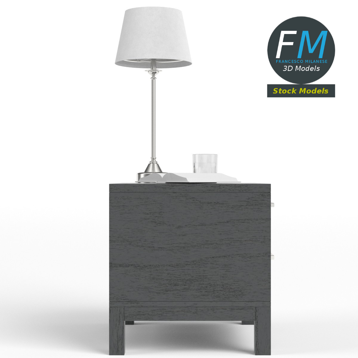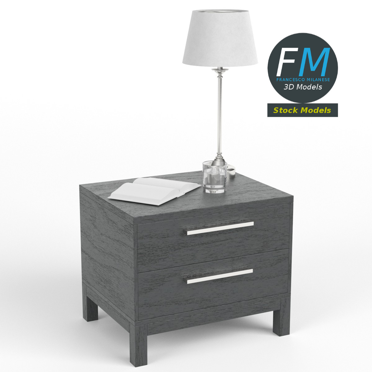 Bedside table set 3D Model, nr. 3 in my collection. 5 individual objects (table, lamp, book, glass, liquid) sharing 1 non-overlapping UV Layout map, 3 Materials (set; glass; liquid) and PBR Textures sets. Production-ready 3D Model, with PBR materials, textures, non overlapping UV Layout map provided in the package.