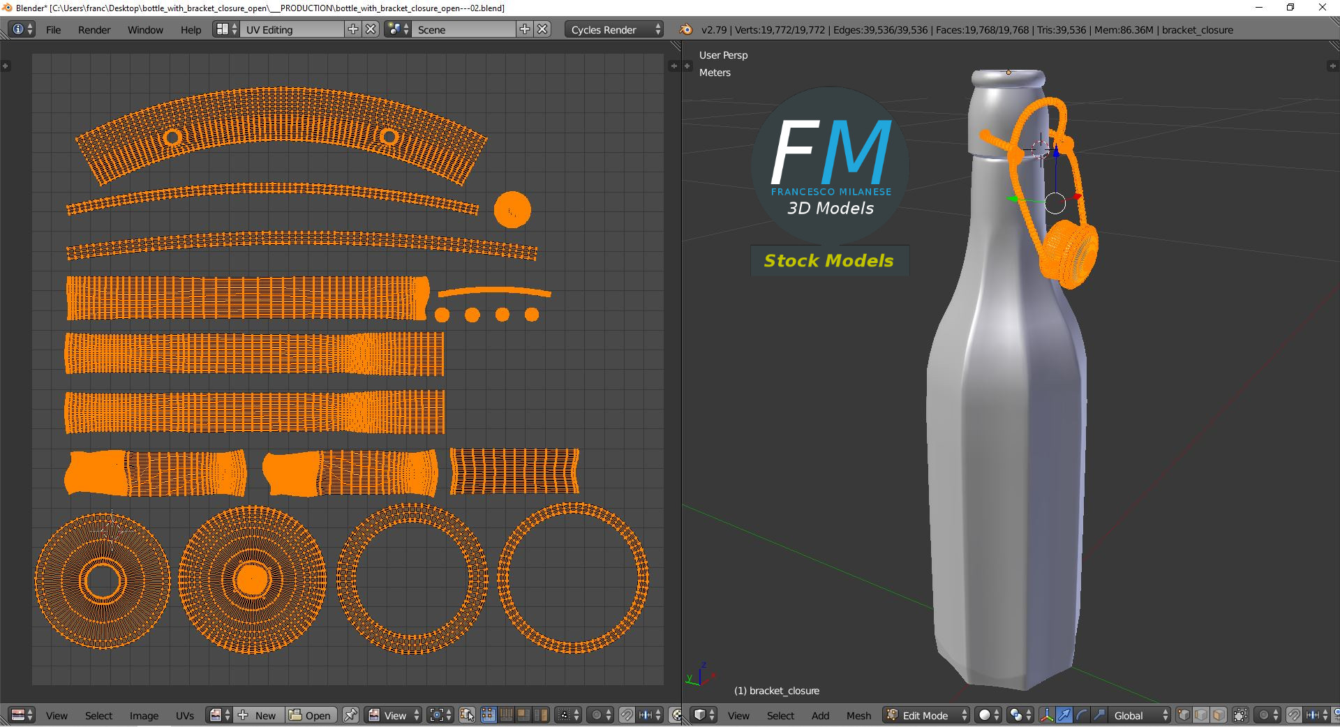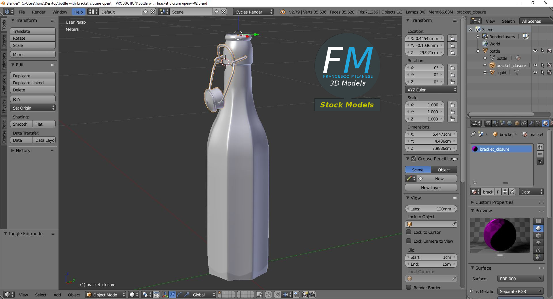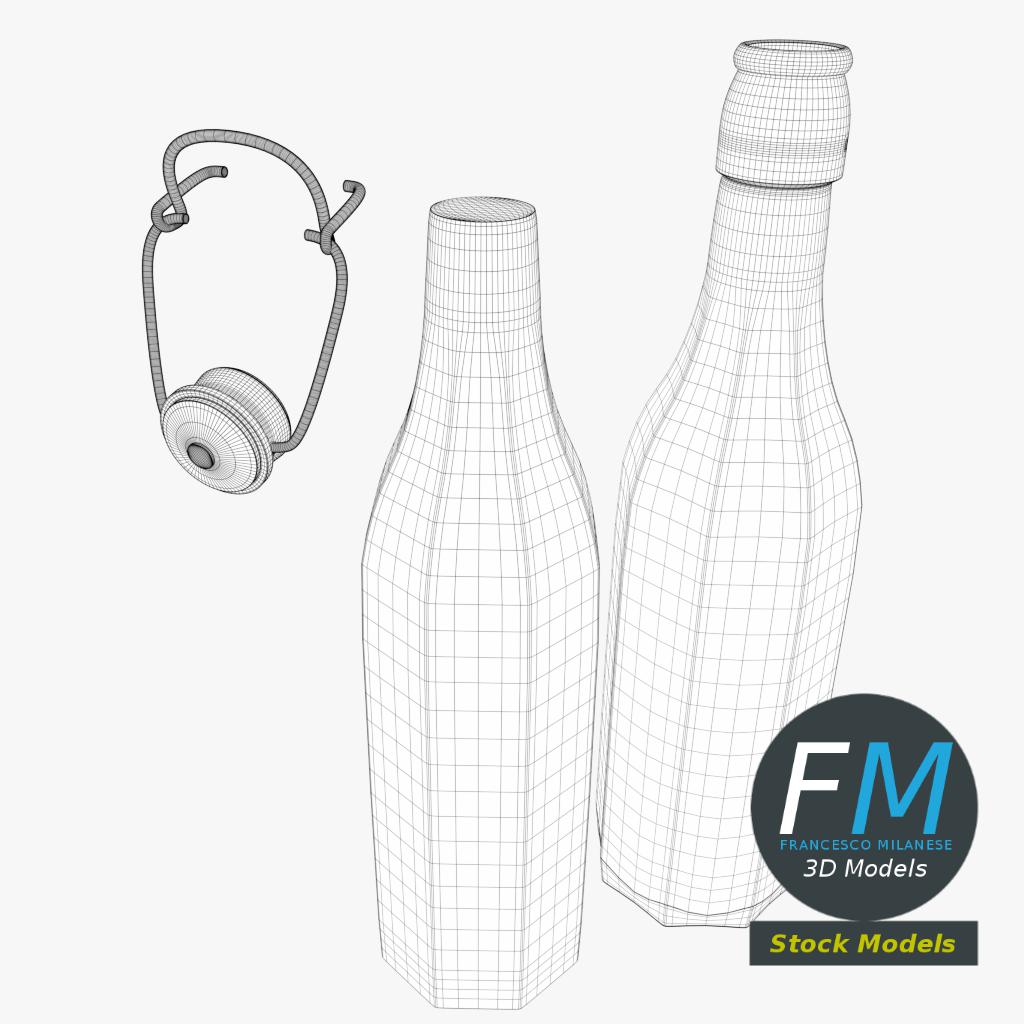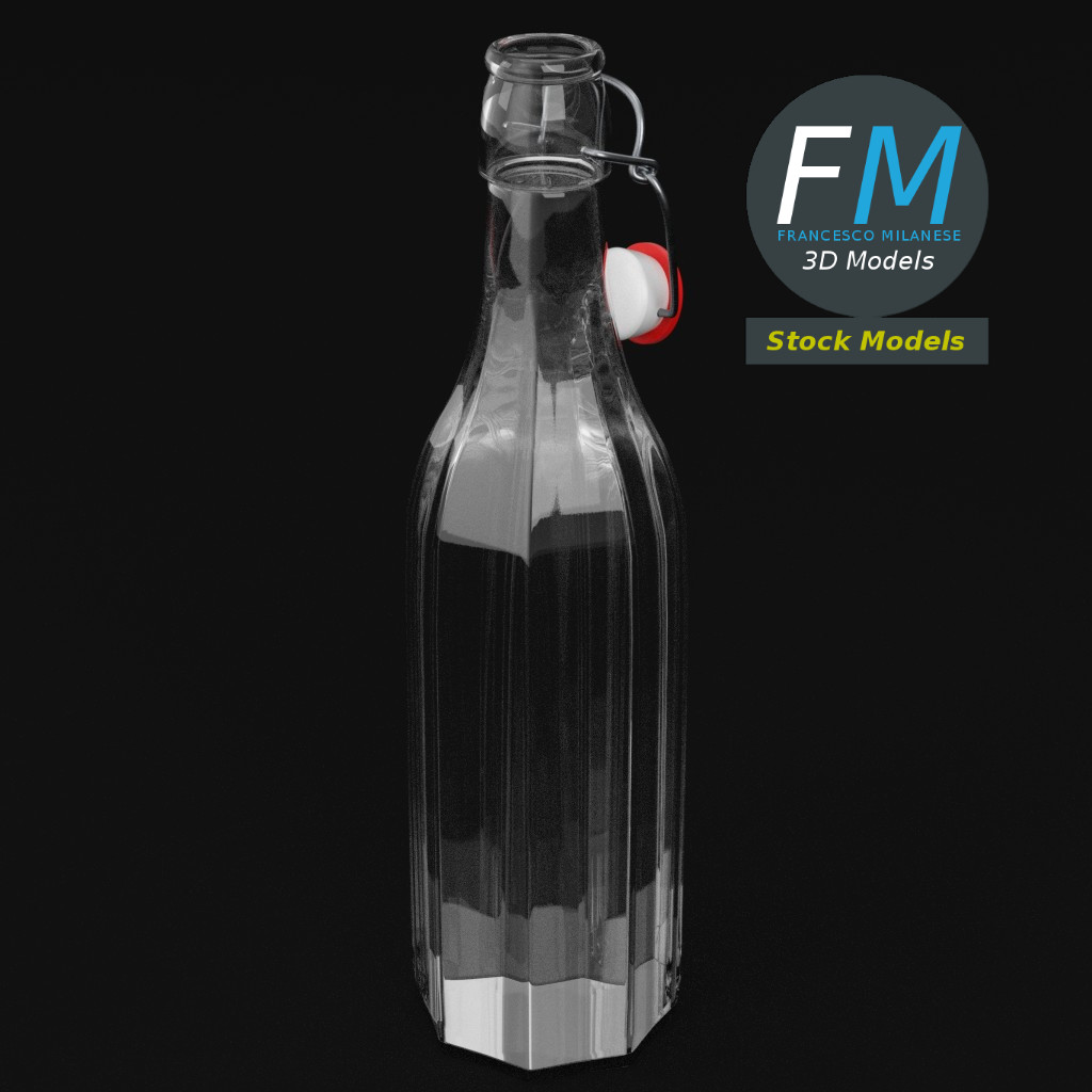 Bottle with bracket closure 3D Model, open version (take a look at my portfolio for the closed version). 3 individual objects (liquid, bracket closure, glass), each one with its own non overlapping UV Layout map, Material and PBR Textures set. Production-ready 3D Model, with PBR materials, textures, non overlapping UV Layout map provided in the package.