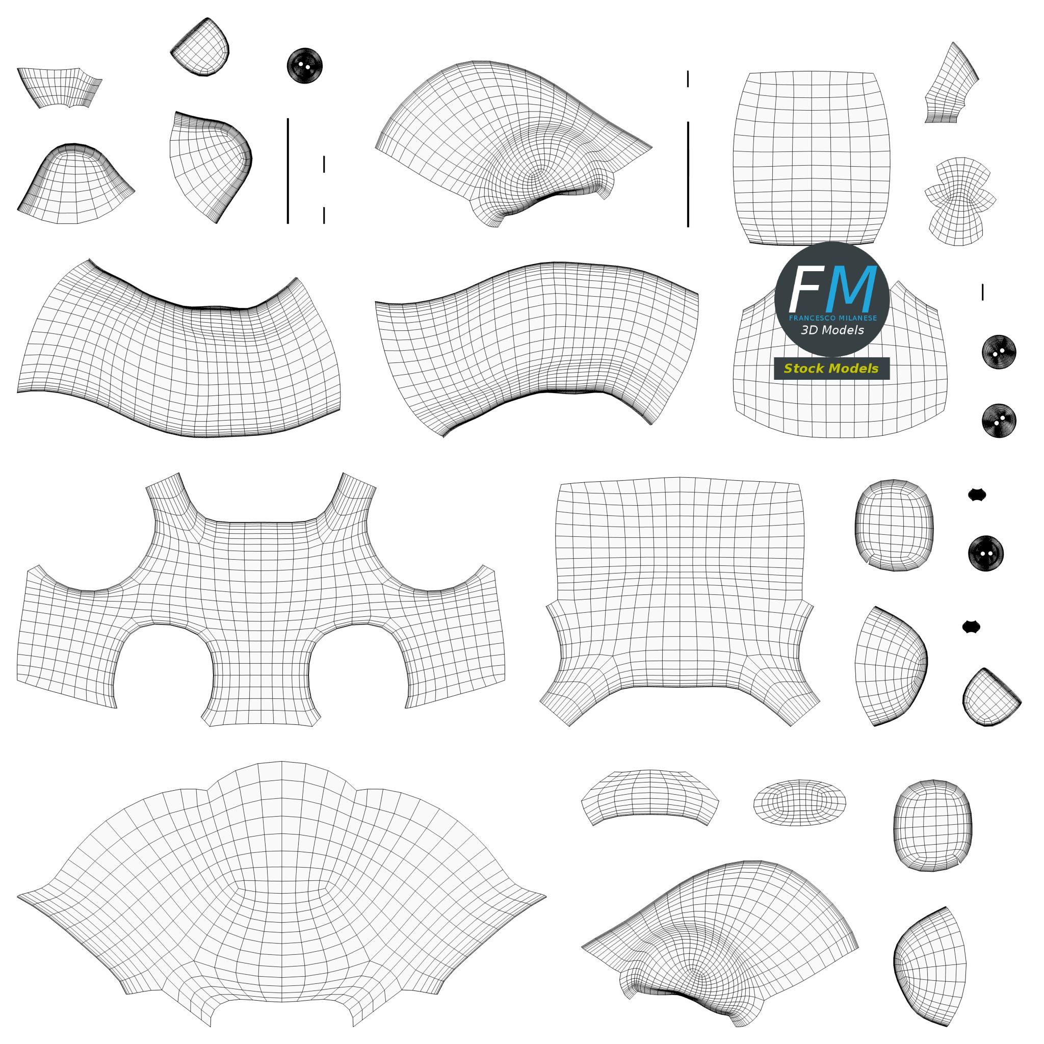 Easily customizable: UV unwrapped geometries, so you can create new Textures (or modify the existing ones) using the UV Layout maps provided in the package (as png with alpha).