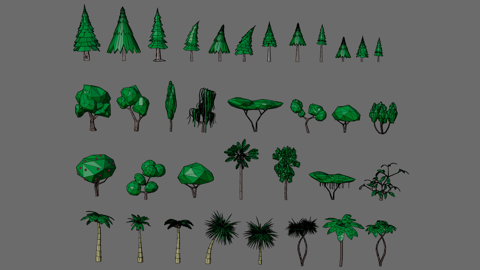 All trees are divided into 3 categories, so that you can create anything you want: conifers, tropical, deciduous.