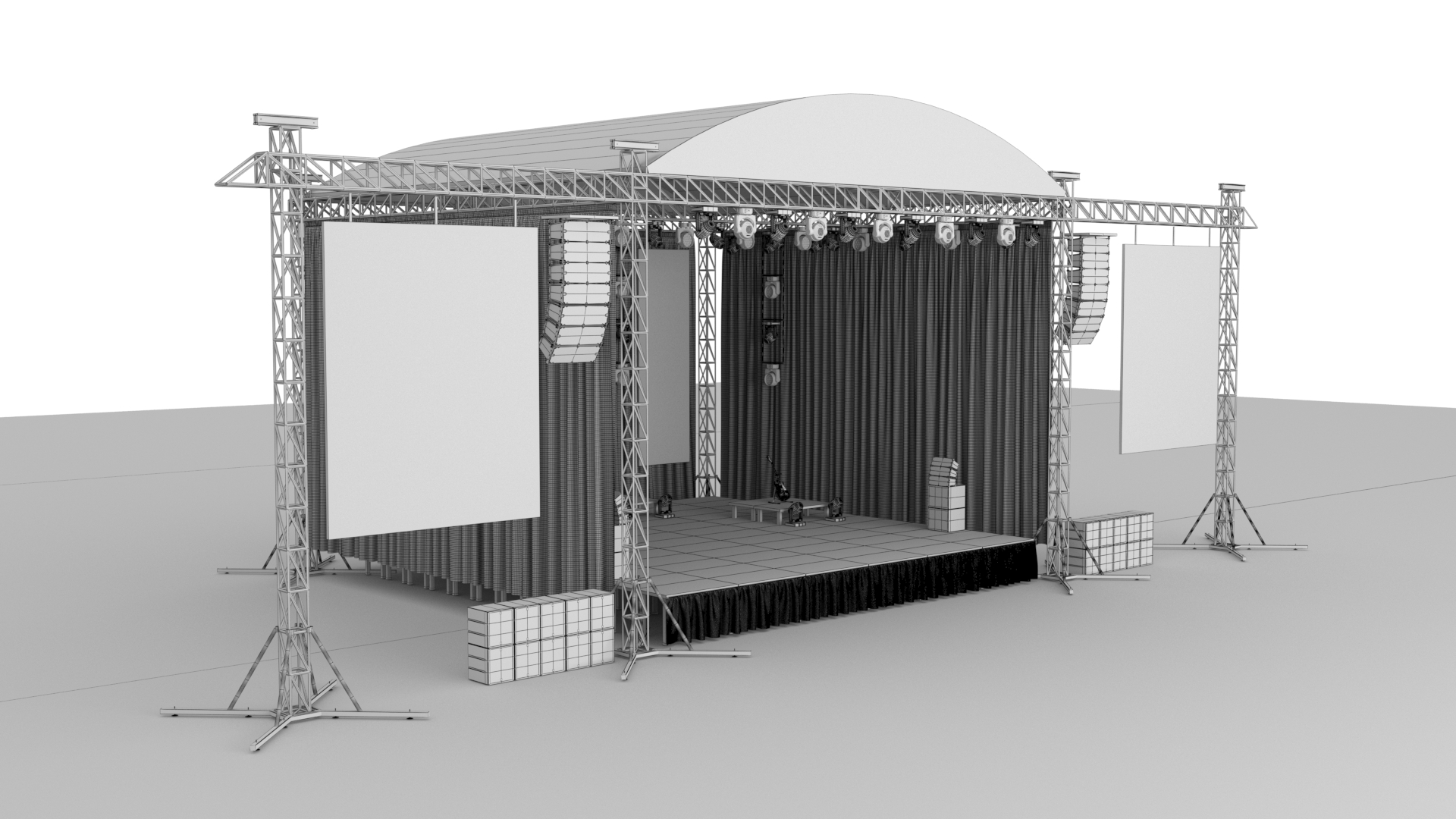 The model includes 6 leg truss, sound system, stage podium and spotlight model. You can edit the model as you wish. I also offer printouts in extra formats.