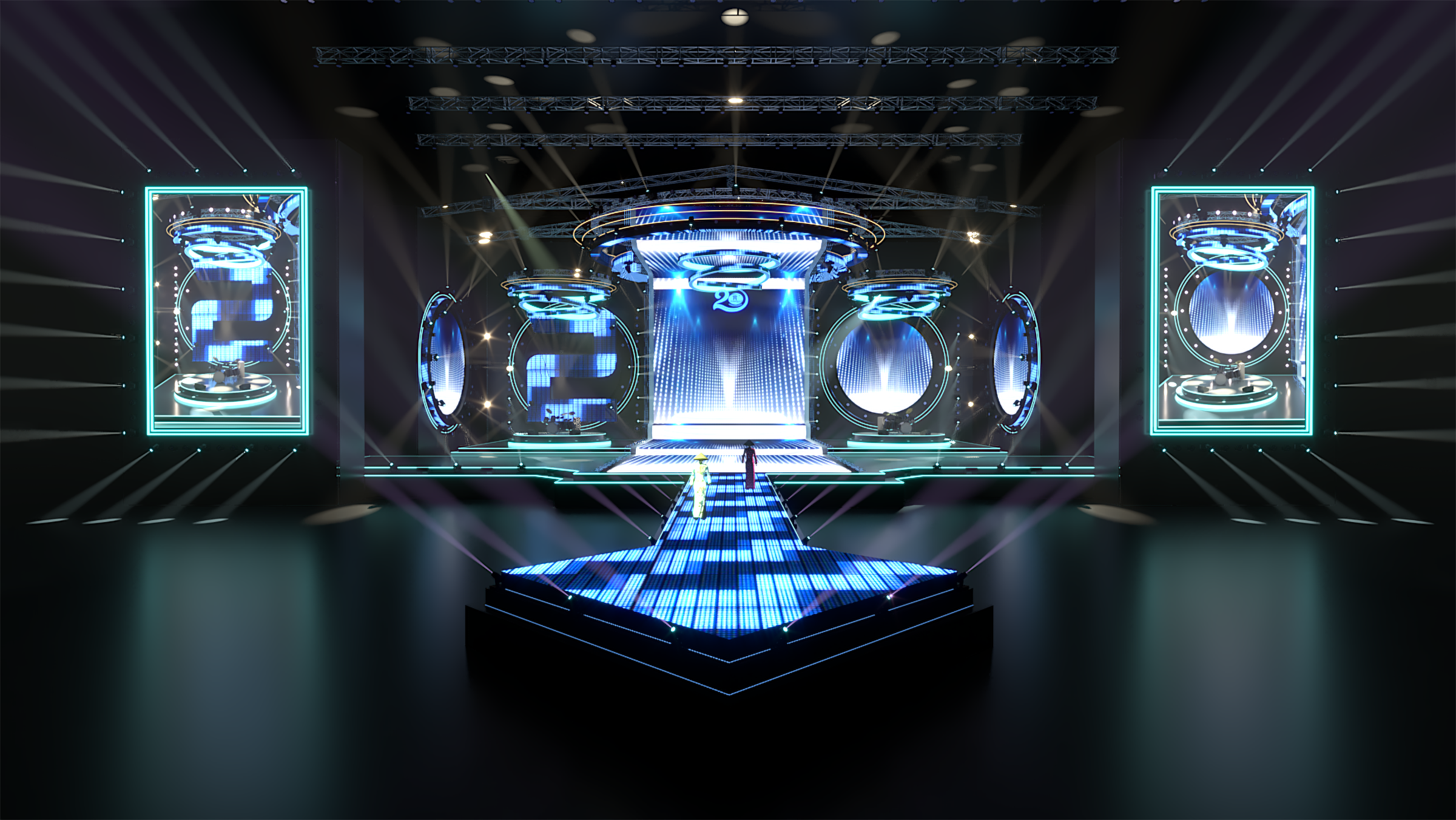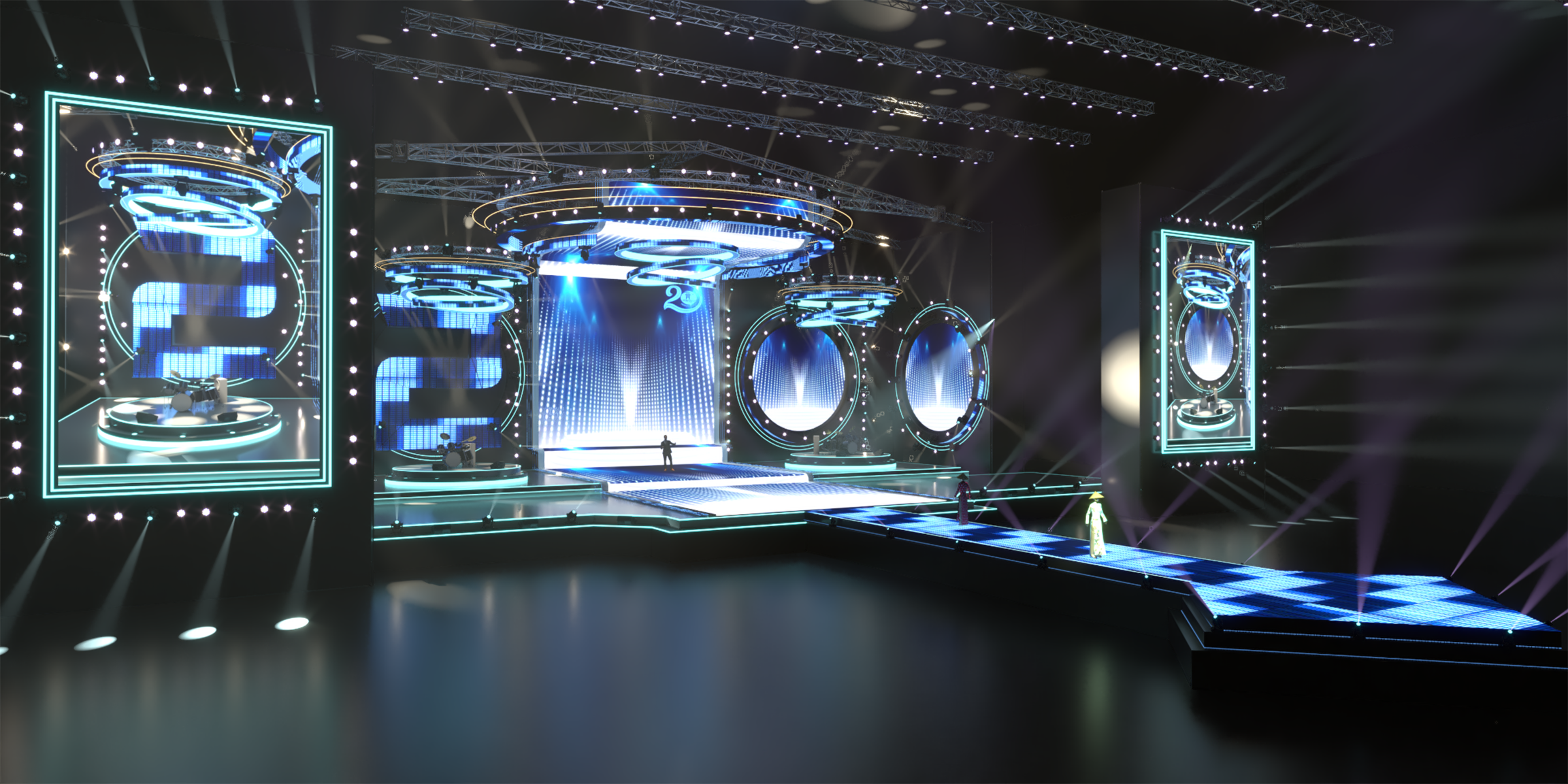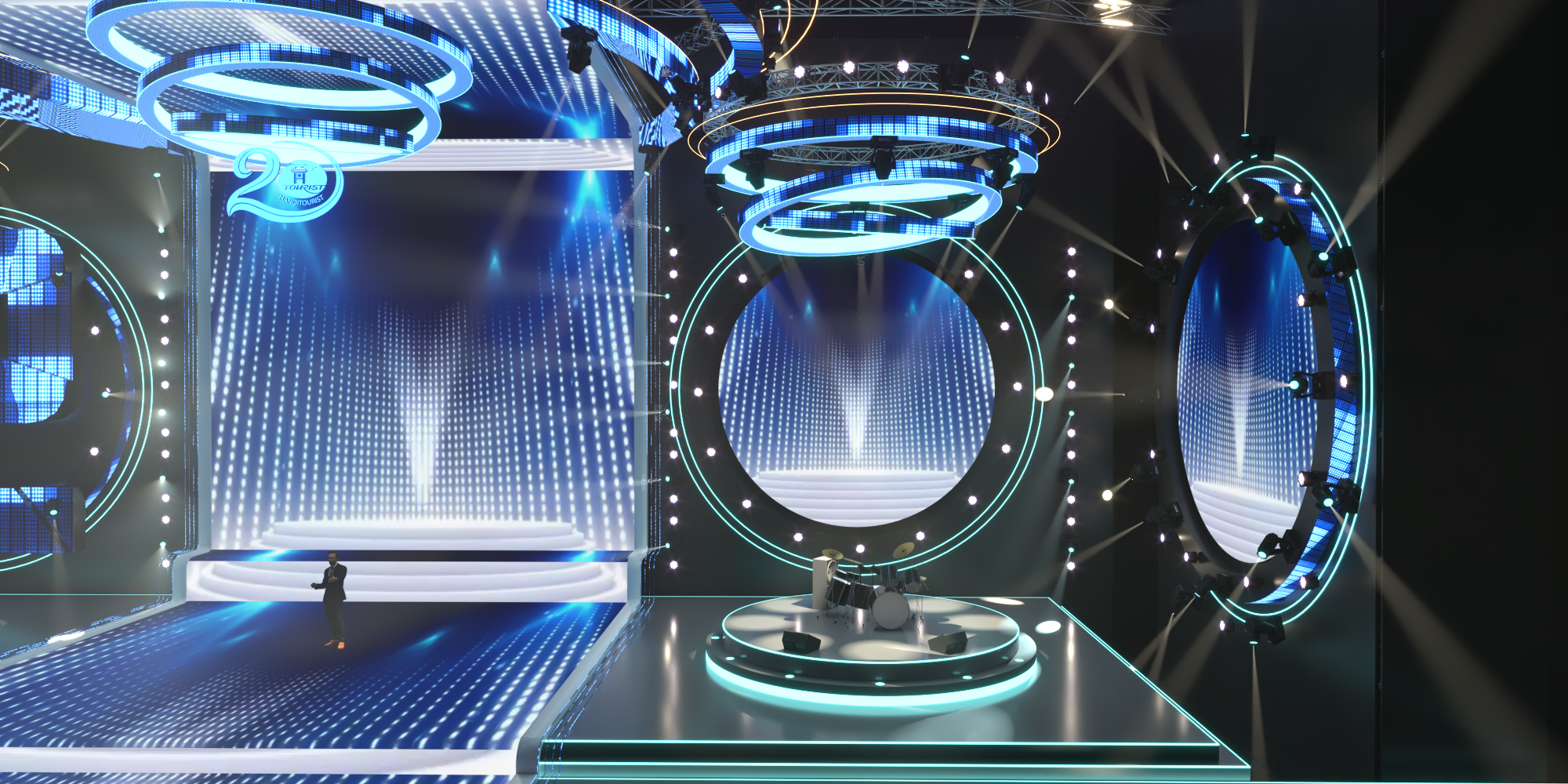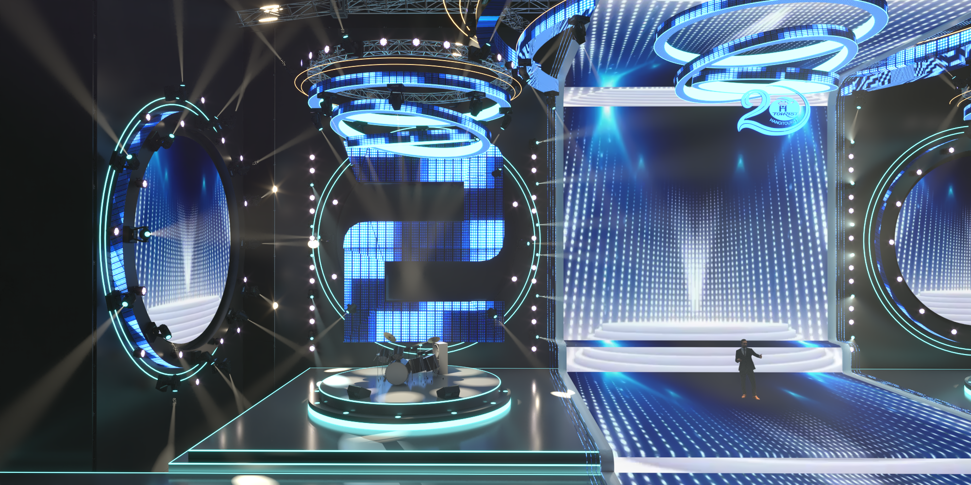 Sân khấu nhạc đếm ngược, ánh sáng, tráng lệ, trình diễn, đèn LED neon. Sân khấu nhạc đếm ngược là một thiết lập ấn tượng và thú vị thường được sử dụng để tạo sự mong chờ cho một sự kiện hoặc buổi biểu diễn. Dưới đây là mô tả về hình ảnh và âm thanh của nó: