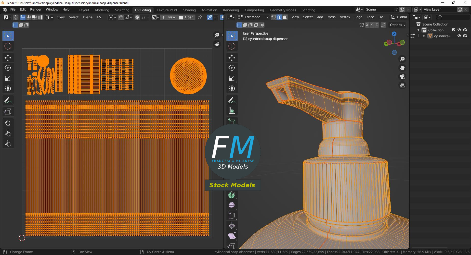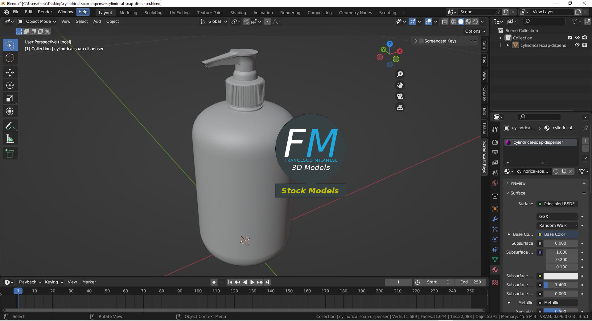 Cylindrical soap dispenser 3D Model. Production-ready 3D Model, with PBR materials, textures, non overlapping UV Layout map provided in the package.