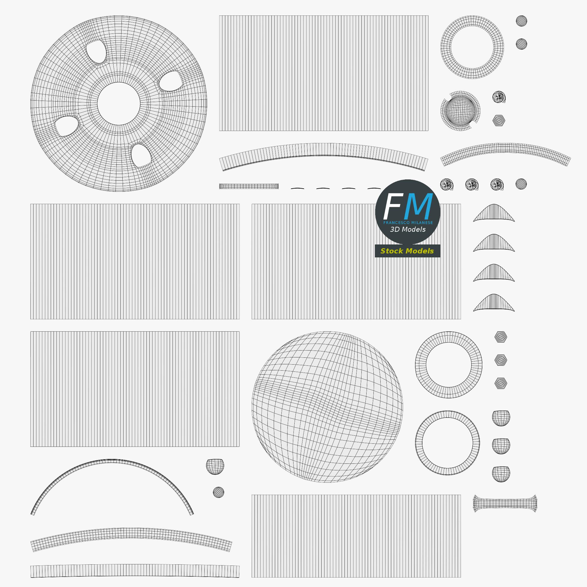 Easily customizable: UV unwrapped geometries; UV Layout maps provided in the package as png with alpha images.