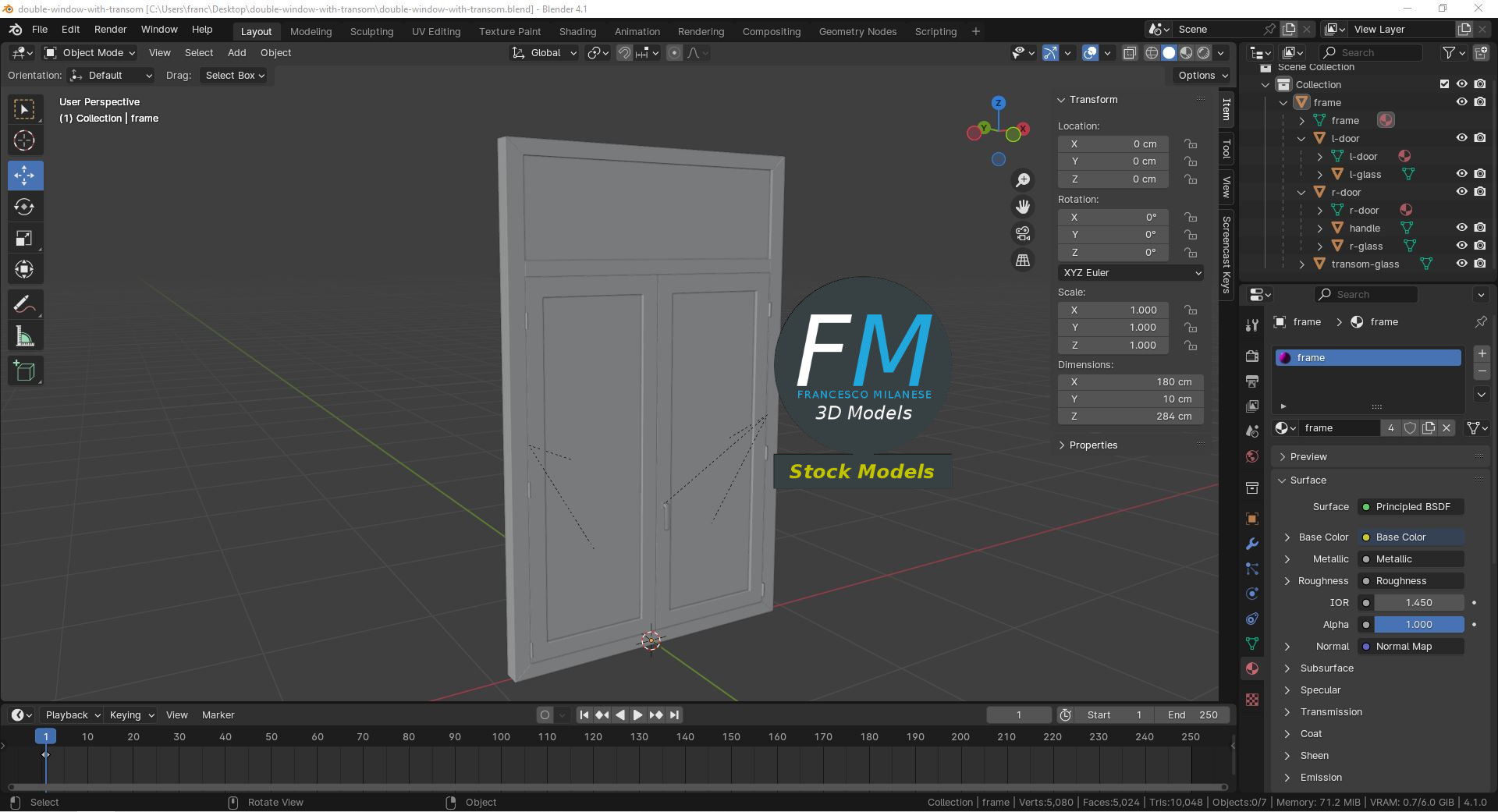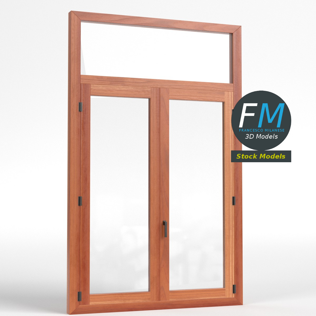 Double window with transom 3D Model. 7 individual objects (frame, 2 doors, 2 door glasses, 1 transom glass, 1 handle), sharing 2 non overlapping UV Layout maps, Materials (frame, glass) and PBR Textures sets. Production-ready 3D Model, with PBR materials, textures, non overlapping UV Layout map provided in the package.