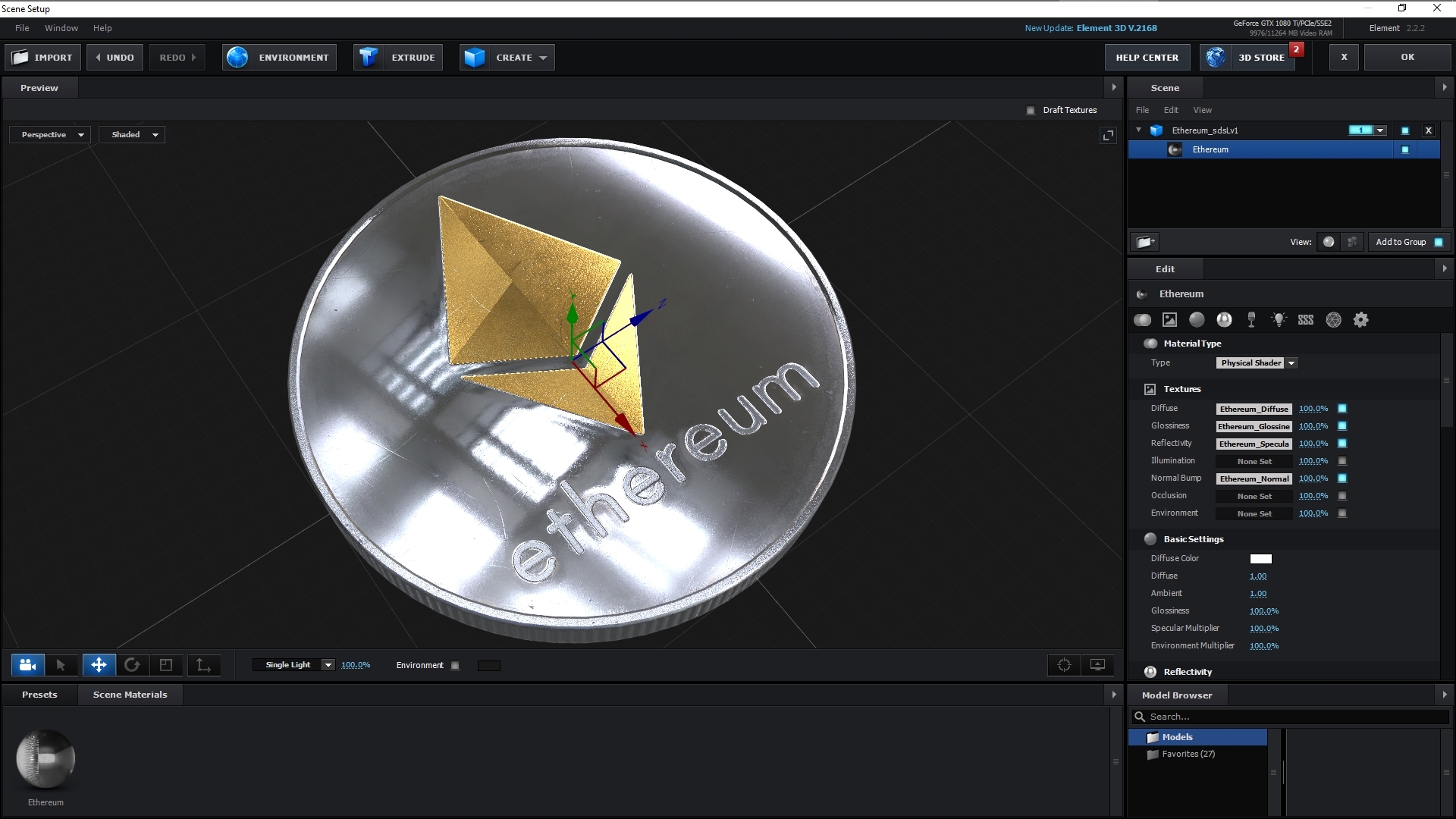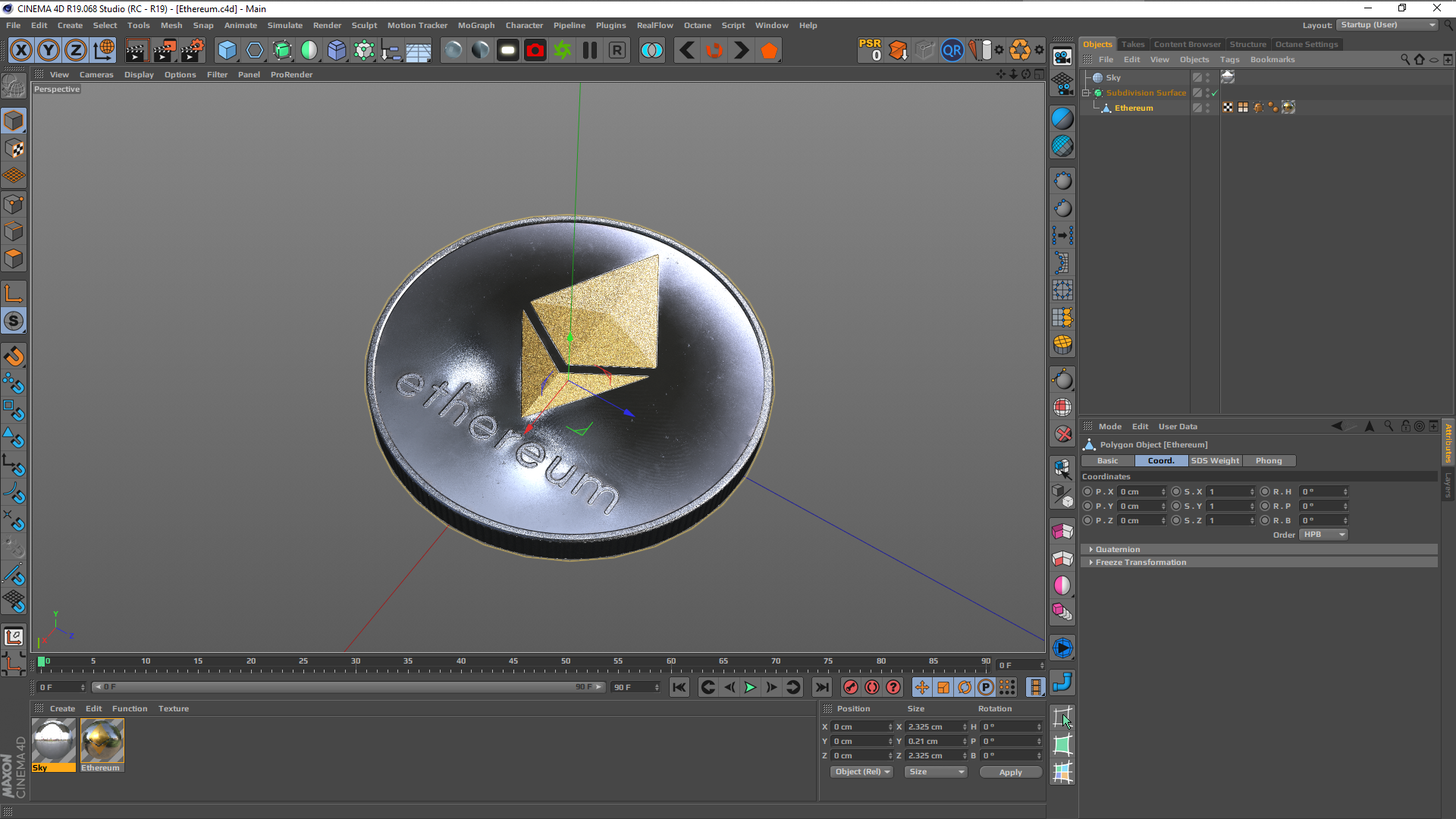 All preview images rendered with Octane Render. Plus a few screenshots of the model in the viewports of Cinema 4D, Substance Painter, Unreal Engine, and Element 3D. Enviroments and lighting setups are not included. The model is a flat coin, all detail comes from the textures (mainly DIsplacement/Height/Normal). Both faces of the coin are identical (to leverage higher texture resolution). The textures have the Ethereum symbol in gold, desaturate to make it silver.