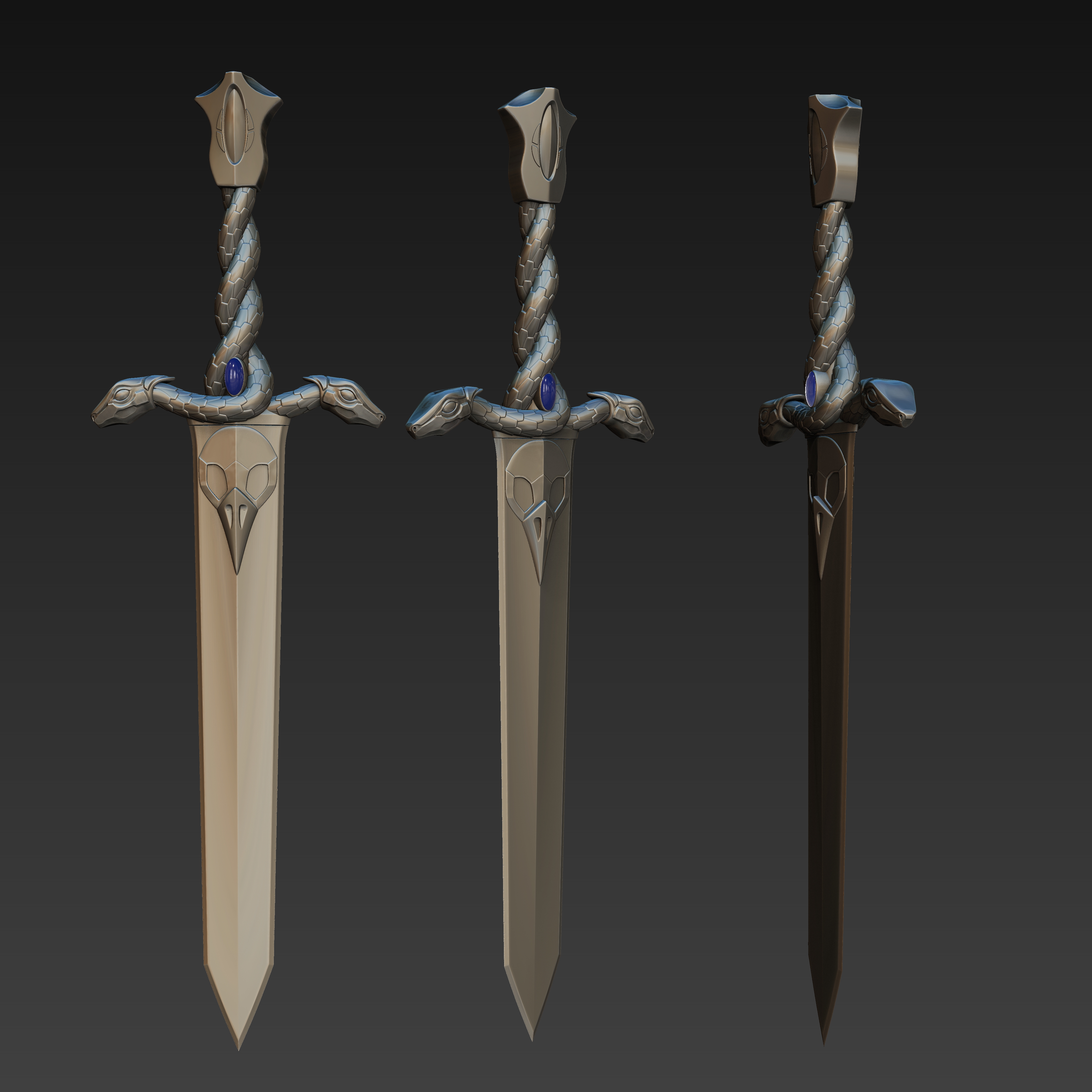 The dagger of the Dark Wanderer character from Identity V for 3D printing consists of four parts. Handle and blade (attached with a pin), snake heads (attached with pins), stone (attached with glue).