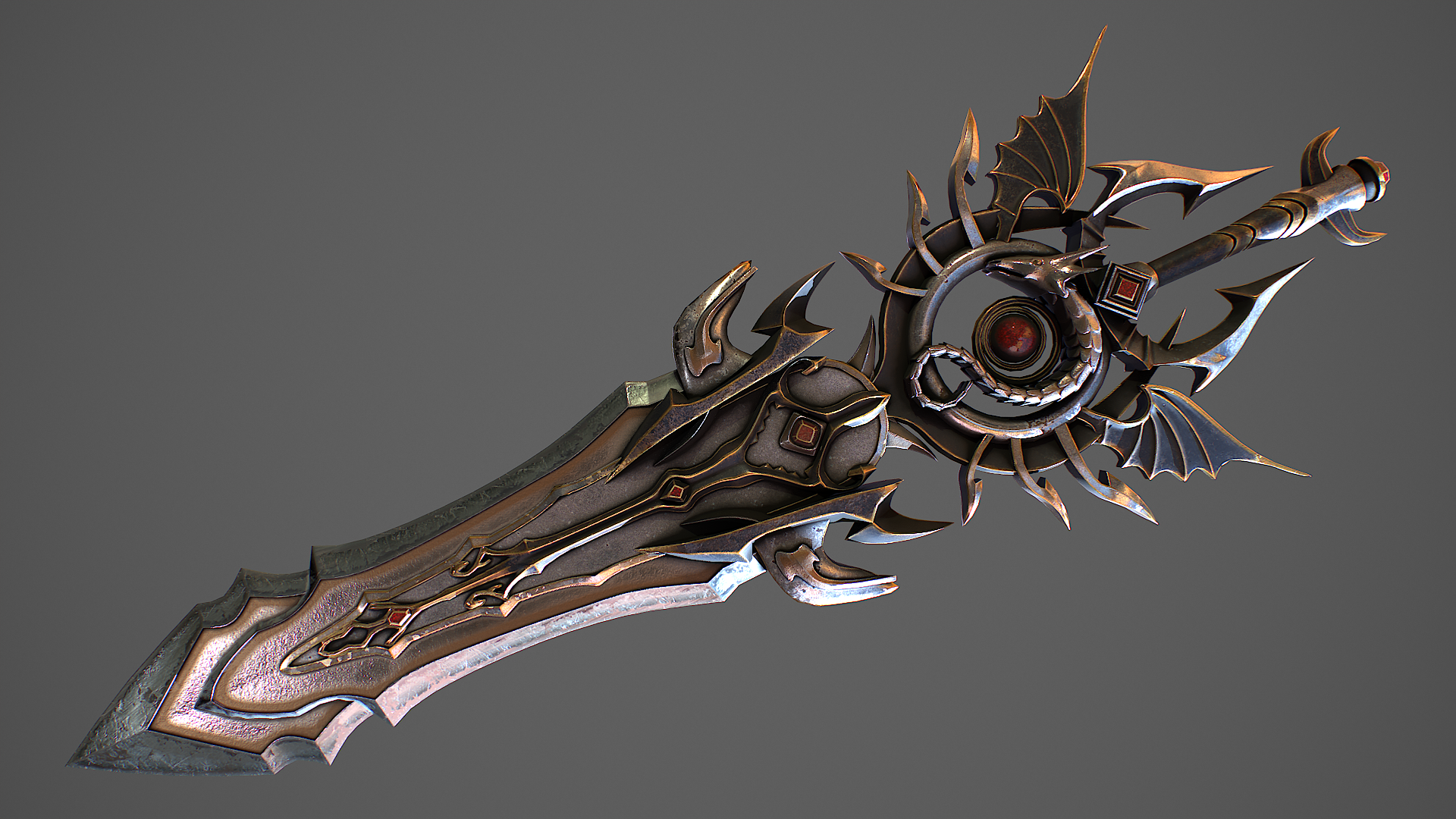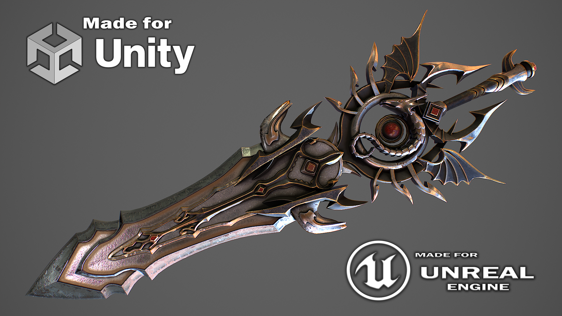 Hello. This is a high definition quality polygon of a Fantasy sword 11 3D Model with PBR textures. Extremely detailed and realistic. Suitable for movie prop, architectural visualizations, advertising renders and other. The archive includes Obj and FBX, Marmoset scene, textures for the Unity: Base color, Height, Metallic, Mixed AO, Normal_OpenGL, Roughness. And also included in the archive textures for UE: BaseColor, Normal, OcclusionRoughnessMetallic. All textures are 4k resolution. The number of materials corresponds to the number of main objects in the scene. The model contains 1 object: Fantasy sword 11