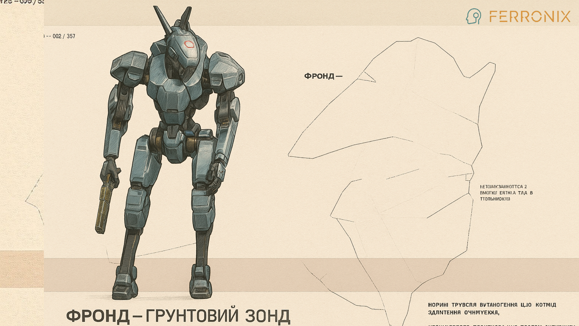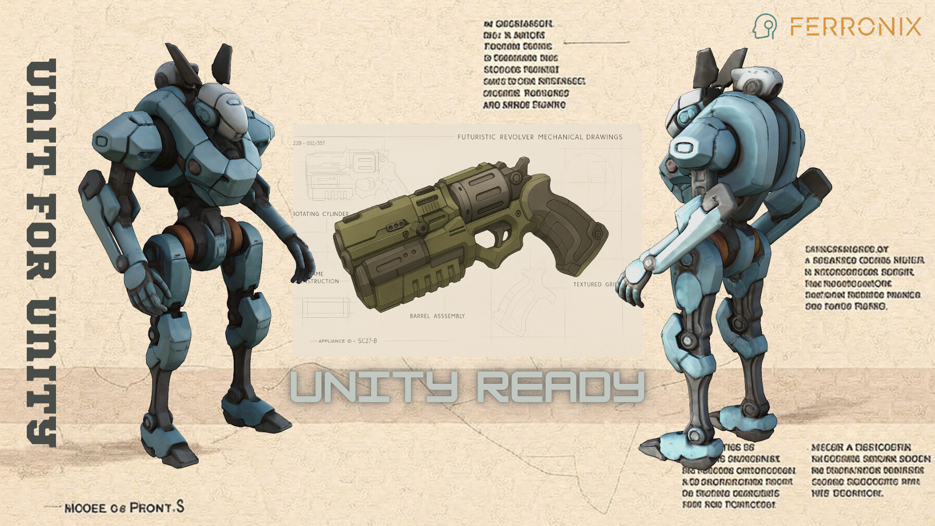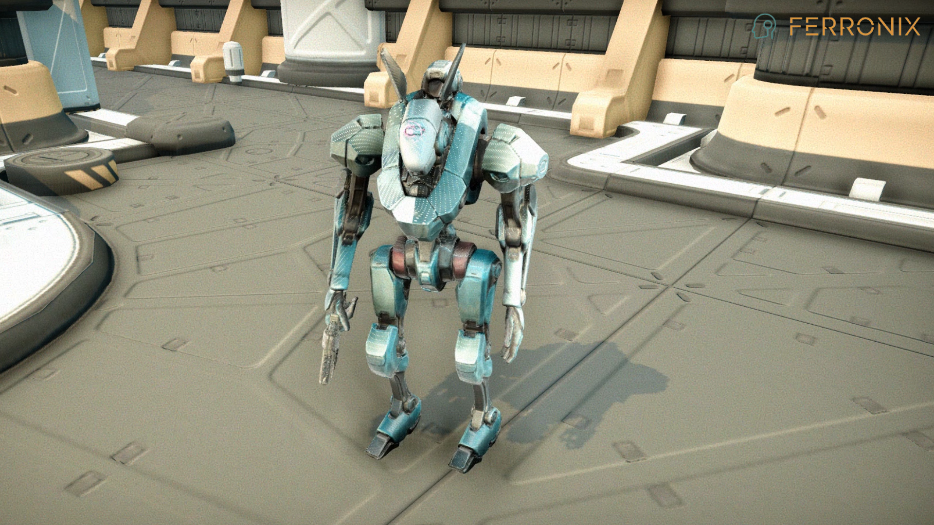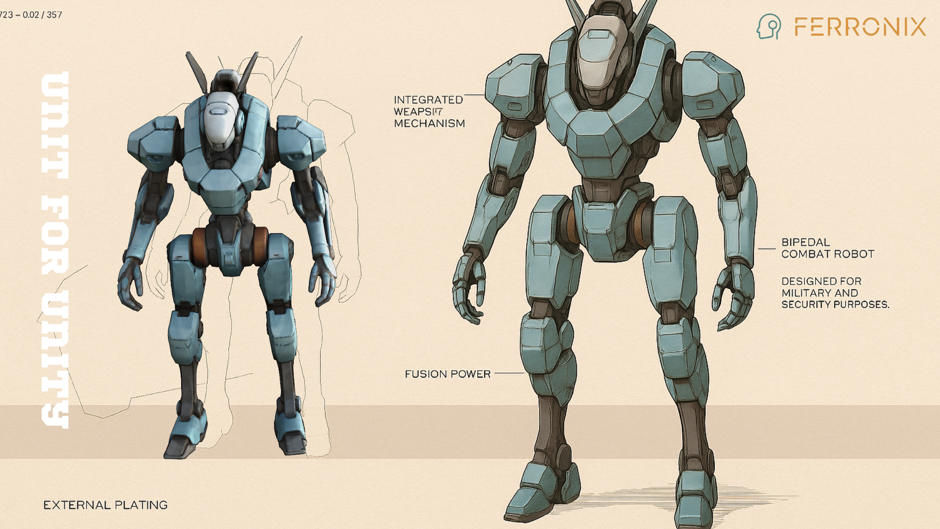 Ferronix is a towering mech forged from dense alloy plating, with angular shoulders and reinforced hydraulics. Its form exudes unstoppable weight — every step lands like a hammer blow. In its right hand, it wields a heavy particle blaster, shaped like an oversized pistol, designed to deliver crushing volleys of kinetic firepower. Short Lore