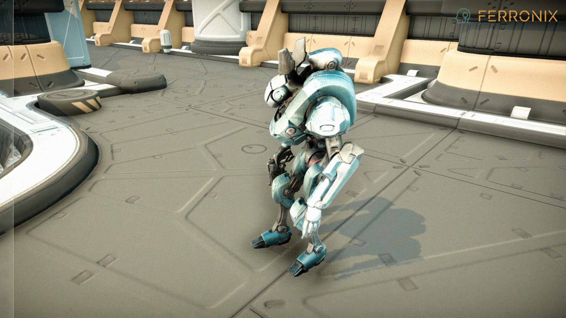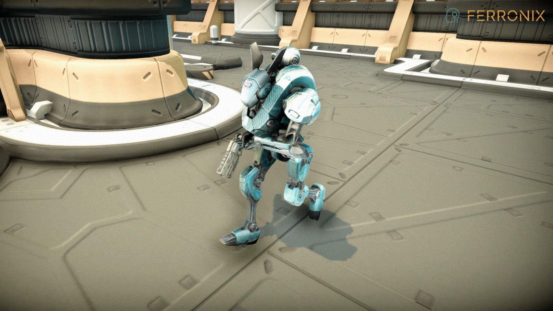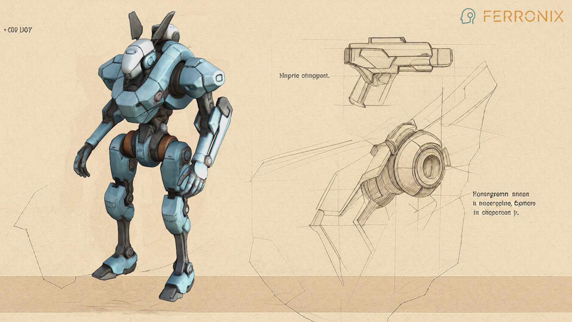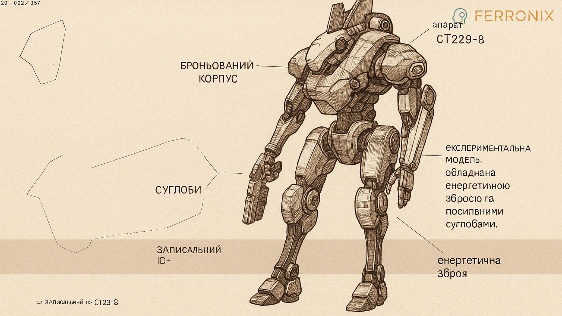 Ferronix is a towering mech forged from dense alloy plating, with angular shoulders and reinforced hydraulics. Its form exudes unstoppable weight — every step lands like a hammer blow. In its right hand, it wields a heavy particle blaster, shaped like an oversized pistol, designed to deliver crushing volleys of kinetic firepower. Short Lore