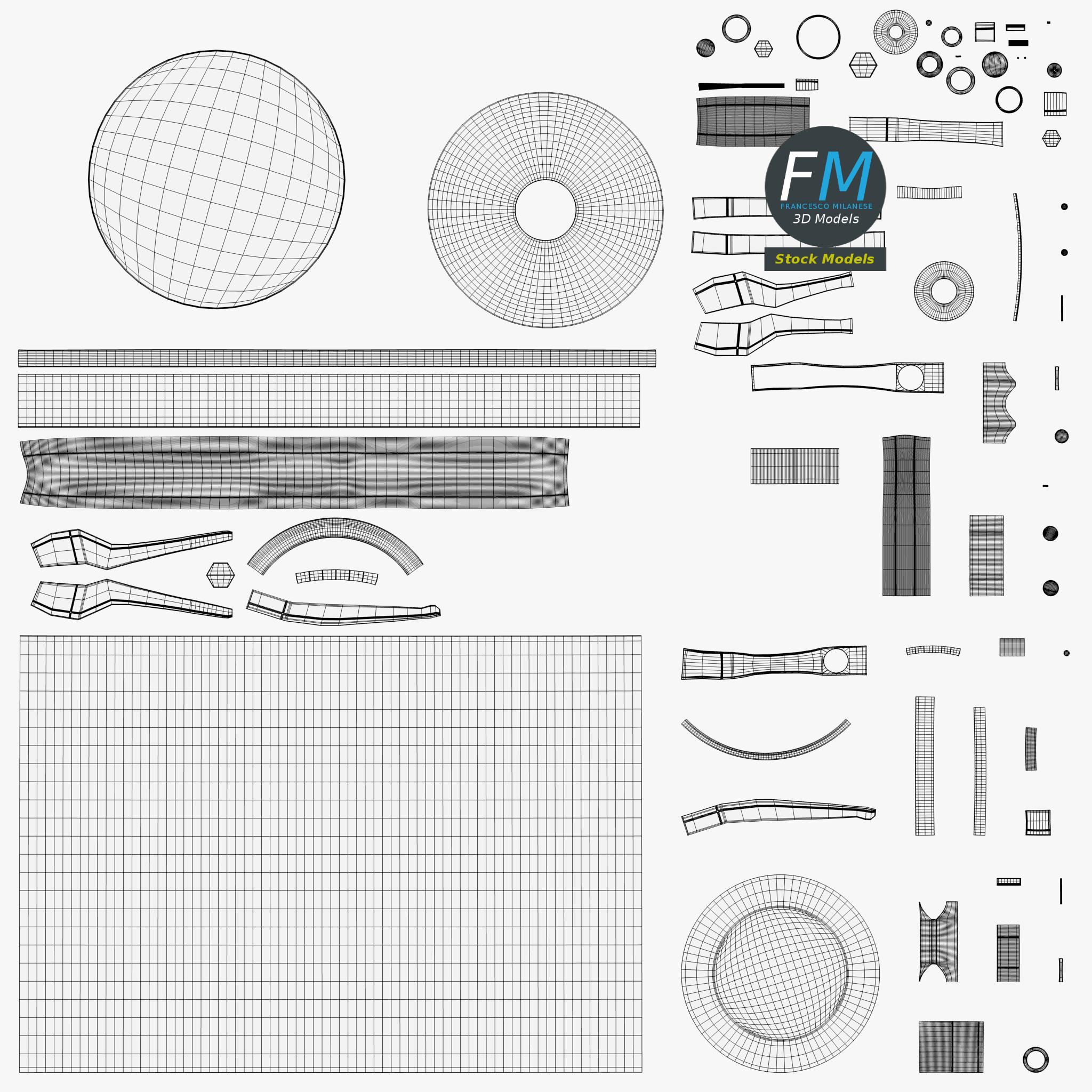 Easily customizable: UV unwrapped geometries, so you can create new Textures (or modify the existing ones) using the UV Layout maps provided in the package (as png with alpha).