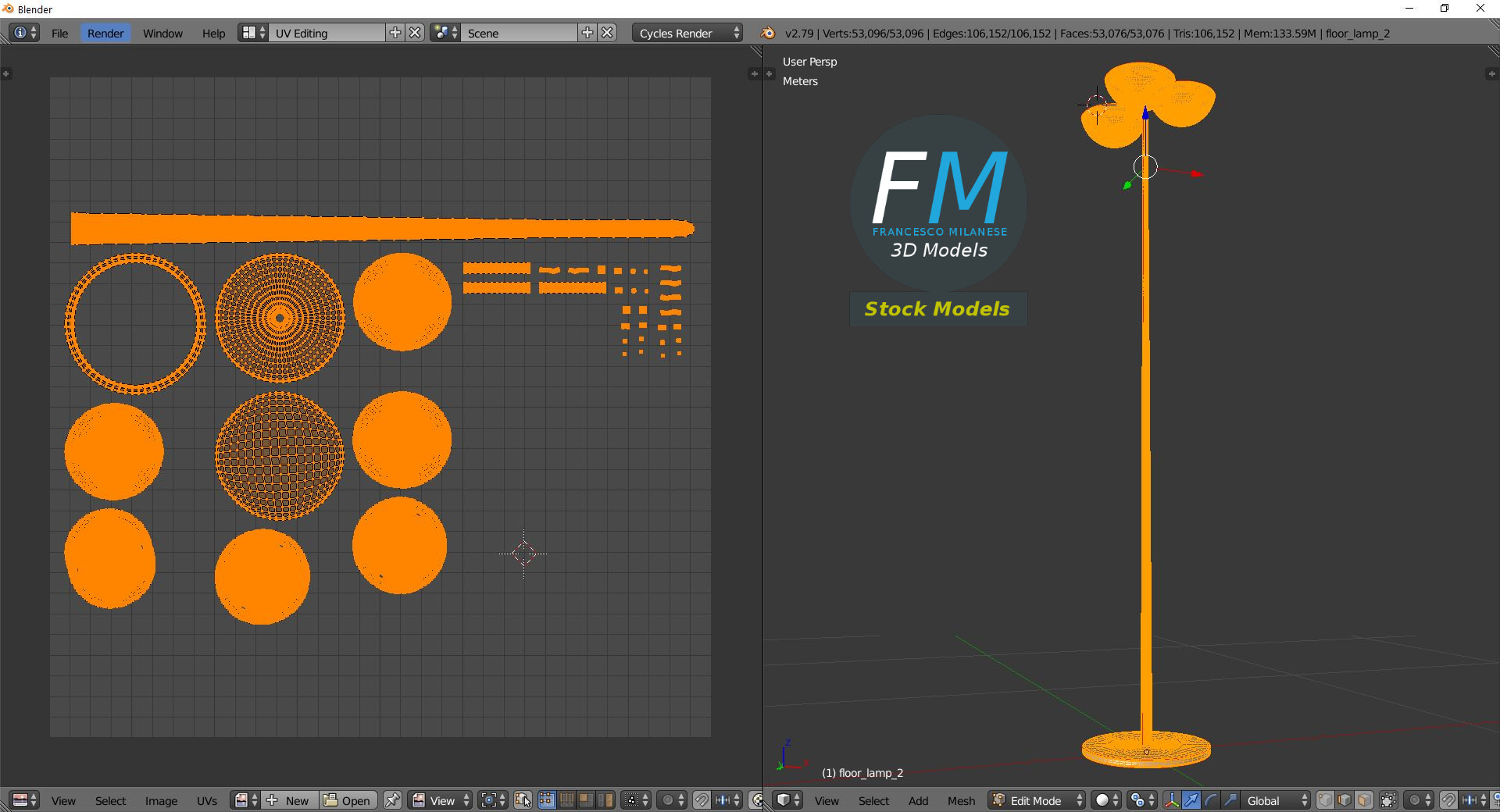 Floor lamp 3D Model, nr. 2 in my collection. 2 individual objects (frame, emitting tubes), each one with its own non overlapping UV Layout map, Materials and PBR Textures set (so, you can easily assign an emitting or glowing material to the tubes). Production-ready 3D Model, with PBR materials, textures, non overlapping UV Layout map provided in the package.
