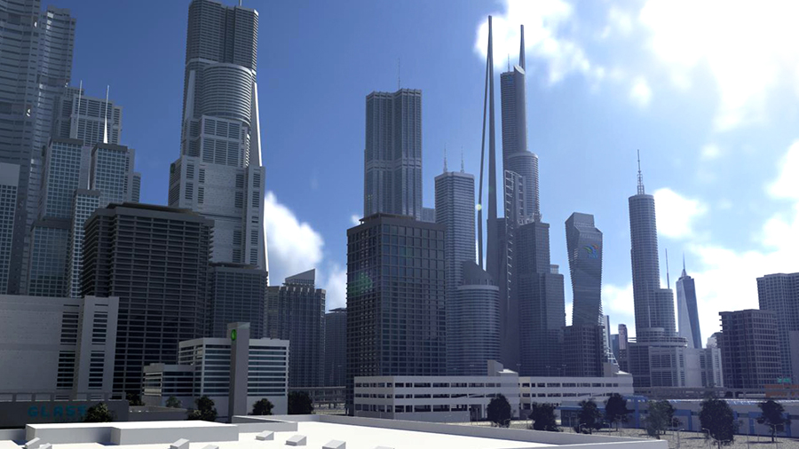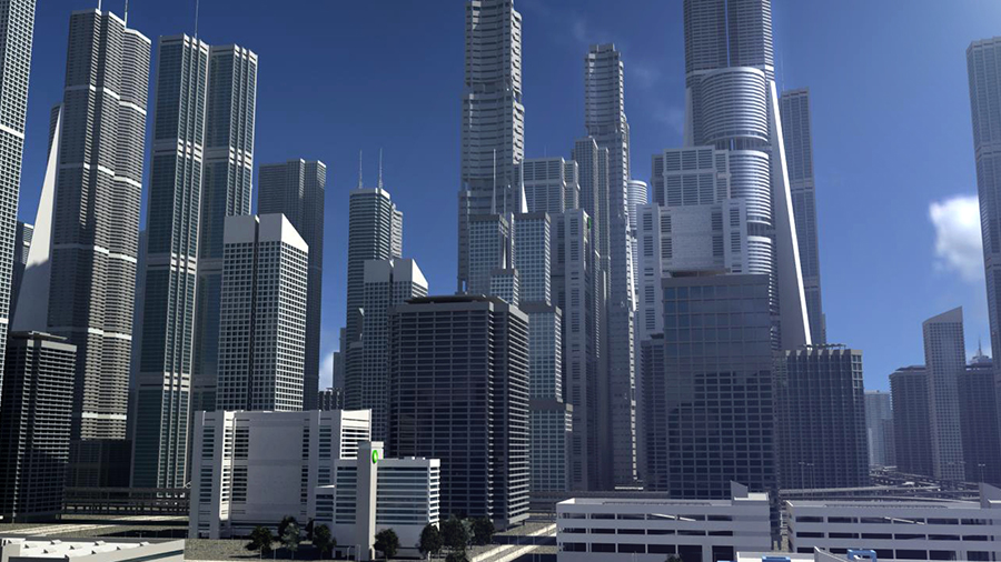 A 3D Freeway in a city environment with a sun light and 4k HDRI environment with built in glow lighting in the scene. This scene is Rendered with Mental Ray and has assigned shaders with textures.