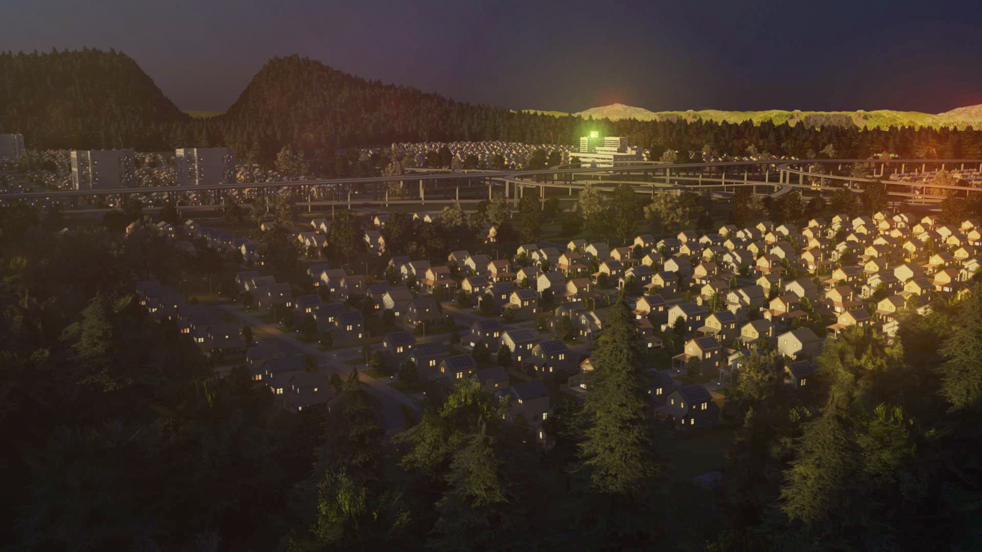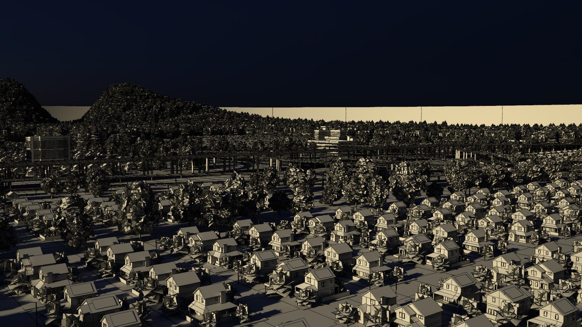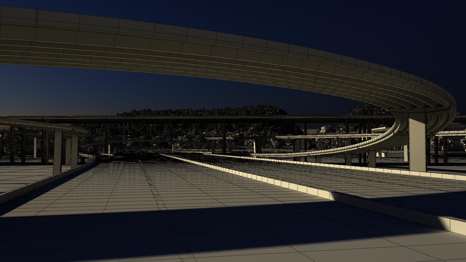 Freeway in a suburb environment with sun and sky light and HDRI rendered with Mental Ray with assigned shaders with textures. With built in Glow lighting in the scene.