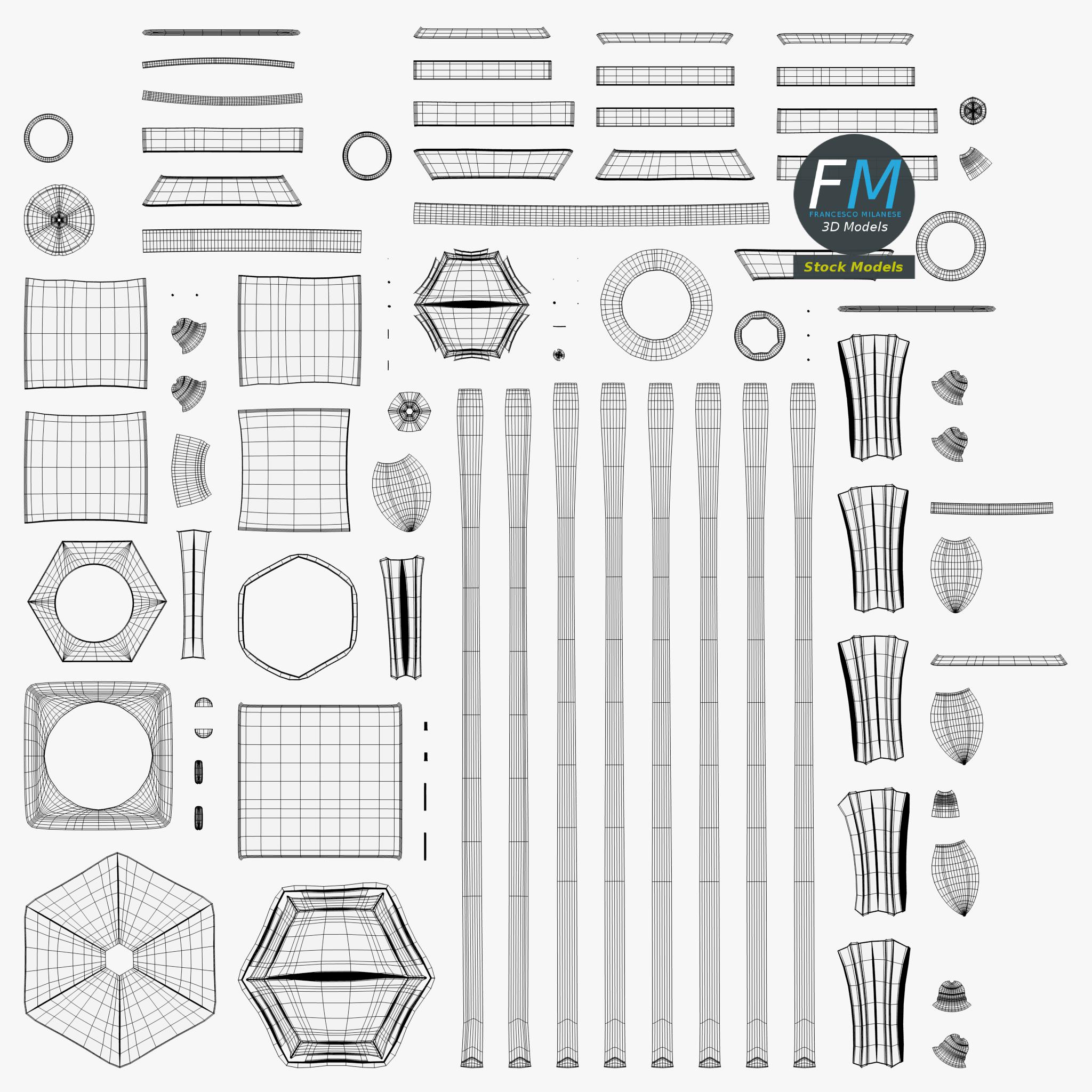 Easily customizable: UV unwrapped geometries, so you can create new Textures (or modify the existing ones) using the UV Layout maps provided in the package (as png with alpha).