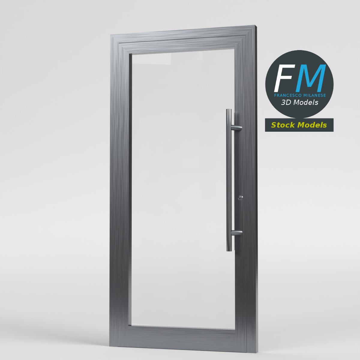 A modern frameless-style glass door with a brushed metal frame and sleek vertical pull handles 3D Model, ideal for contemporary interior or commercial environments. 3 objects (frame, door, glass; so, you can easily open or close the door, as shown in the preview images), sharing 2 Materials (metal, glass), each one with its own non overlapping UV Layout map and PBR Textures set. Production-ready 3D Model with non overlapping UV Layout map provided in the package. PBR Materials and Textures (Metallic Workflow: Base Color, Metallic, Roughness, Normal) embedded in the Blend, FBX, and GLB files.