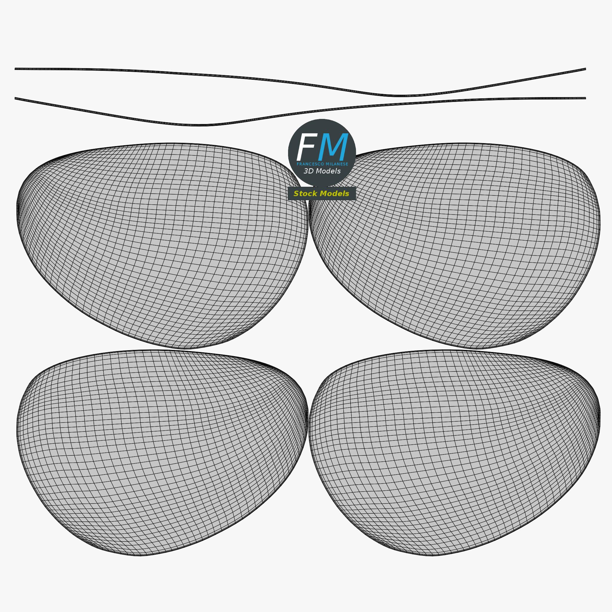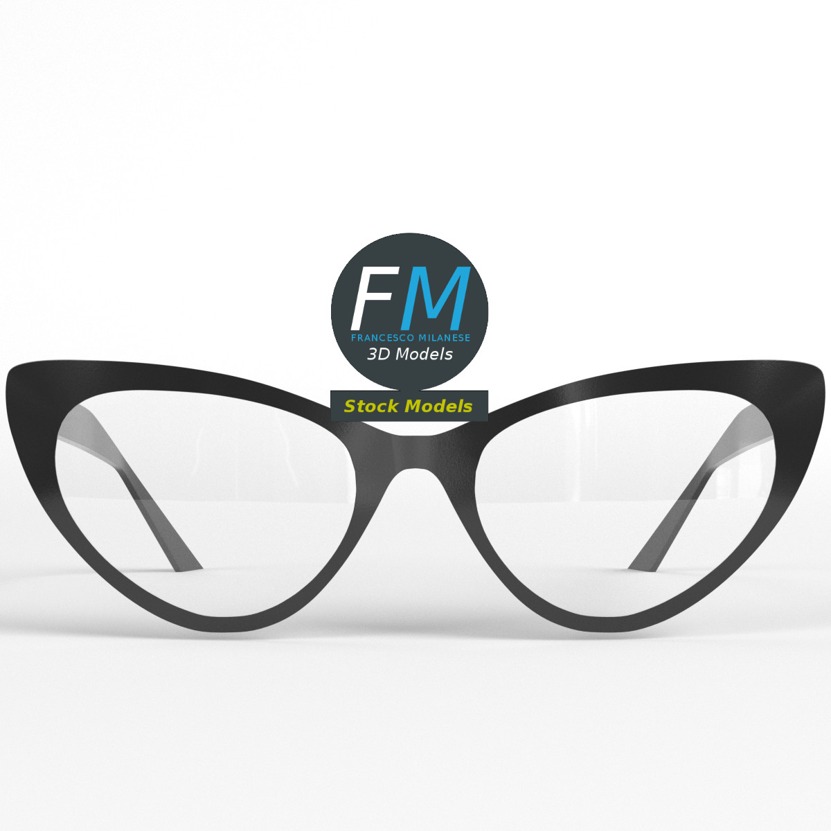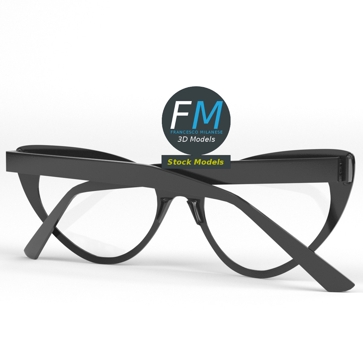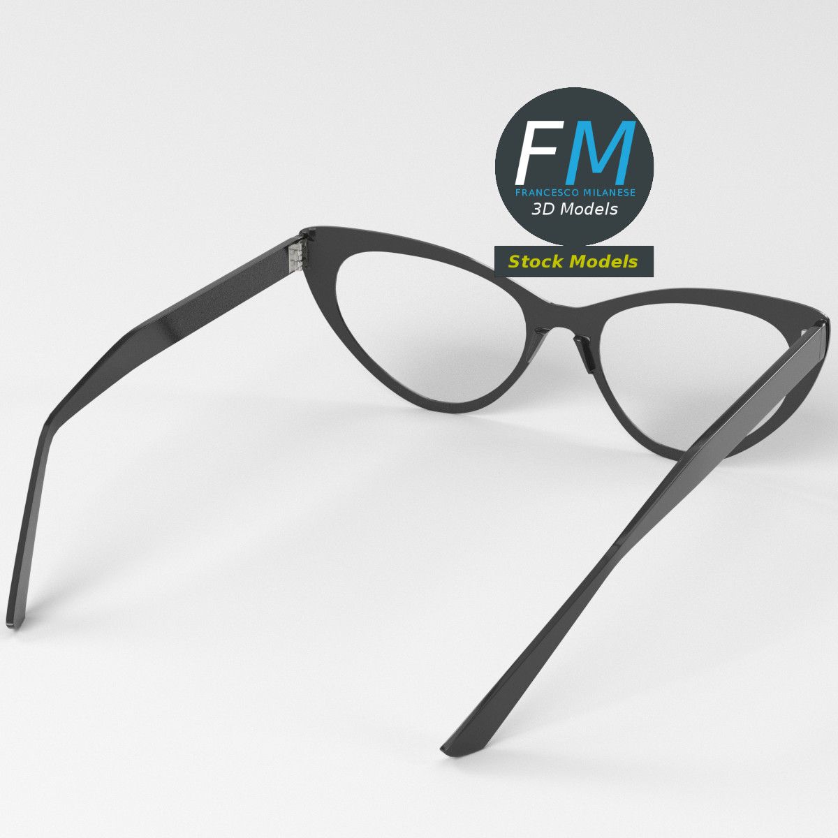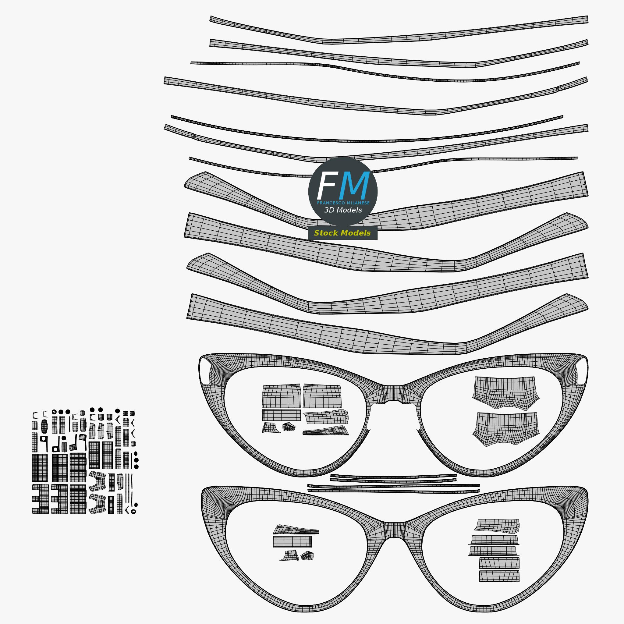 Cat-eye type eyeglasses 3D Model. 4 individual objects (2 temples, 1 frame, 1 lenses objects; so, you can easily rotate or even animate them), sharing 2 non overlapping UV Layout maps, Materials (lenses, frames) and PBR Textures sets. Production-ready 3D Model, with PBR materials, textures, non overlapping UV Layout map provided in the package.