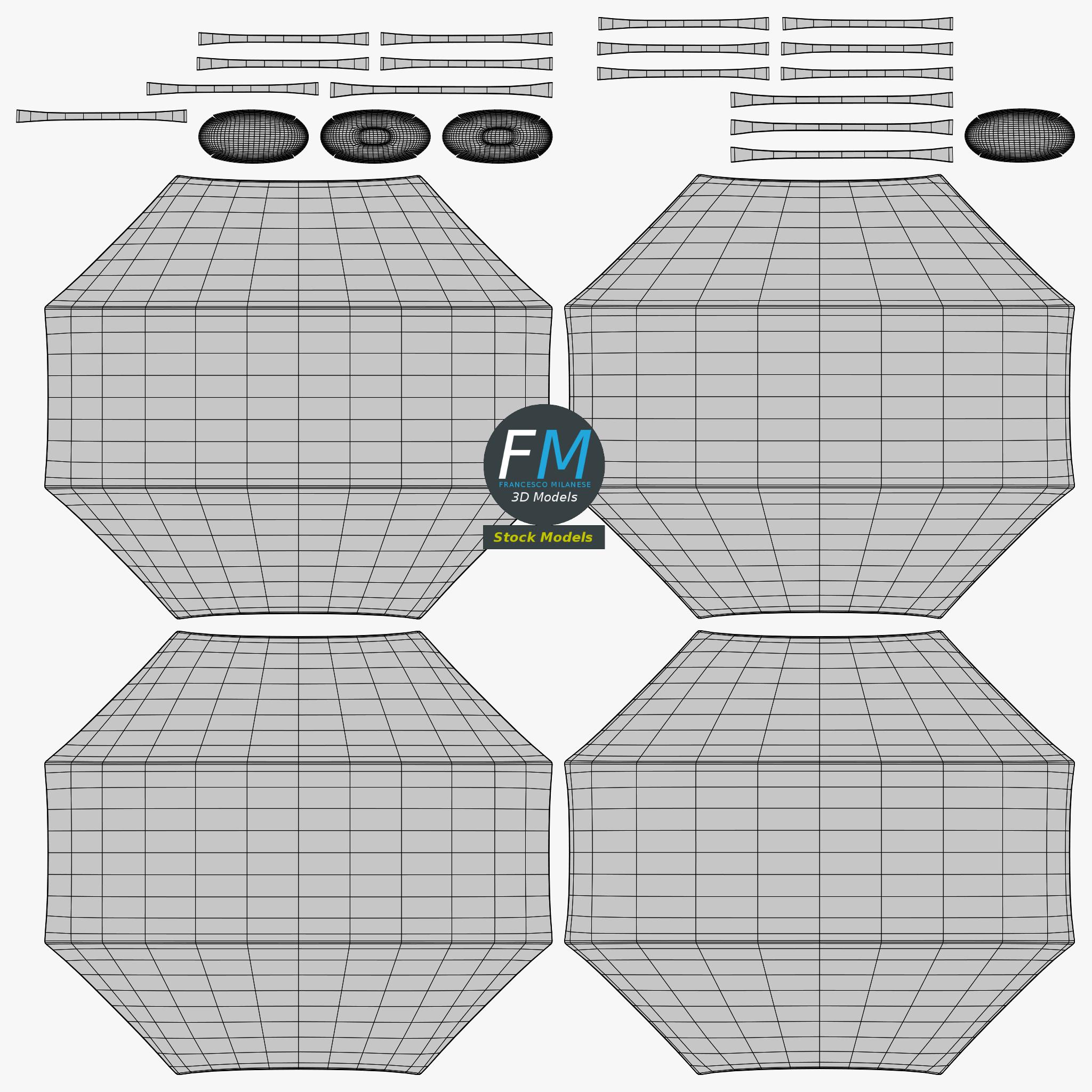 Easily customizable: UV unwrapped geometries, so you can create new Textures (or modify the existing ones) using the UV Layout maps provided in the package (as png with alpha).