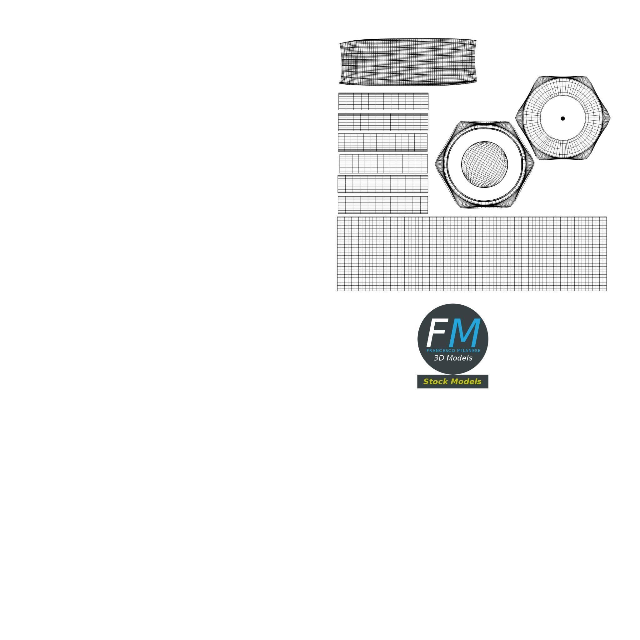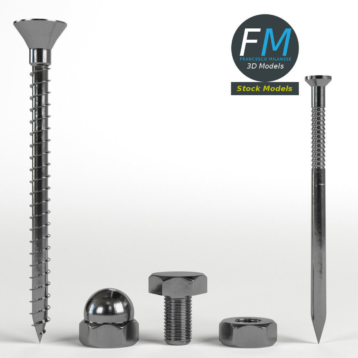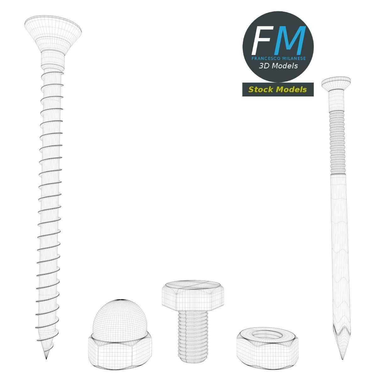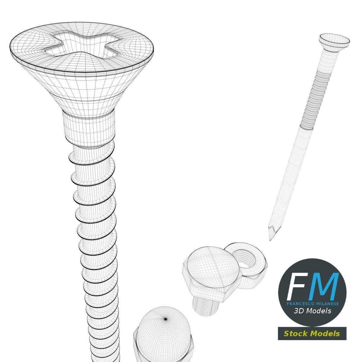 A set of 5 hardware parts: cross section screw, iron nail, hexagonal blind nut, nut, bolt; 5 objects, 1 material: the individual objects share the same non overlapping UV Layout map, Material and PBR Textures set. Production-ready 3D Model, with PBR materials, textures, and non overlapping UV Layout map provided in the package. Quads only geometries (no tris/ngons), no poles. Easily customizable: UV unwrapped geometries, so you can create new Textures (or modify the existing ones) using the UV Layout maps provided in the package (as png with alpha). Each Object, Material or Texture provided in the package has a unique, meaningful name. PBR Textures files are included in a subfolder in the BLEND archive, along with scene files. Made in Blender 3D 2.79 (Cycles materials) then exported to OBJ and FBX; materials and textures made in Substance Painter, exported for PBR, V-Ray, Unity, Unreal. PROMO IMAGES: the first image has been rendered in Cycles for Blender 3D 2.7x; in particular, you can find 11+ promo images in this description: