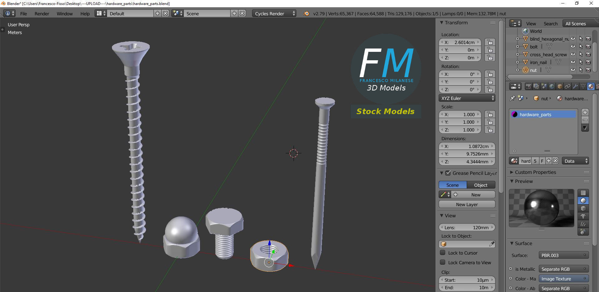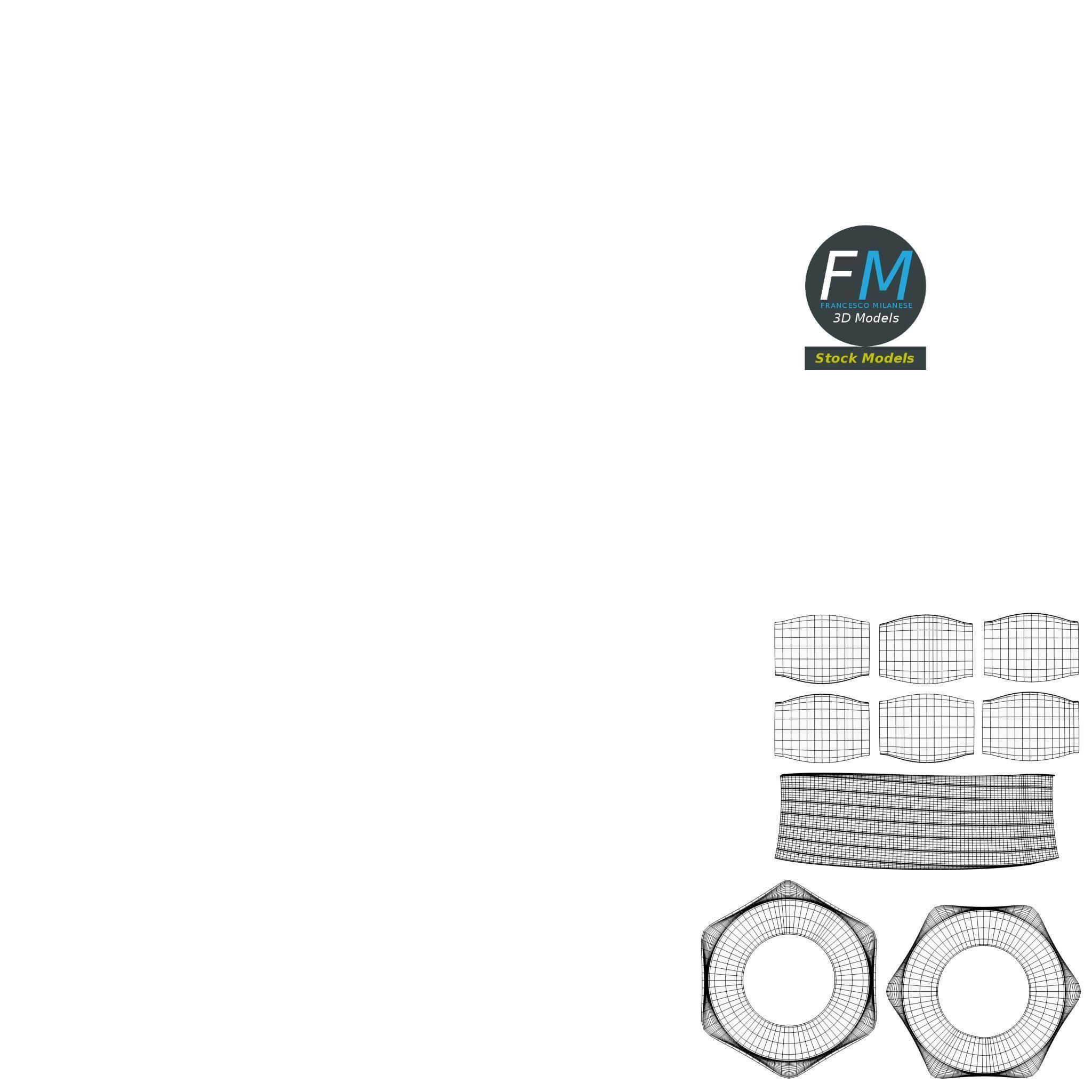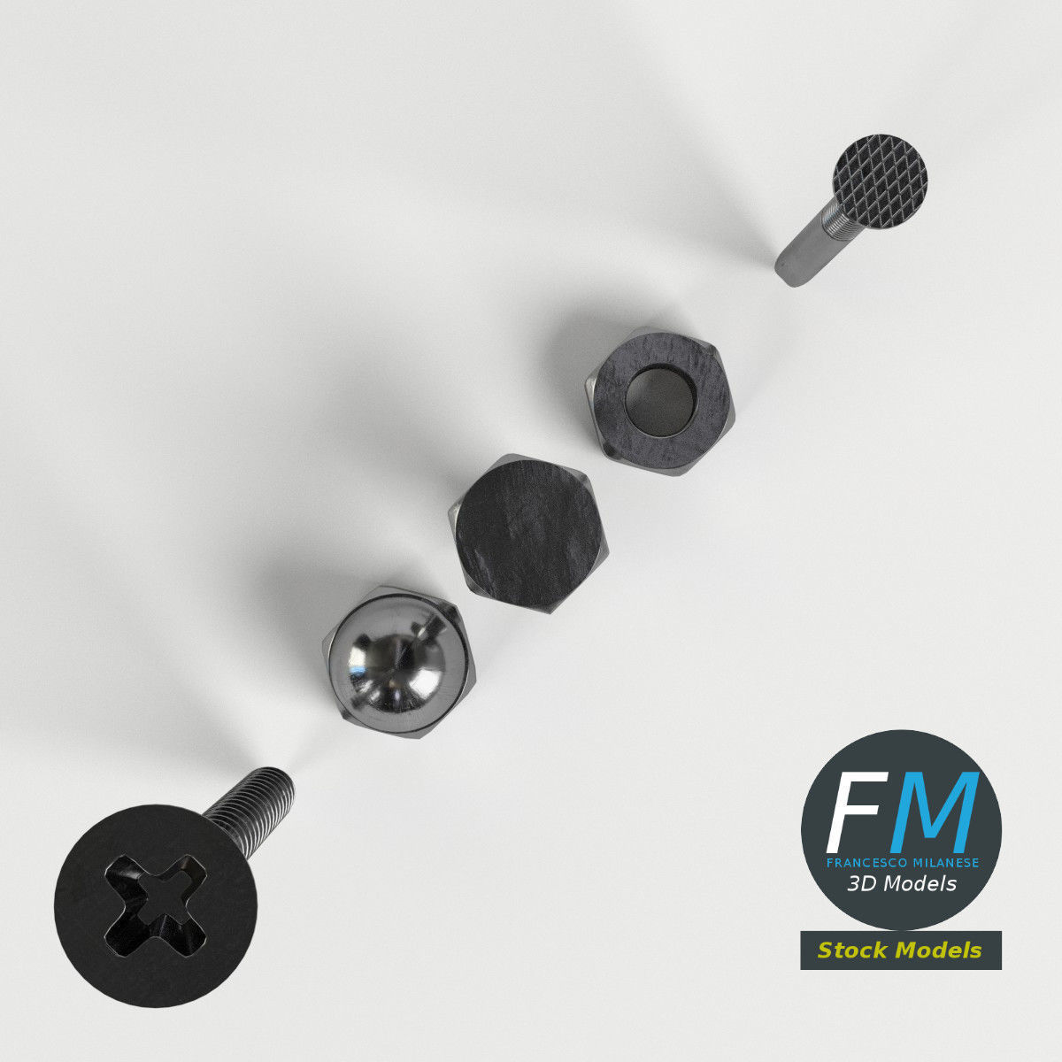 A set of 5 hardware parts: cross section screw, iron nail, hexagonal blind nut, nut, bolt; 5 objects, 1 material: the individual objects share the same non overlapping UV Layout map, Material and PBR Textures set. Production-ready 3D Model, with PBR materials, textures, and non overlapping UV Layout map provided in the package. Quads only geometries (no tris/ngons), no poles. Easily customizable: UV unwrapped geometries, so you can create new Textures (or modify the existing ones) using the UV Layout maps provided in the package (as png with alpha). Each Object, Material or Texture provided in the package has a unique, meaningful name. PBR Textures files are included in a subfolder in the BLEND archive, along with scene files. Made in Blender 3D 2.79 (Cycles materials) then exported to OBJ and FBX; materials and textures made in Substance Painter, exported for PBR, V-Ray, Unity, Unreal. PROMO IMAGES: the first image has been rendered in Cycles for Blender 3D 2.7x; in particular, you can find 11+ promo images in this description: