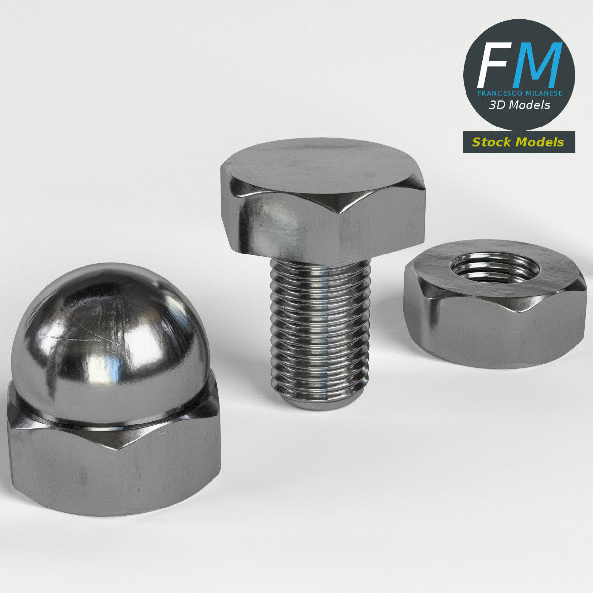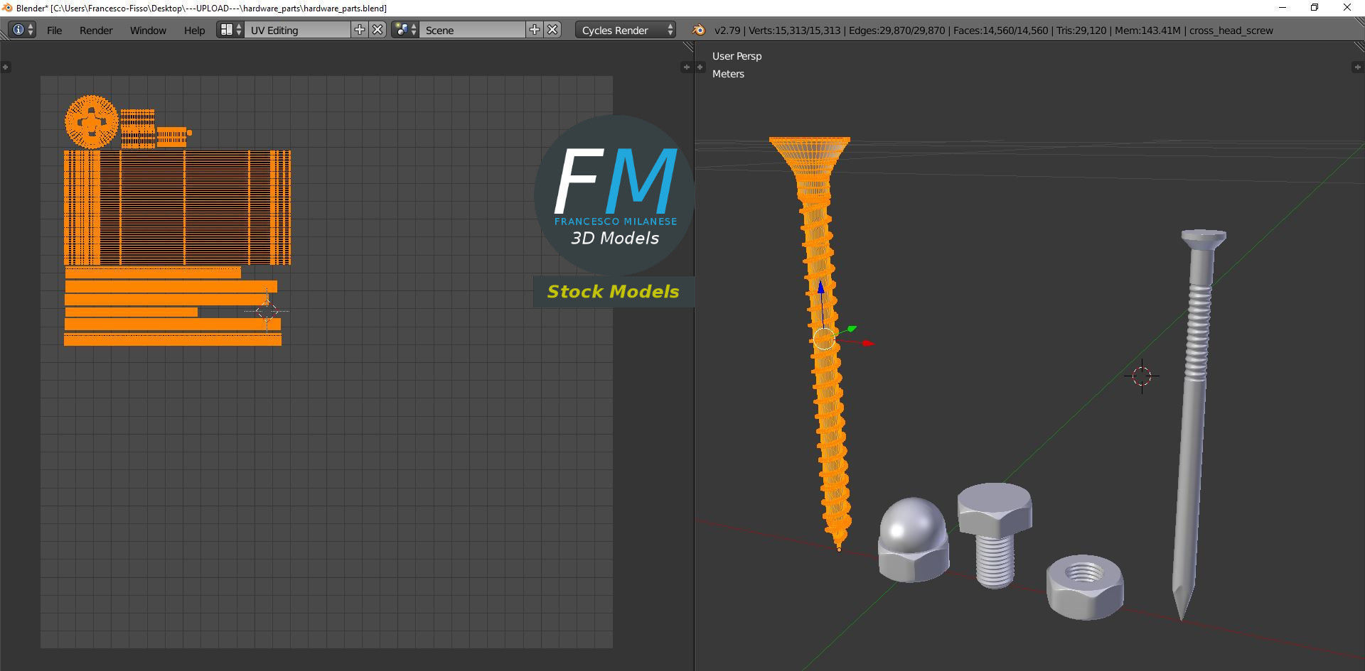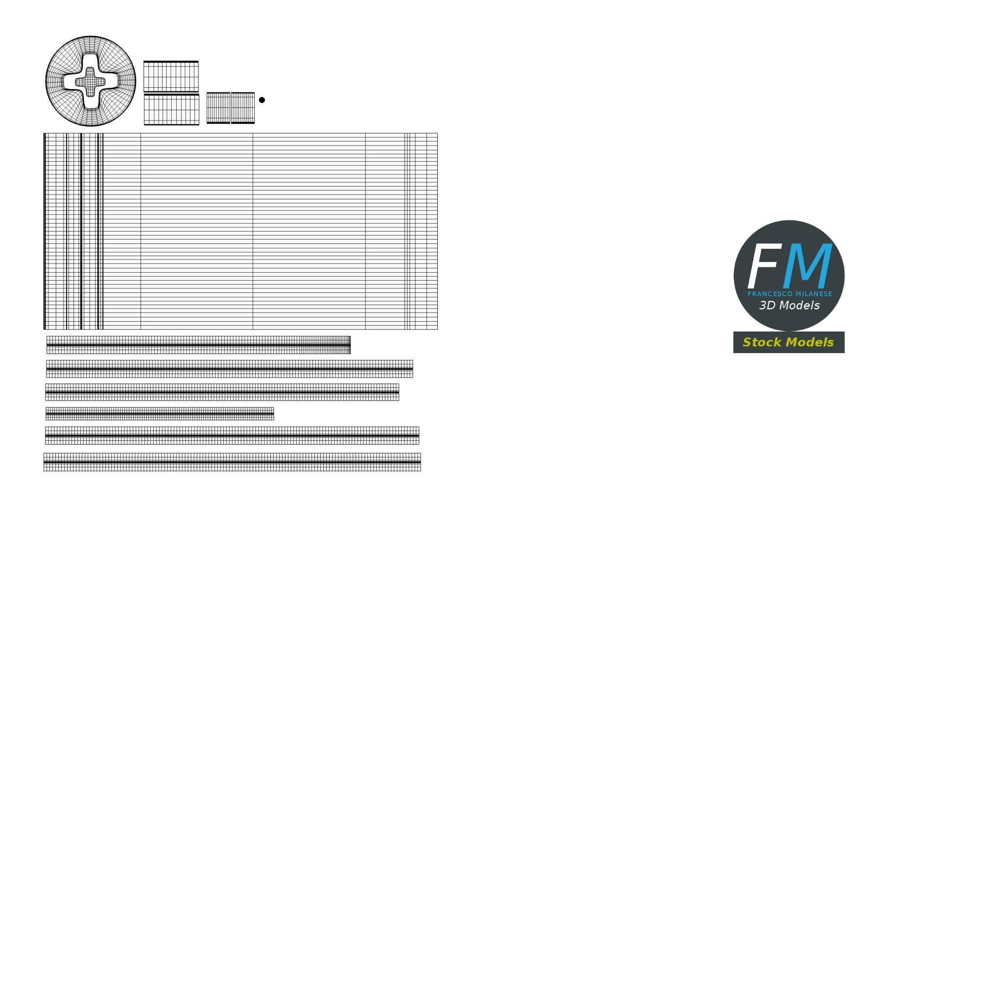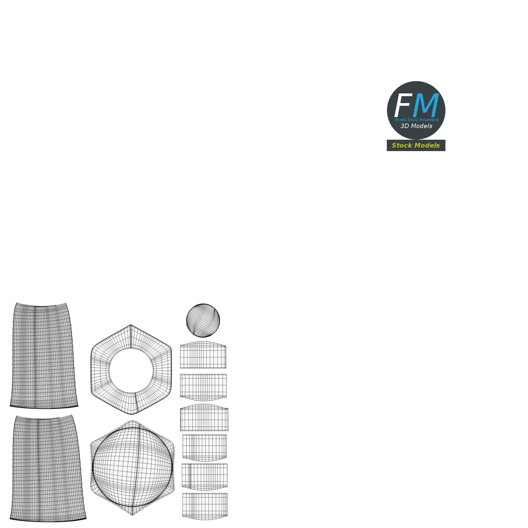 A set of 5 hardware parts: cross section screw, iron nail, hexagonal blind nut, nut, bolt; 5 objects, 1 material: the individual objects share the same non overlapping UV Layout map, Material and PBR Textures set. Production-ready 3D Model, with PBR materials, textures, and non overlapping UV Layout map provided in the package. Quads only geometries (no tris/ngons), no poles. Easily customizable: UV unwrapped geometries, so you can create new Textures (or modify the existing ones) using the UV Layout maps provided in the package (as png with alpha). Each Object, Material or Texture provided in the package has a unique, meaningful name. PBR Textures files are included in a subfolder in the BLEND archive, along with scene files. Made in Blender 3D 2.79 (Cycles materials) then exported to OBJ and FBX; materials and textures made in Substance Painter, exported for PBR, V-Ray, Unity, Unreal. PROMO IMAGES: the first image has been rendered in Cycles for Blender 3D 2.7x; in particular, you can find 11+ promo images in this description: