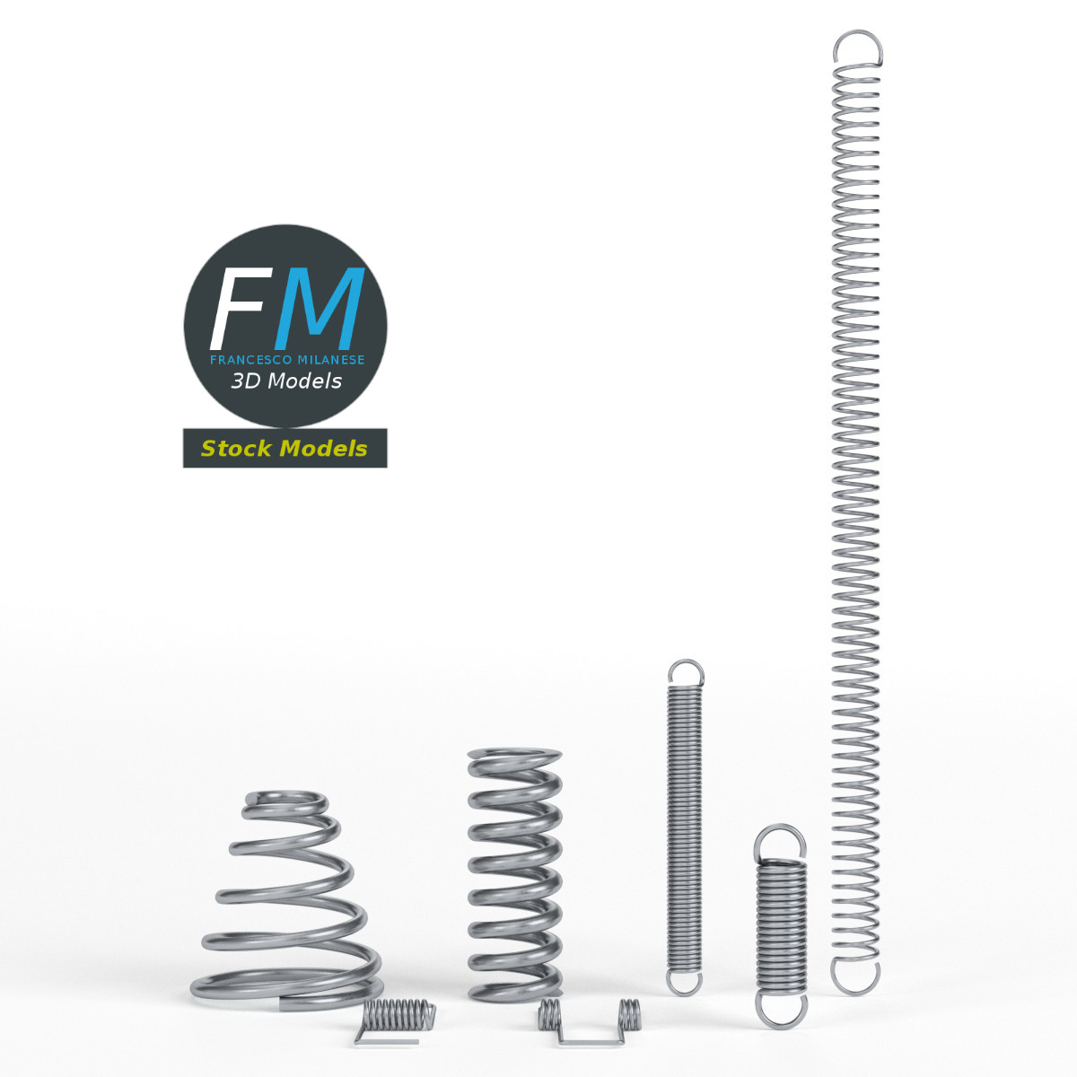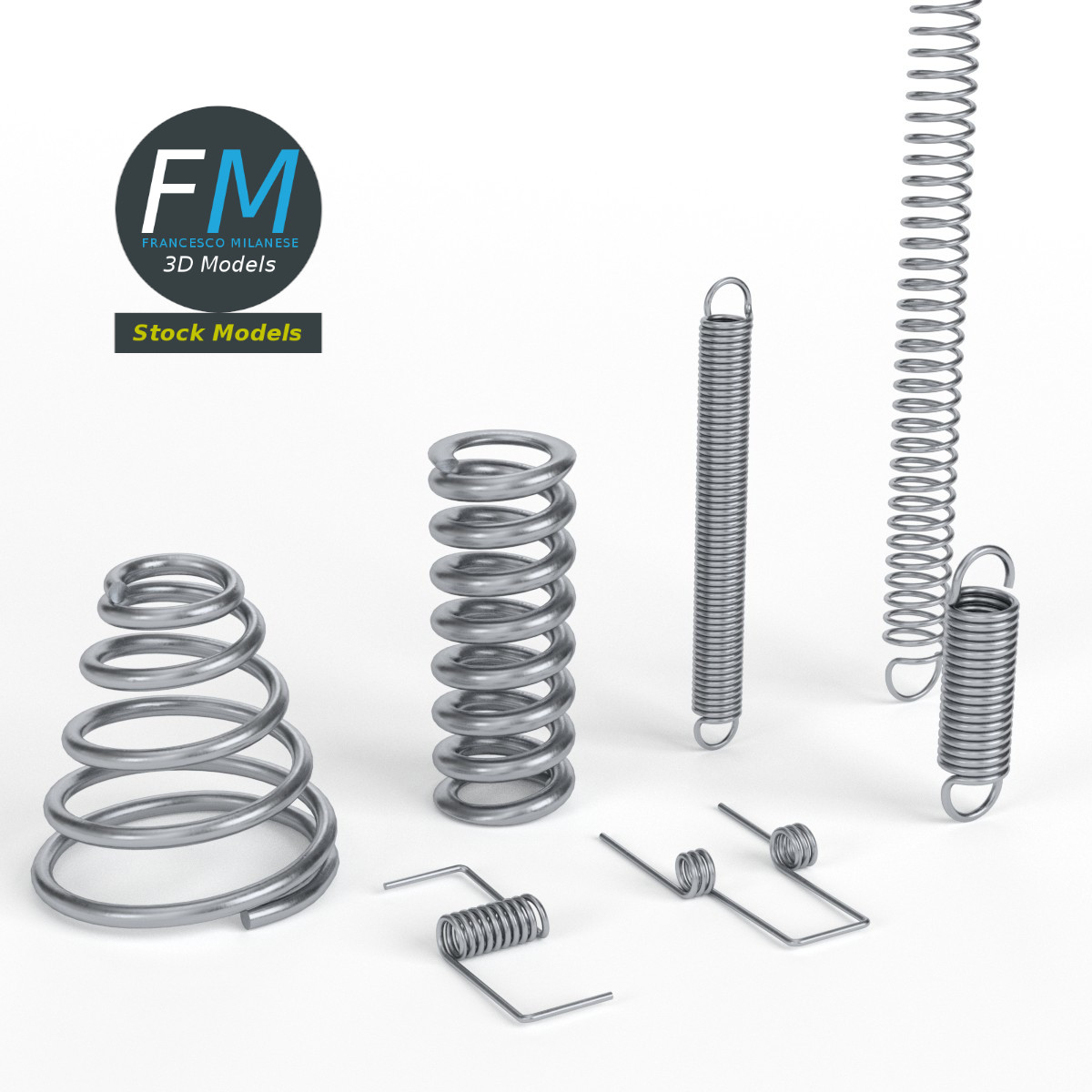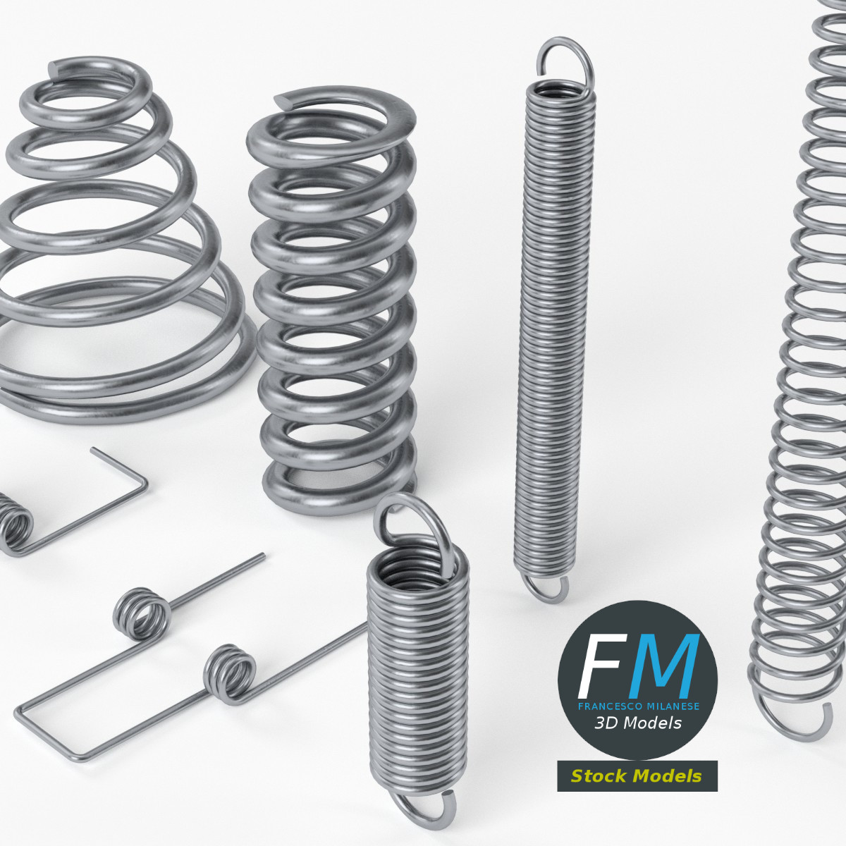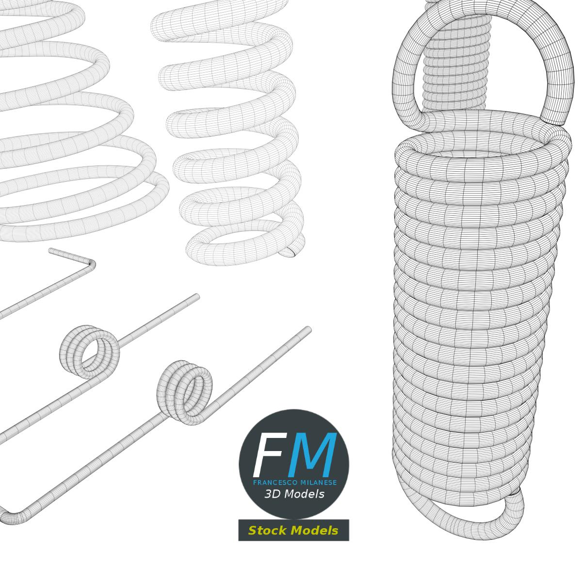 Hardware springs 3D Models. 7 individual objects sharing the same non overlapping UV Layout map, Material and PBR Textures set. Production-ready 3D Model, with PBR materials, textures, non overlapping UV Layout map provided in the package.