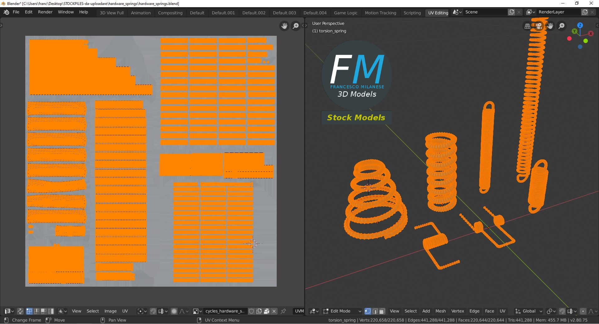 Easily customizable: UV unwrapped geometries, so you can create new Textures (or modify the existing ones) using the UV Layout maps provided in the package (as png with alpha).