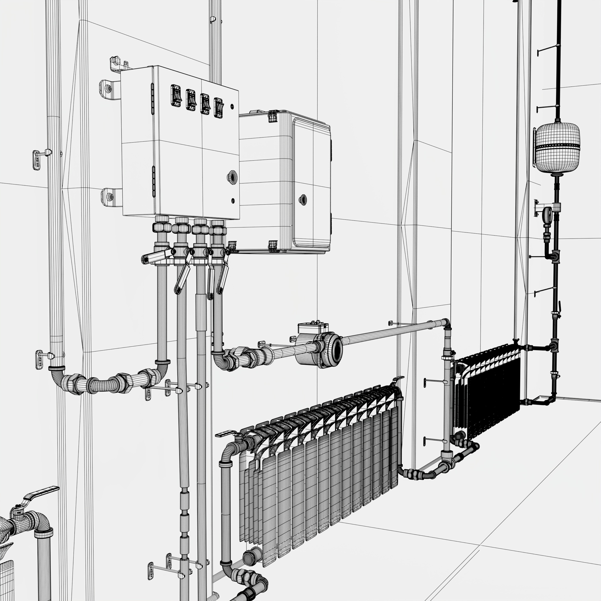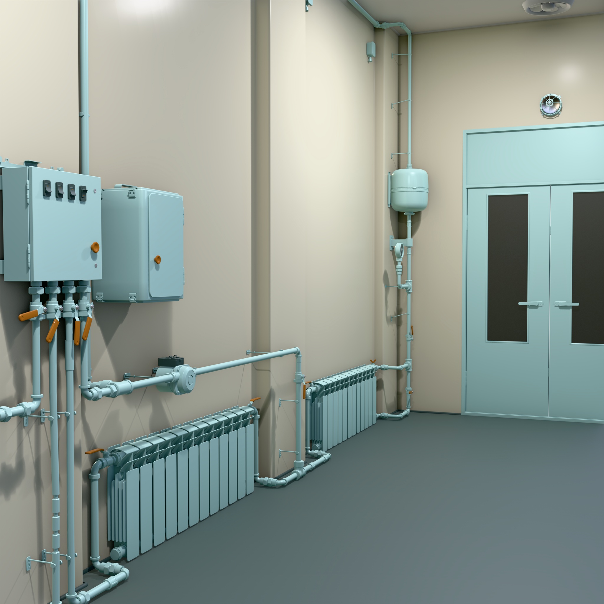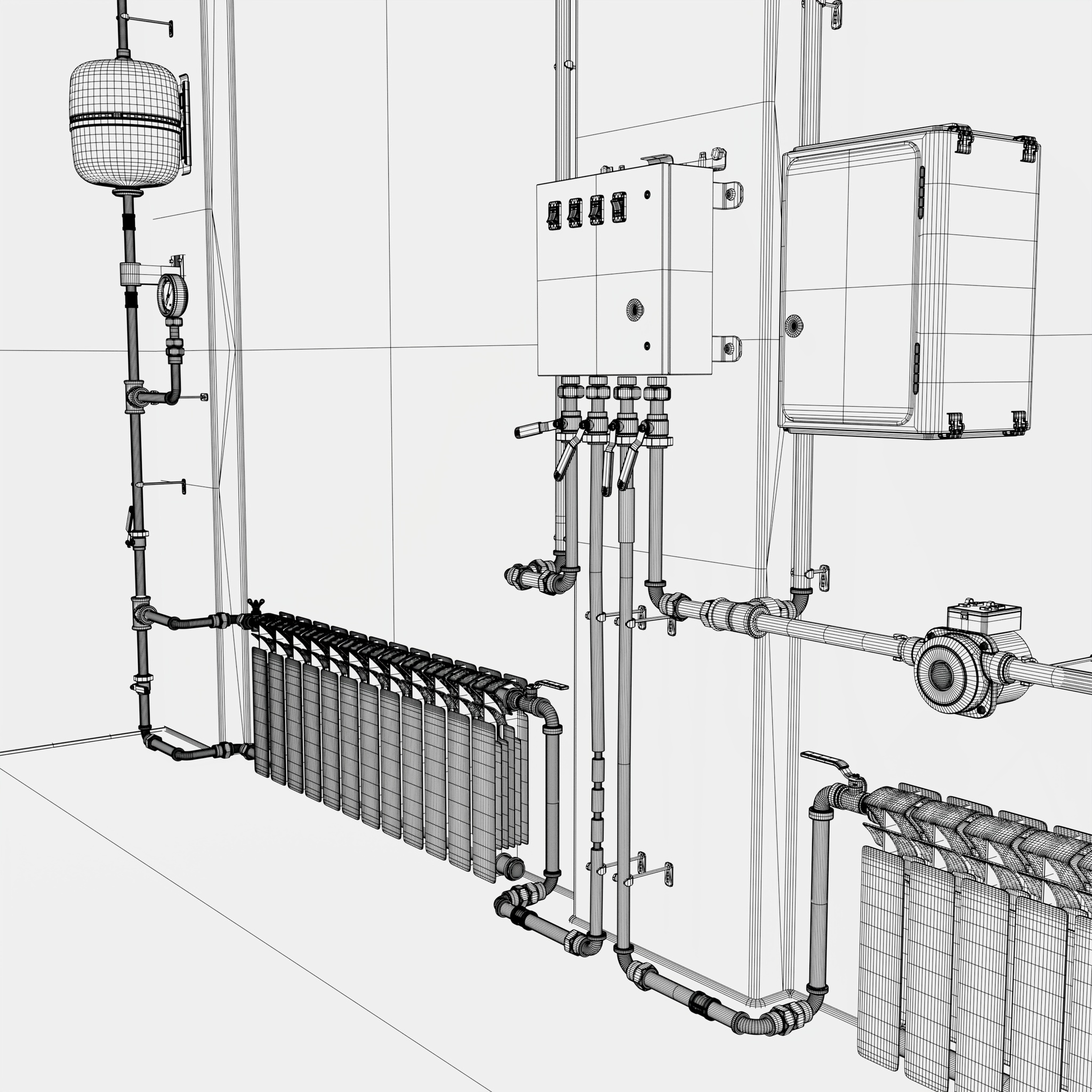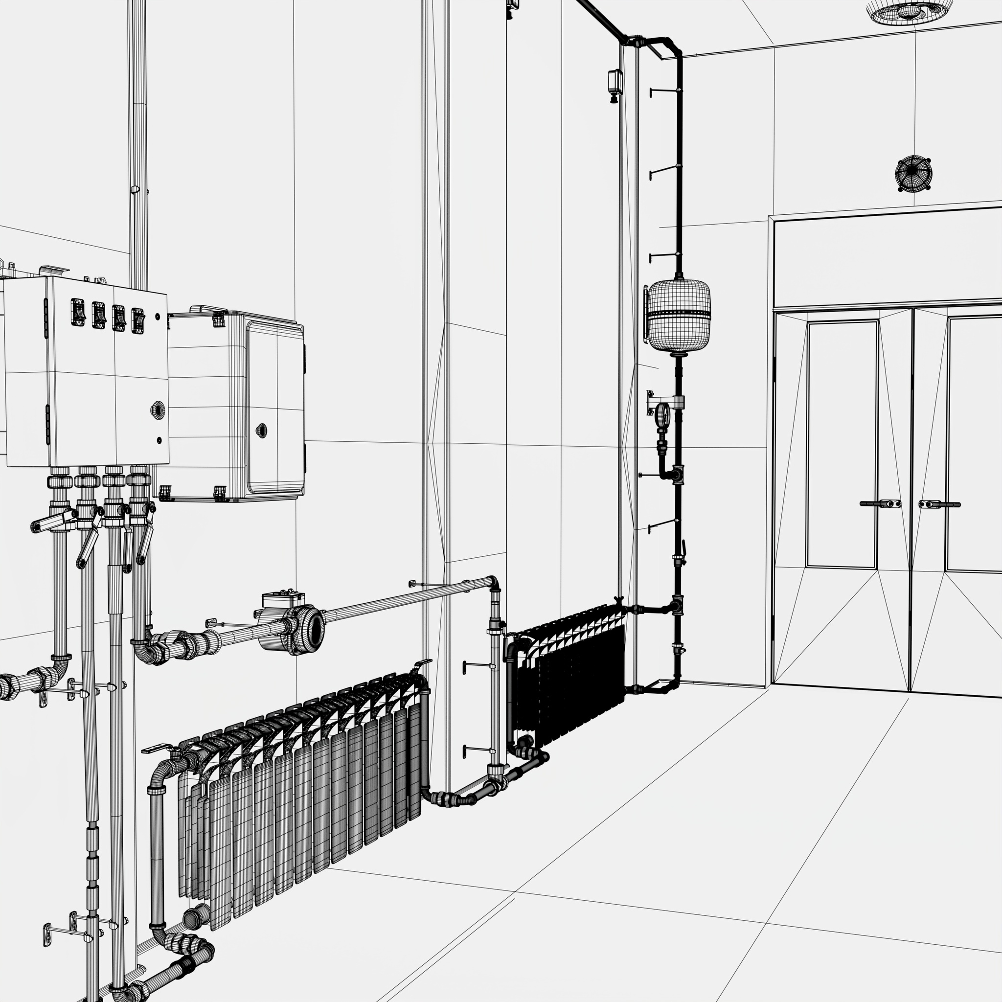 Technical room equipped with a heating system featuring distribution pipelines, radiators, and electrical control units. The walls are fitted with automation panels, an expansion tank, a pump unit, and other components that ensure monitoring and control of the heating process.