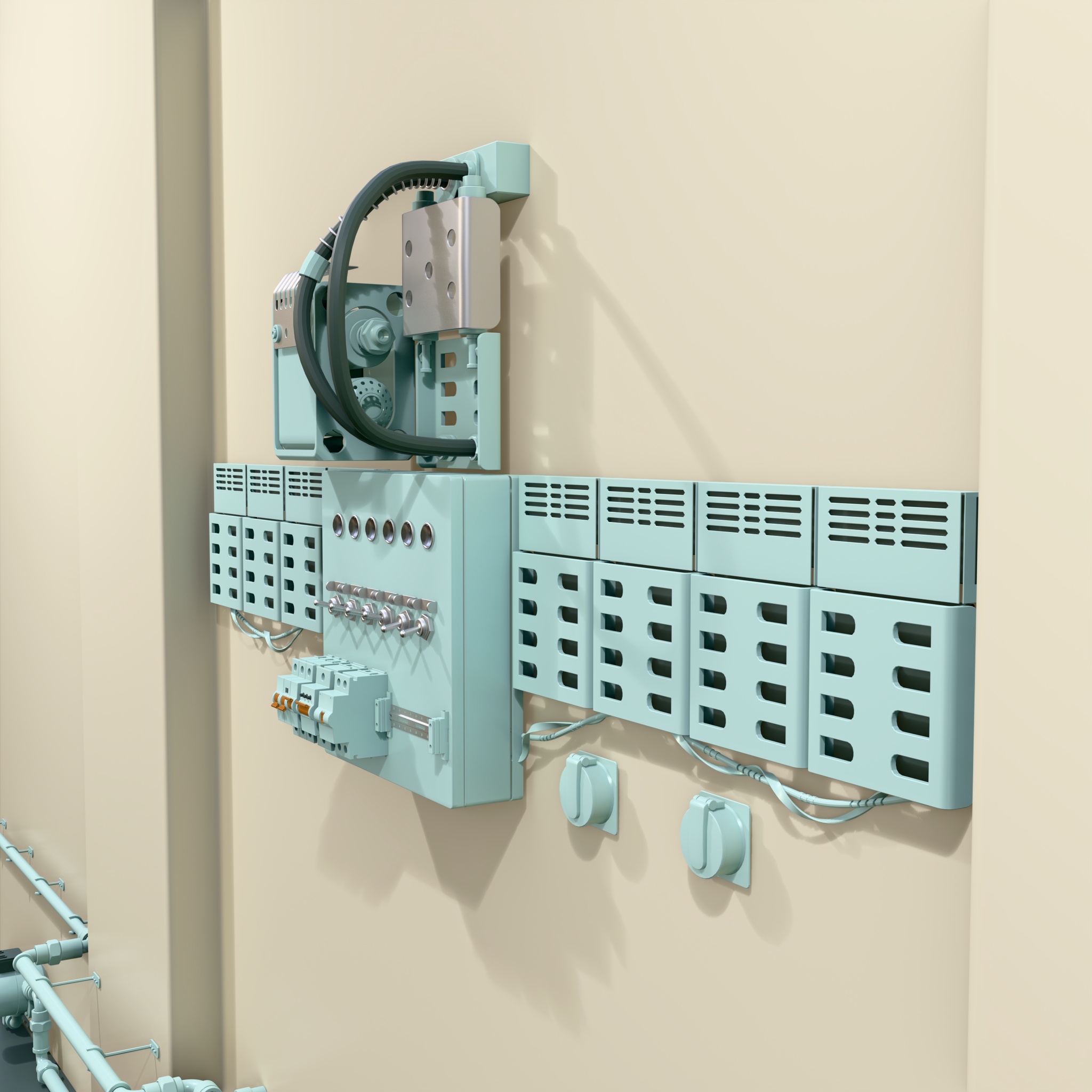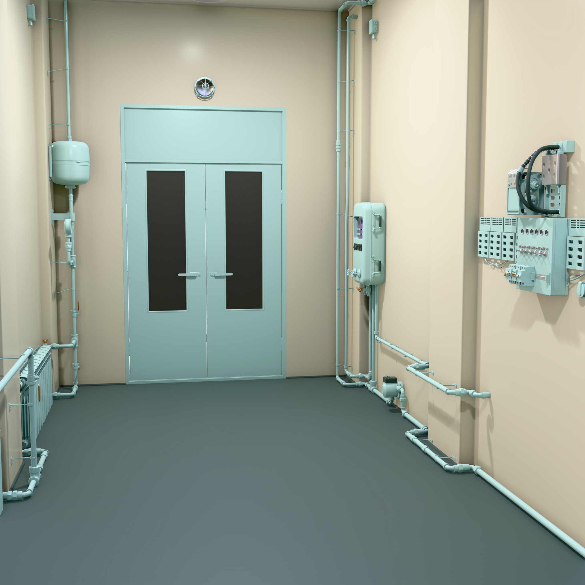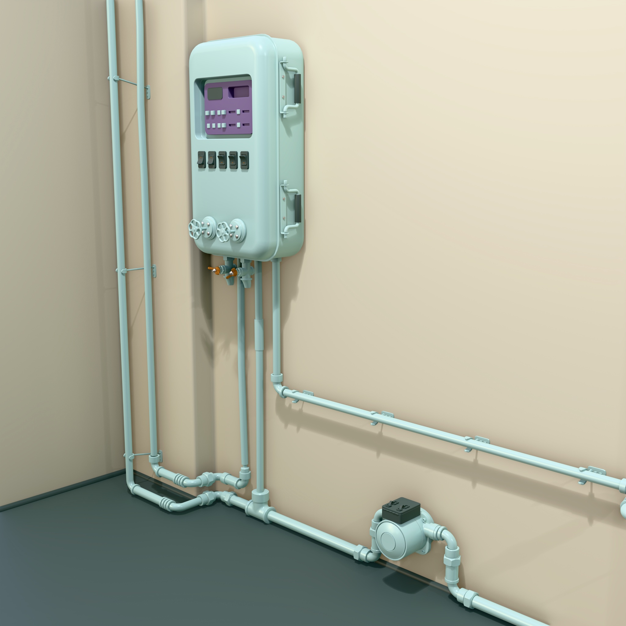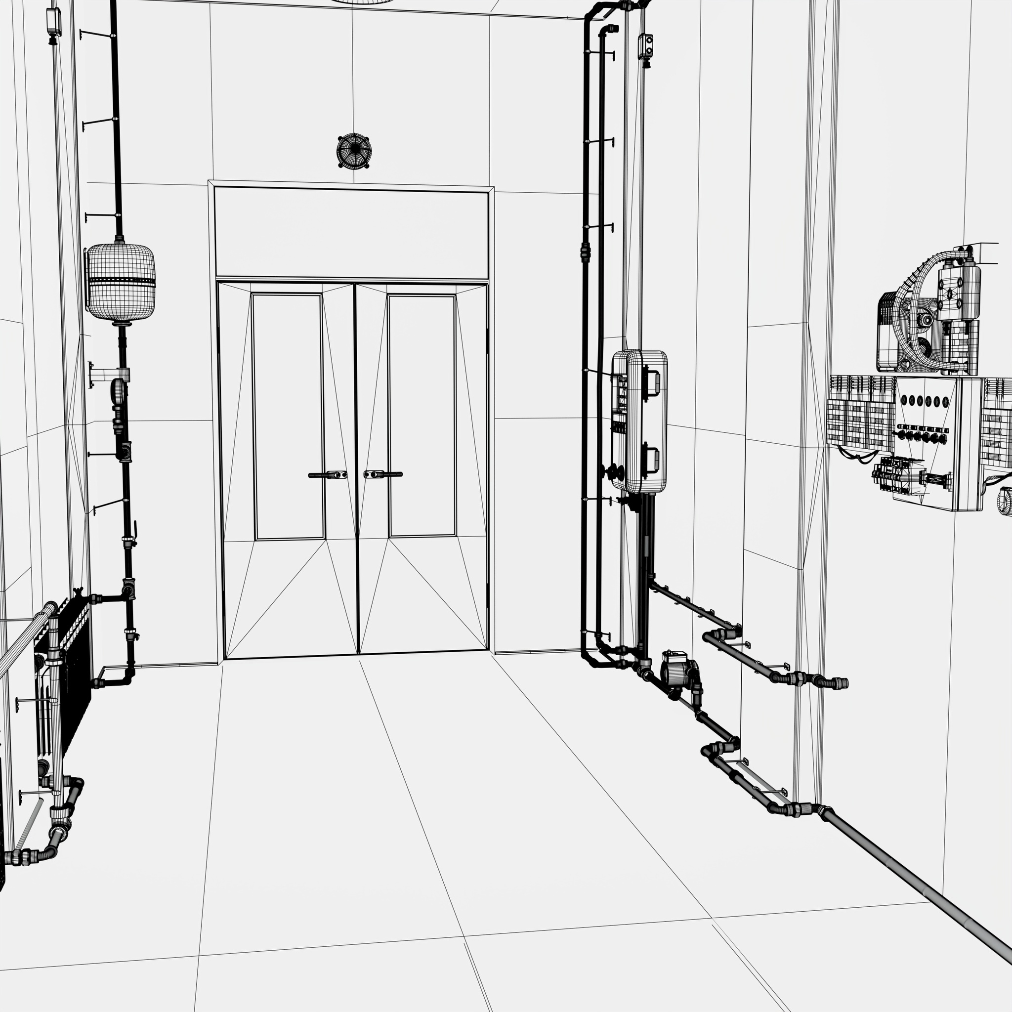 Technical room equipped with a heating system featuring distribution pipelines, radiators, and electrical control units. The walls are fitted with automation panels, an expansion tank, a pump unit, and other components that ensure monitoring and control of the heating process.