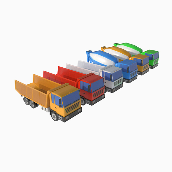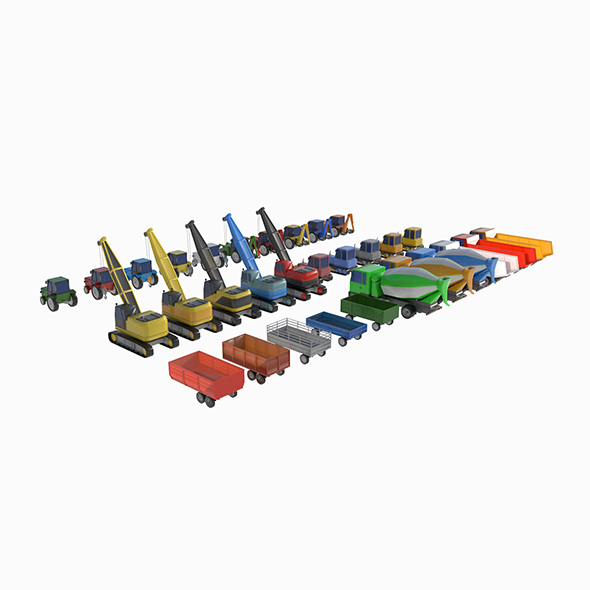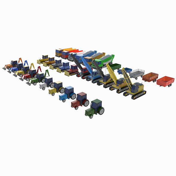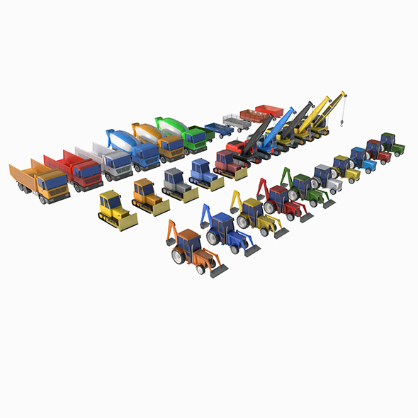 3D models of heavy equipment, excavators, tractors, bulldozers, cranes and dump trucks with mixers. The collection contains 11 unique models and 31 varieties and color variations of models. Each model has from 1500 to4500 polygons, in total the set has 87241 polygons. Models were made in Cinema 4D 2023, converted to 3DS Max, Blender, Unity, Unreal Engine and other formats. Texture palette – png 128×128. The set also includes a scene with vehicles arranged.