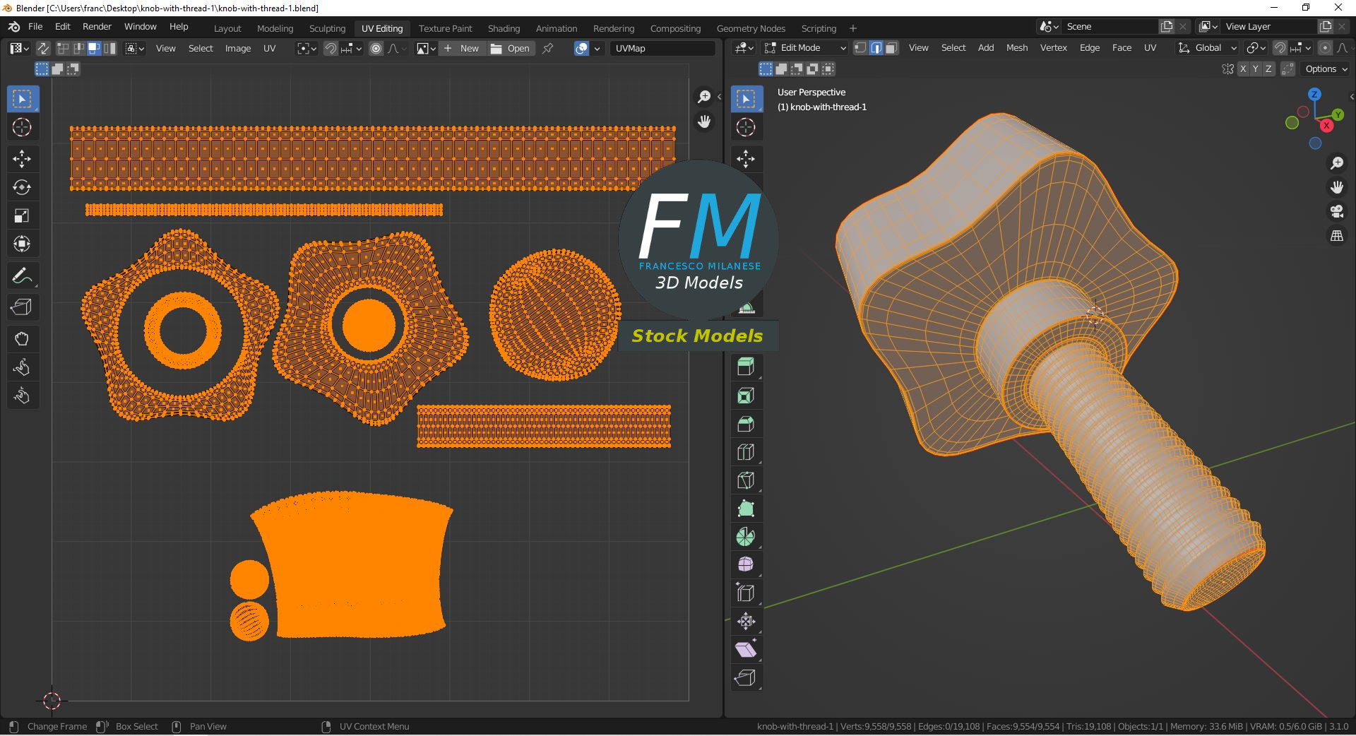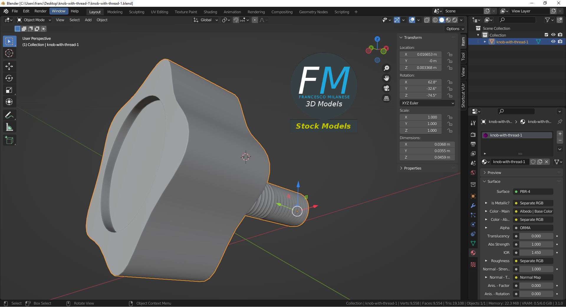 Knob with thread 3D Model, nr. 1 in my collection. Production-ready 3D Model, with PBR materials, textures, non overlapping UV Layout map provided in the package.