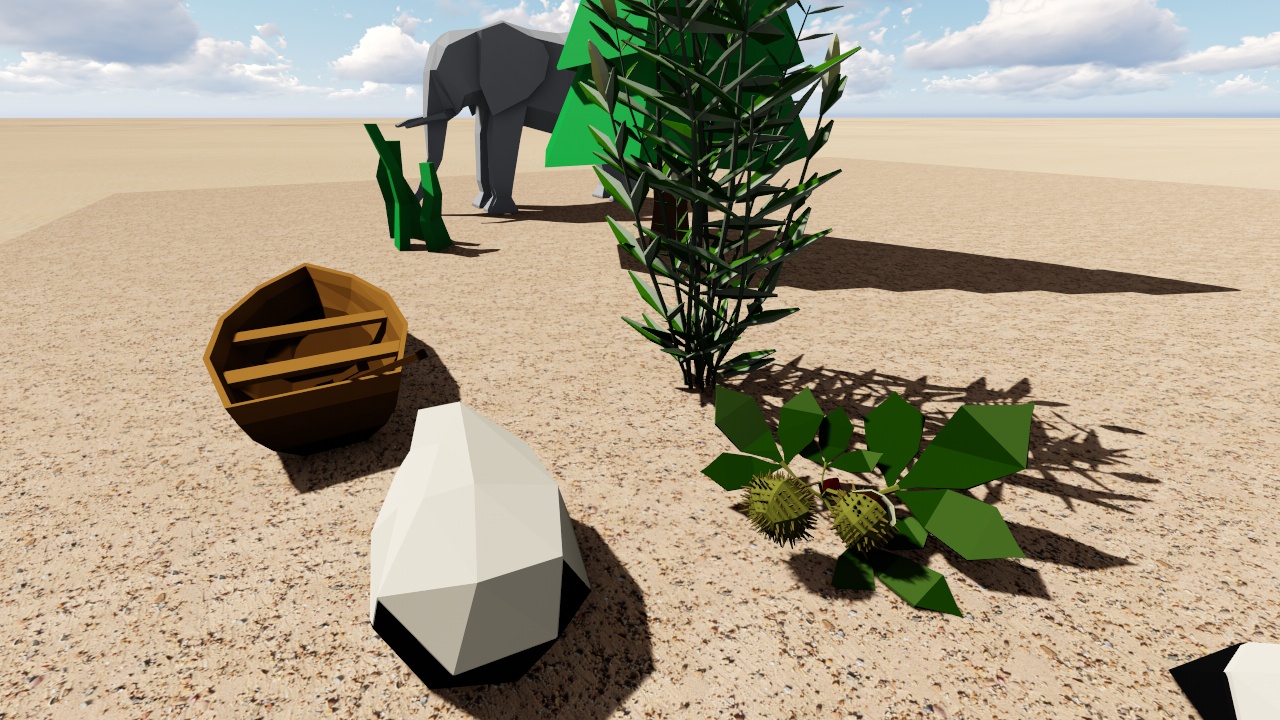 3D model of main set of nature, including more than 60 different elements : football,wooden fence,street lamp,trunk,barrel,clouds,snail,elephant,car,windmill,dragonfly,flying seagul,palm,boat,cane,lotus,hosta,rudbeckia,salvia,willow,echinacea,leafy tree,sheep,goat,straw man,hills,stones,wheat,poppy,tulip,grass,wood hedge,...