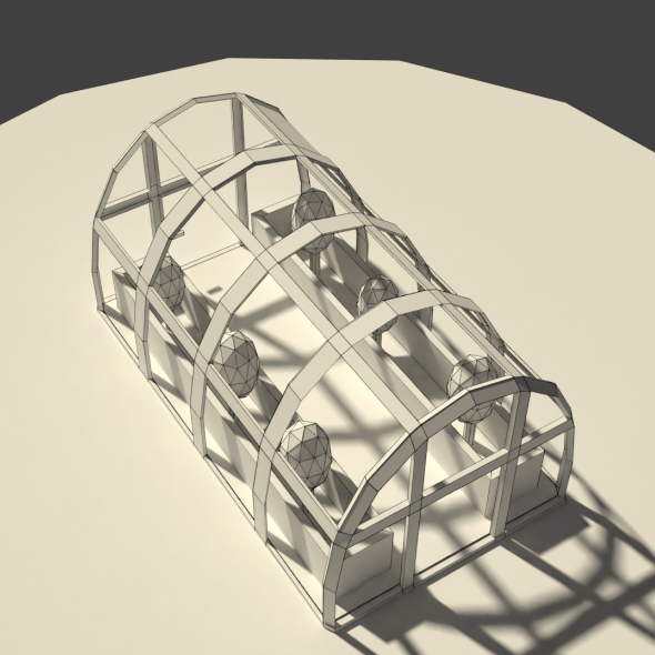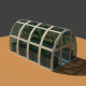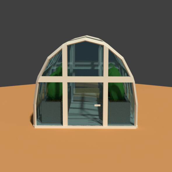 A modern new greenhouse model modeled in a cartoony low poly style. Has some plants inside the structure.