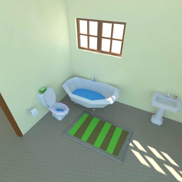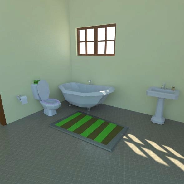 Low Poly model of a sipmle hotel room or individual appartment featuring all elements: bathroom sink,bath,toothbrush,toilet,windows,bed,pillow,door,mattress,nightstand,book,night light,sheet,