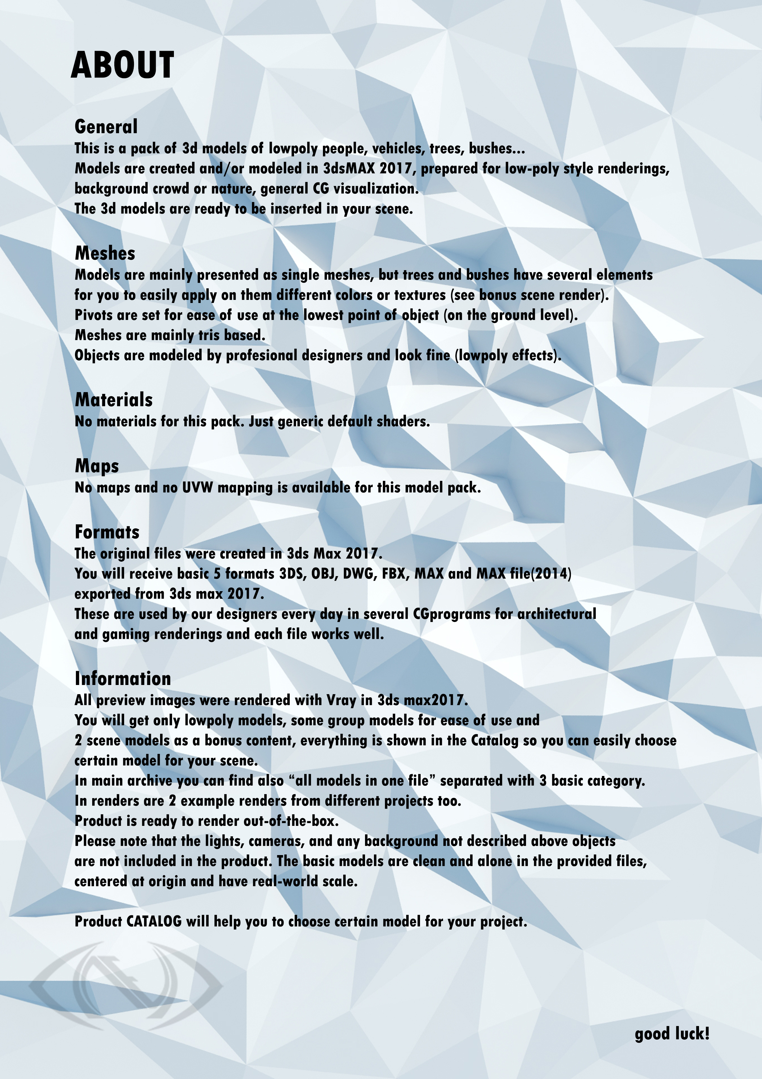 All preview images were rendered with Vray in 3ds max2017. You will get only lowpoly models, some group models for ease of use and 2 scene models as a bonus content, everything is shown in the Catalog so you can easily choose certain model for your scene. In main archive you can find also “all models in one file” separated with 3 basic category. In renders are 2 example renders from different projects too. Please note that the lights, cameras, and any background not described above objects are not included in the product. The basic models are clean and alone in the provided files, centered at origin and have real-world scale. Note that while importing in some cg soft you may have to change scale settings for model to coincide with real scales and/or turn of auto smoothing for lowpoly effect to look fine.