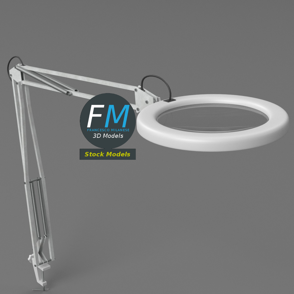 Magnifying lamp 3D Model. 7 individual objects (lens, frame, 2 arms, base, clamp, screw), sharing the same non overlapping UV Layout map, 3 Materials (frame, emitting surface, lens) and PBR Textures sets. Production-ready 3D Model, with PBR materials, textures, non overlapping UV Layout map provided in the package.