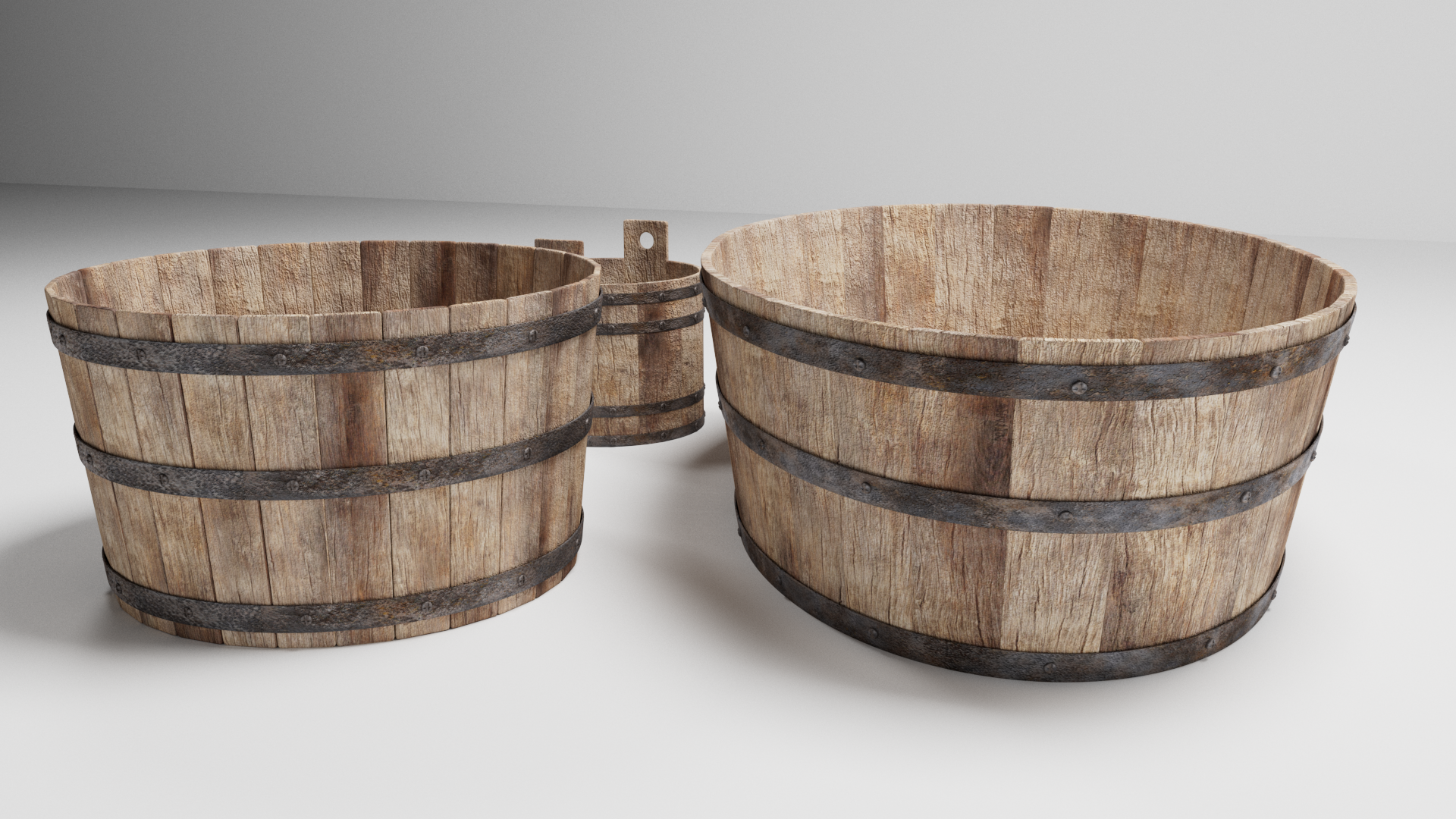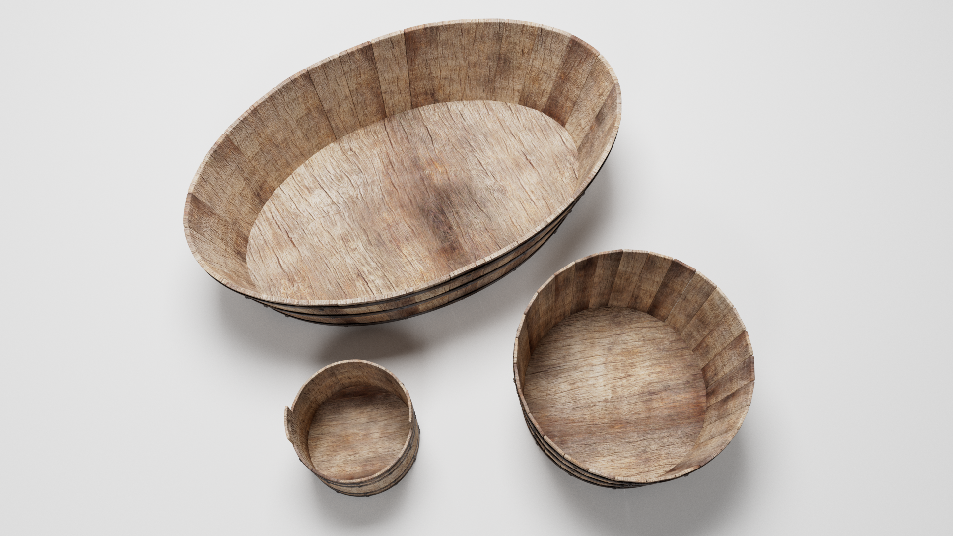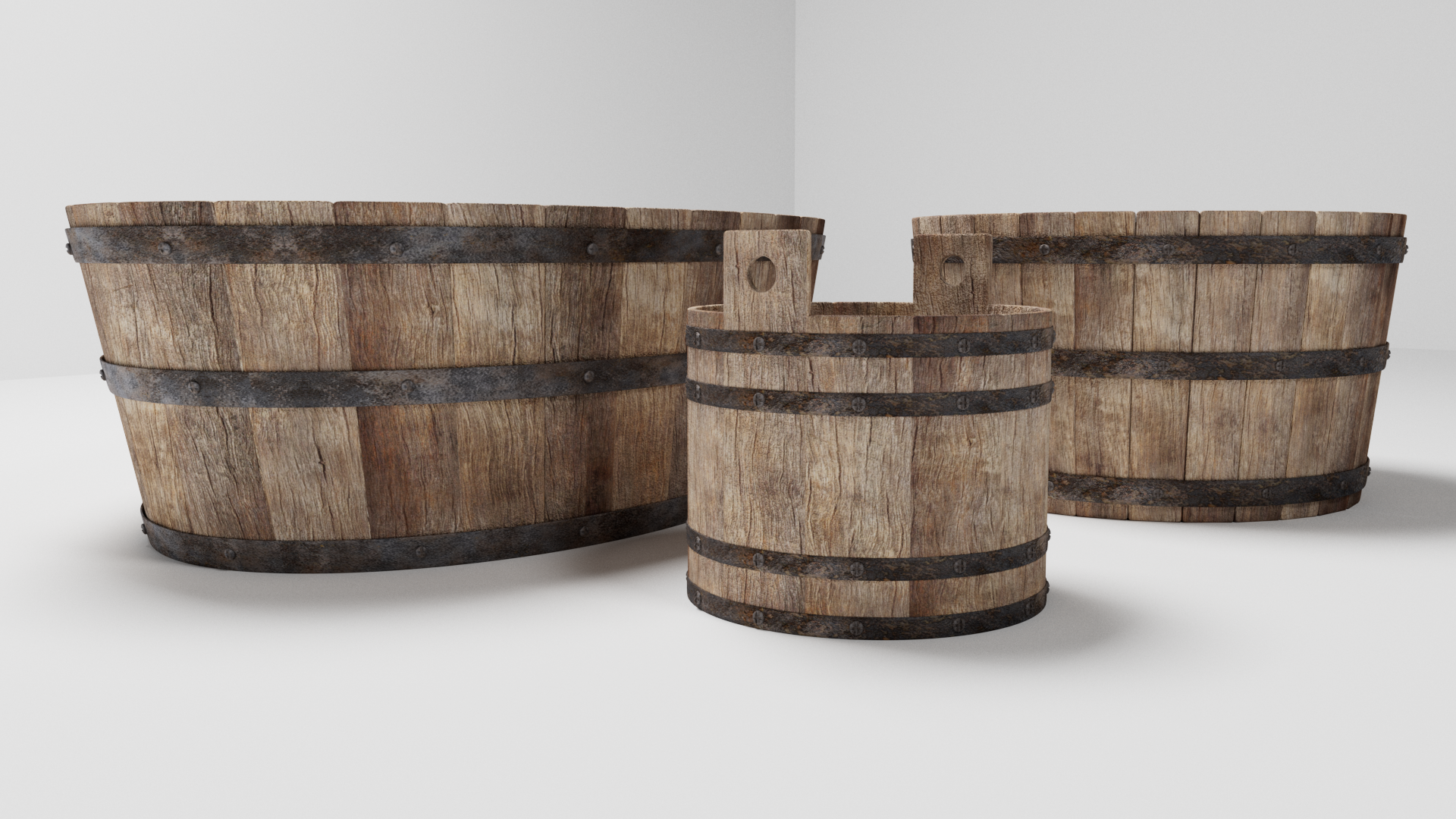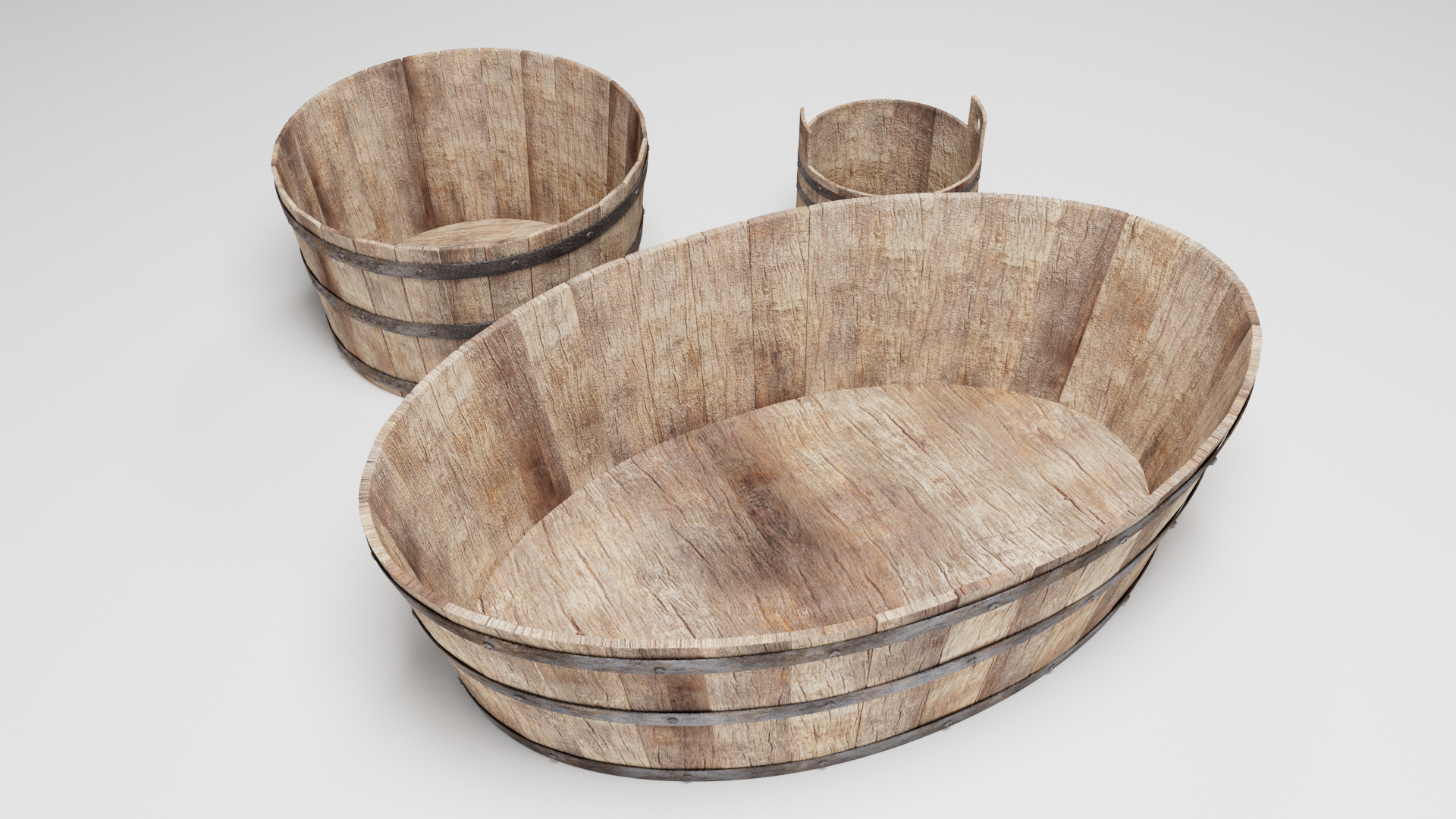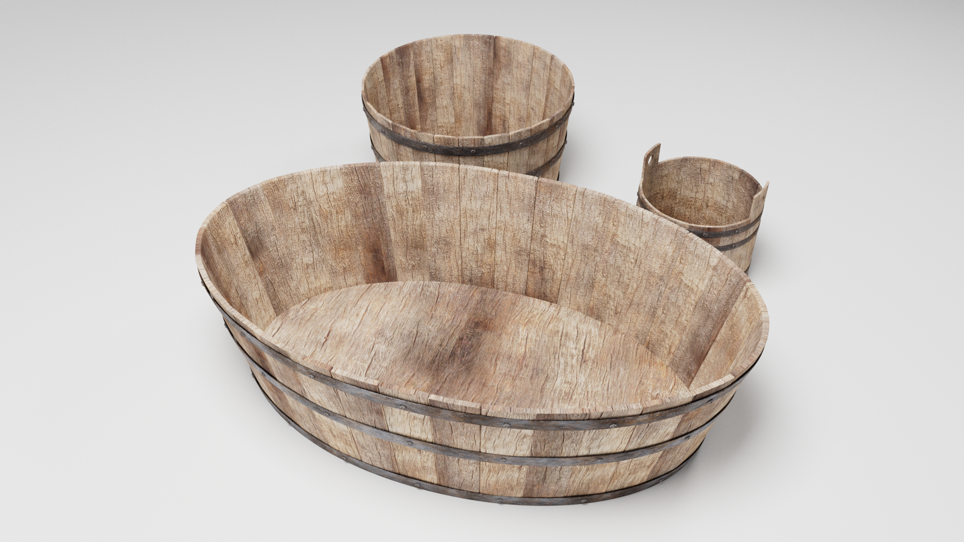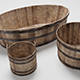 3d models of medieval tub set: - Bucket - Tub - Washtube The file contains texture maps, color maps, bump map, normal maps and meshes. Material are not inserted in the file. Cover images are rendered with vray materials and lights. Easy to edit.