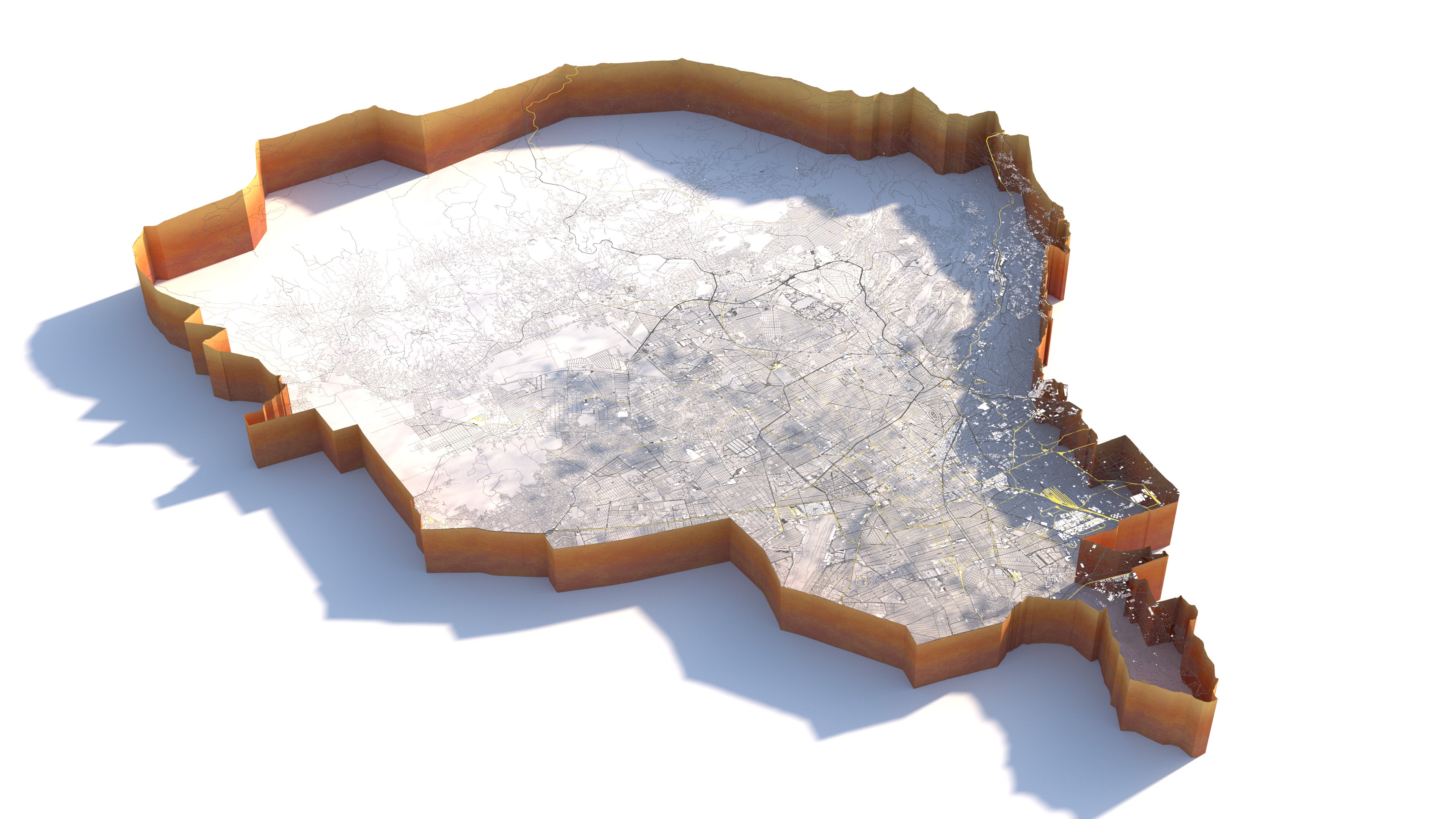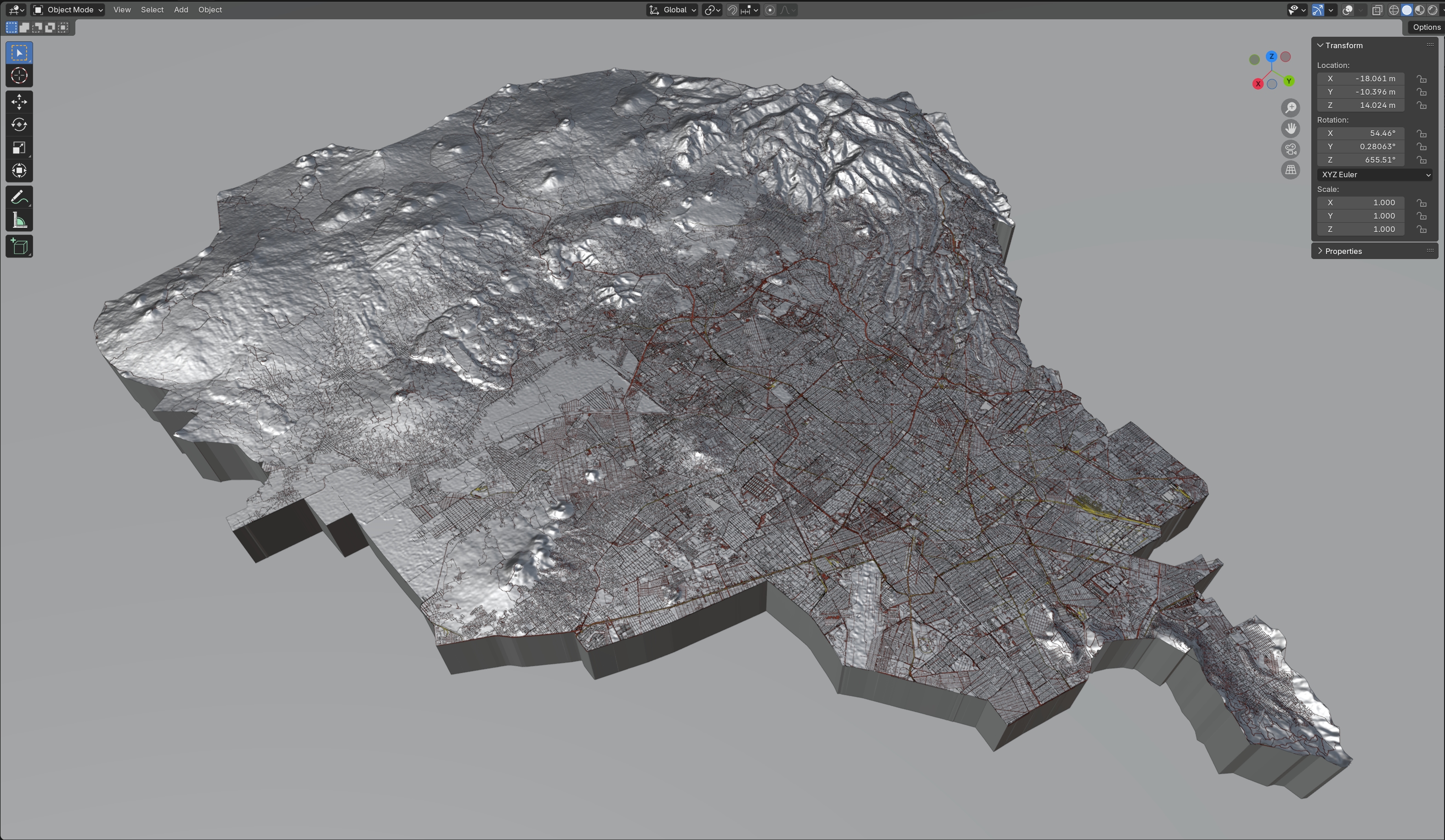 Info: Base satellite texture embedded in blender too Ready to render in Blender with Cycles/EEVEE Terrain, Buildings, Roads are in separated layers Terrain base is high poly Strata material is blender nodes No Plugins used UV mapped is only terrain Royalty free model 3D print is not tested, user will have to do at their own Roads/building etc may have artifact due to terrain landscape, can be seen in renders.