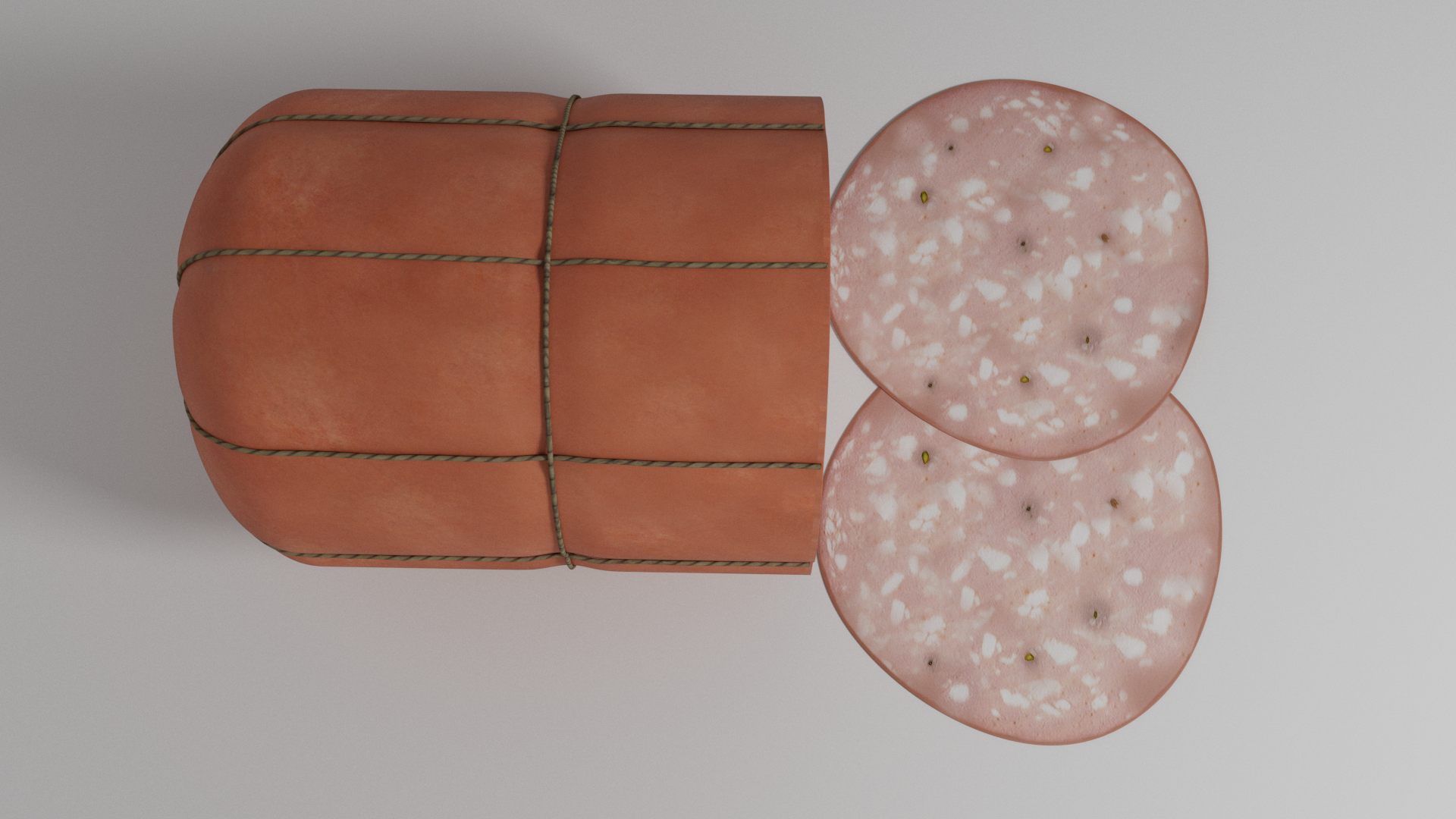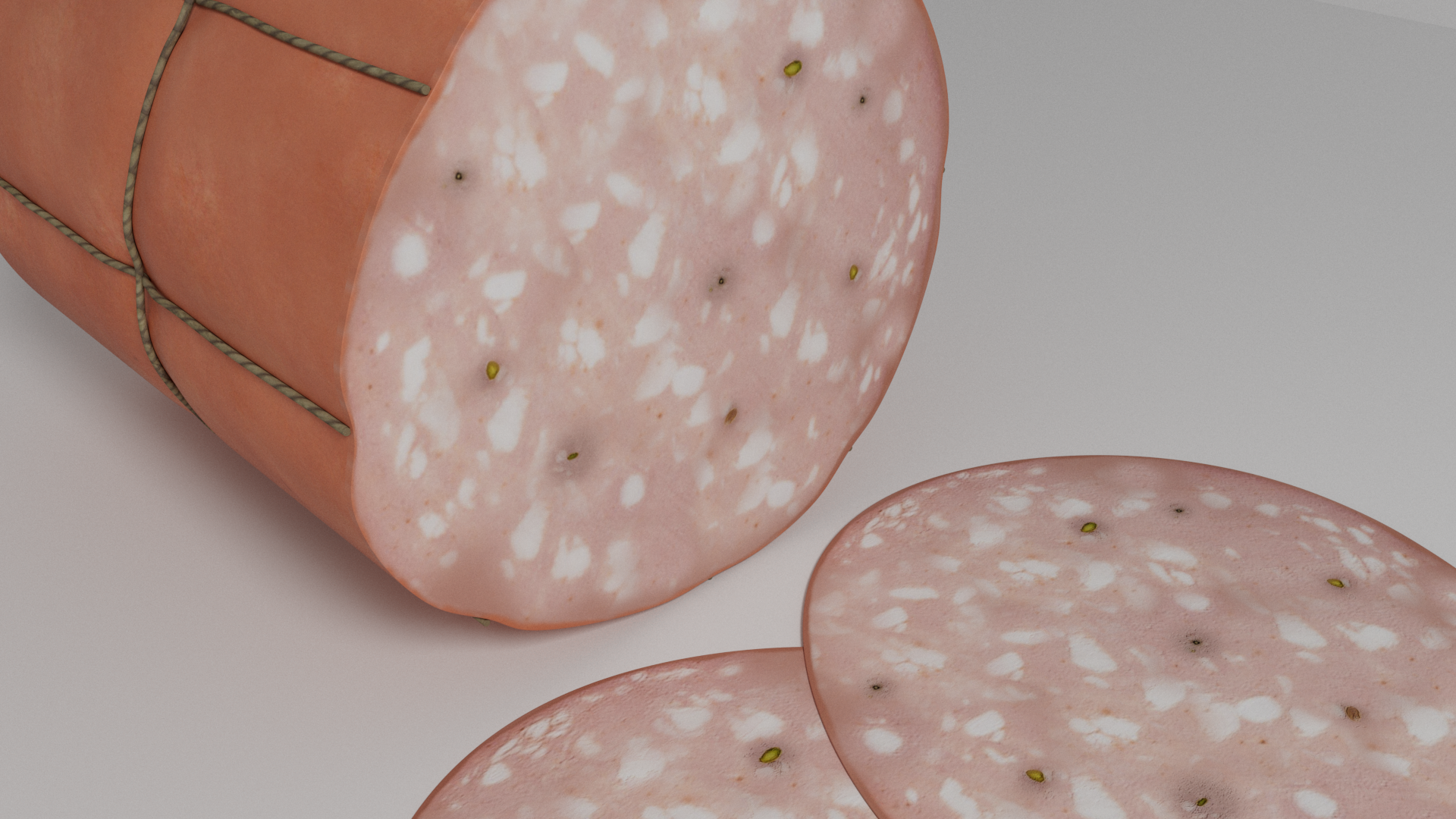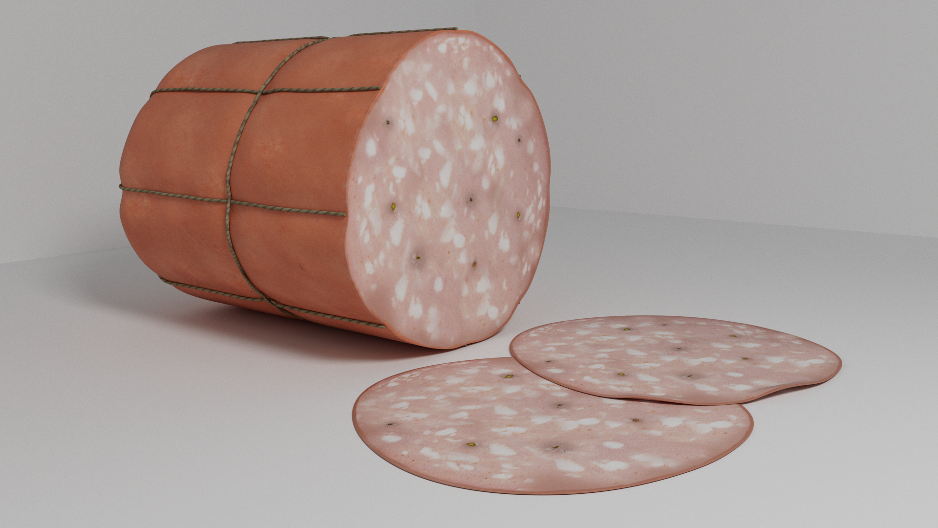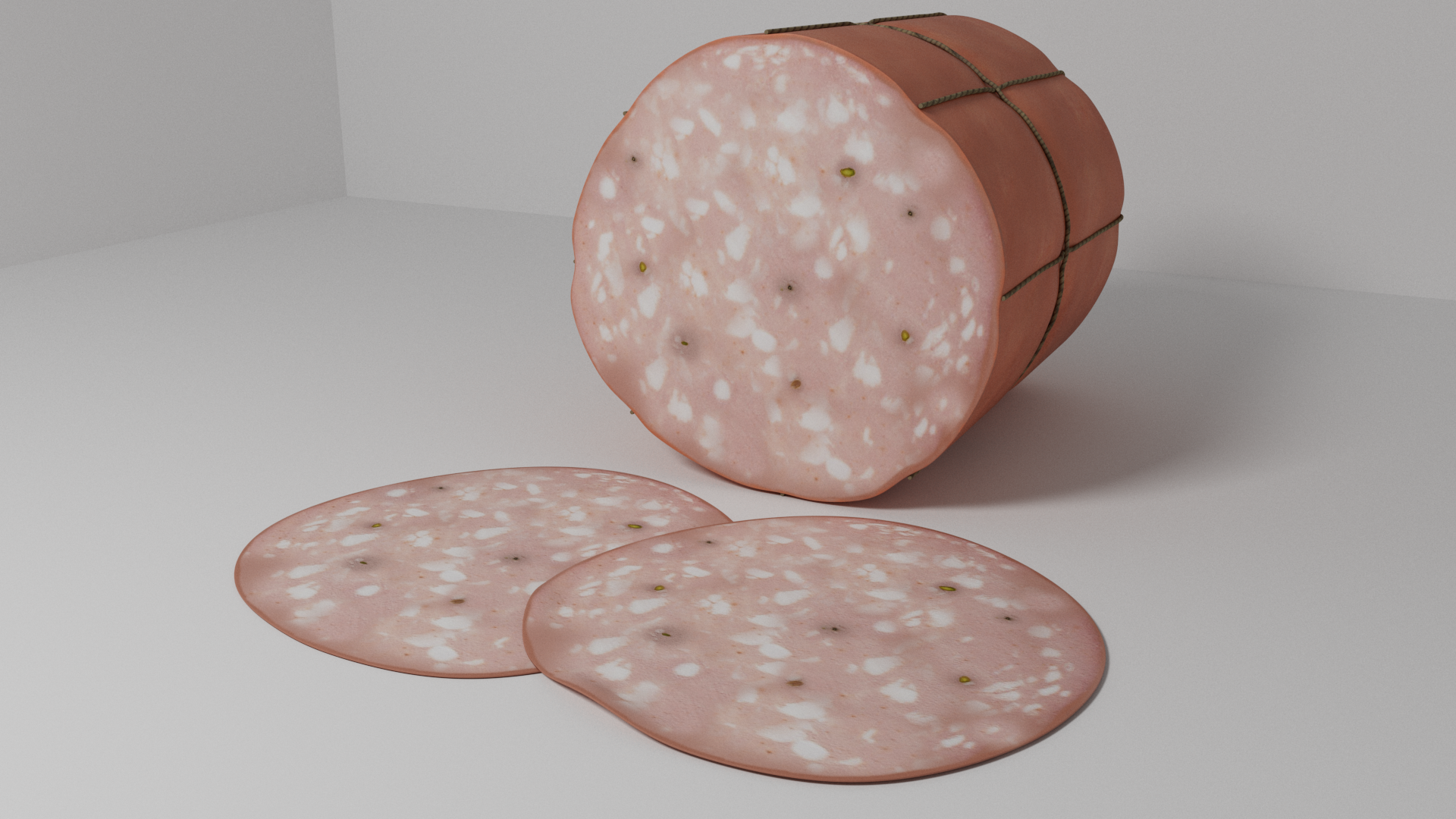 3d model of mortadella. The file contains texture maps, color maps, normal maps and meshes. Materials are not included. Preview images are rendered with vray materials and lights.