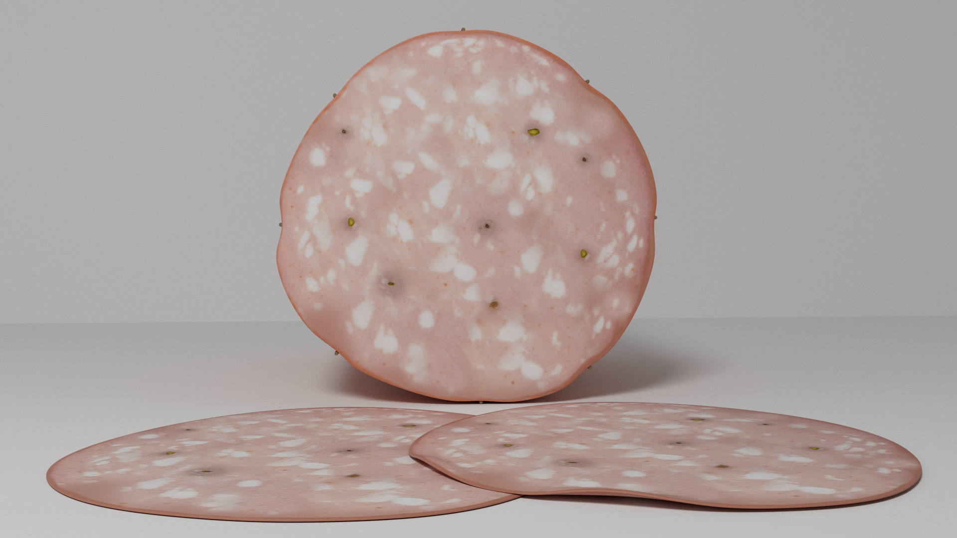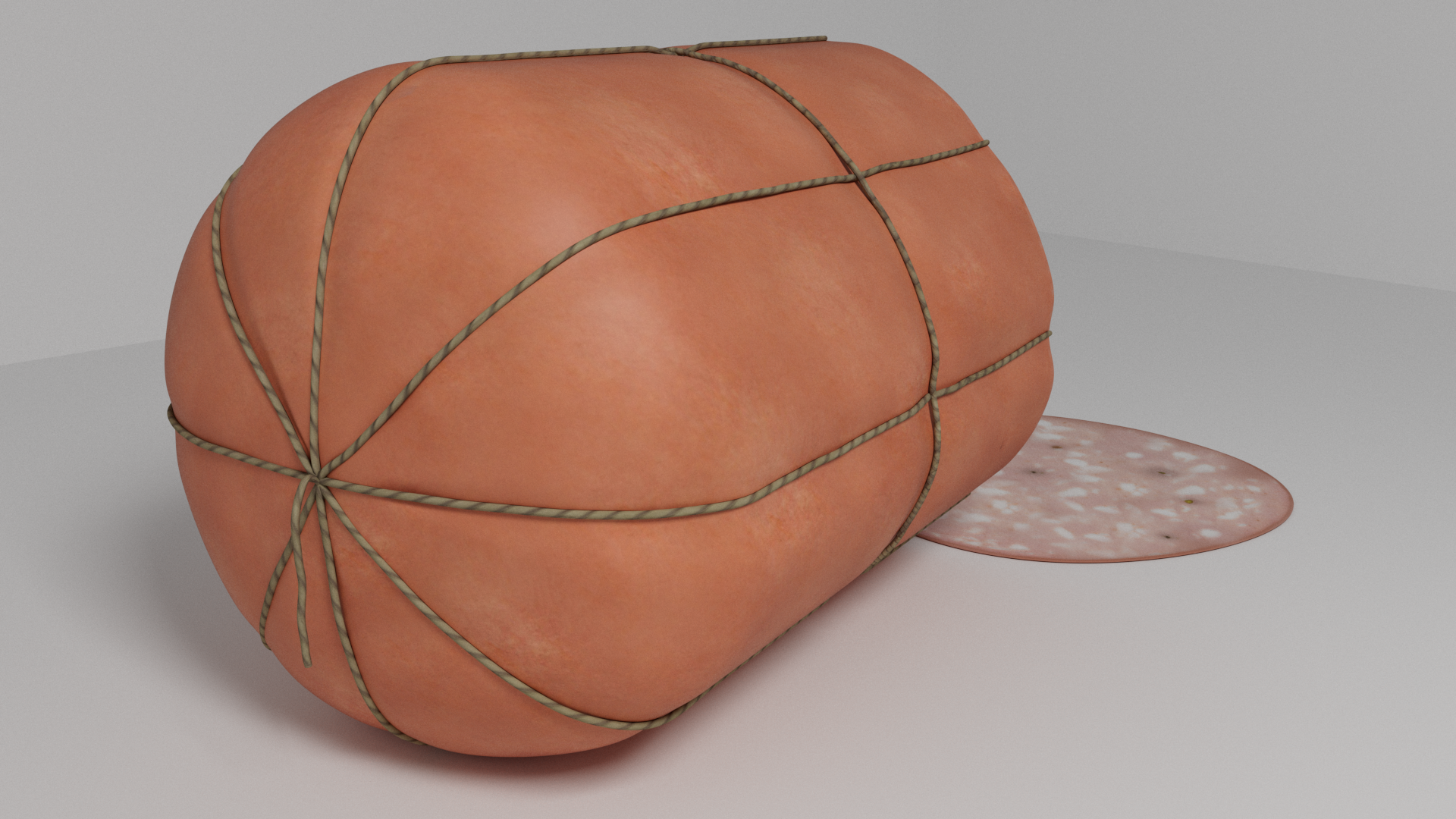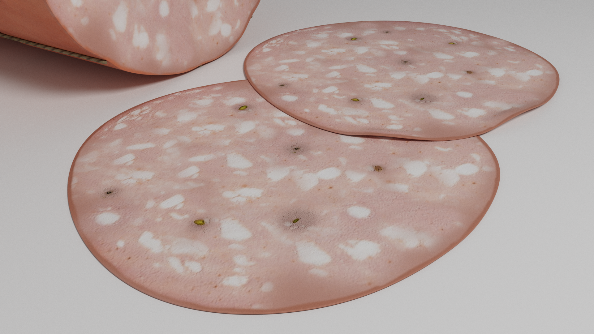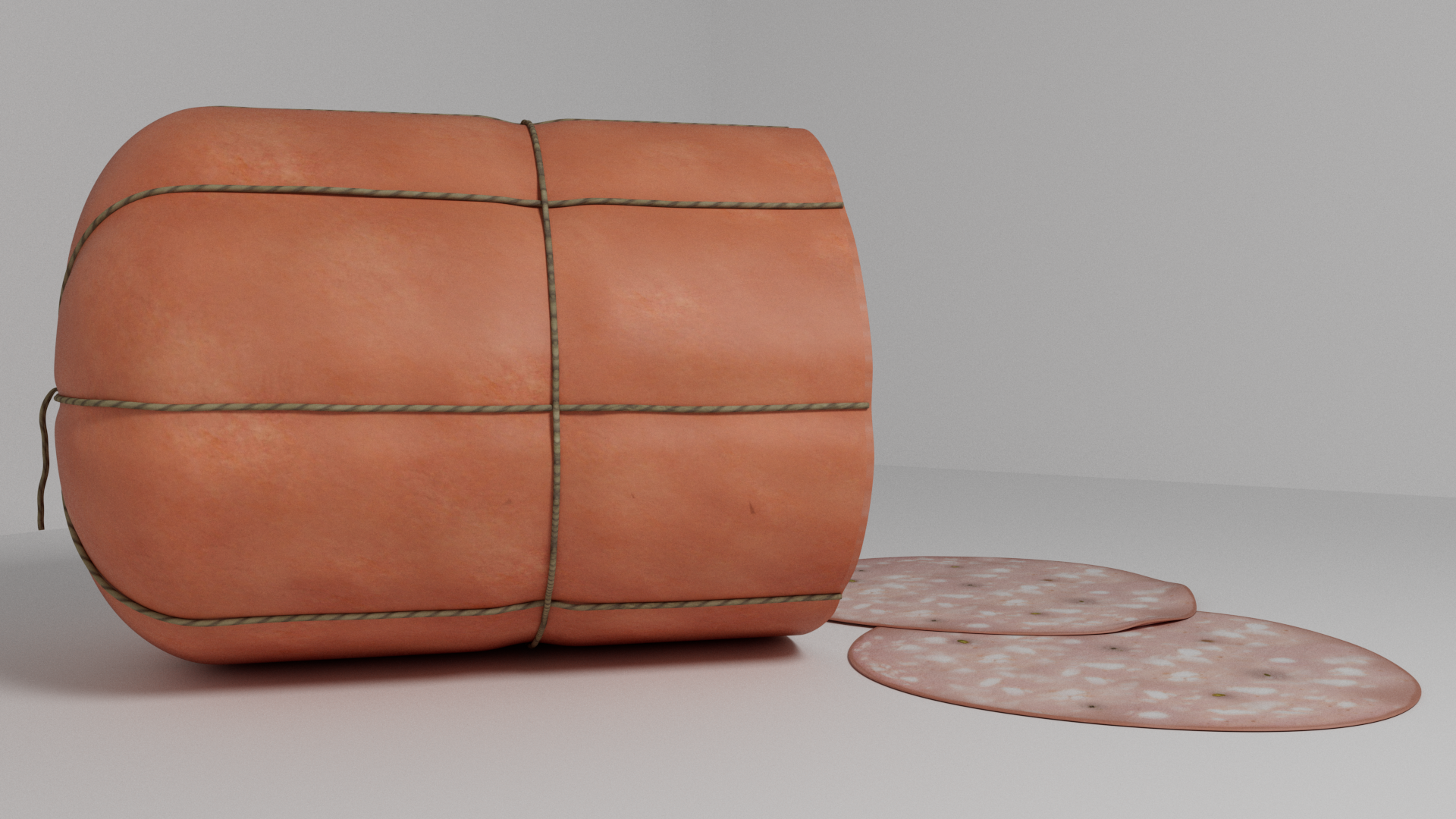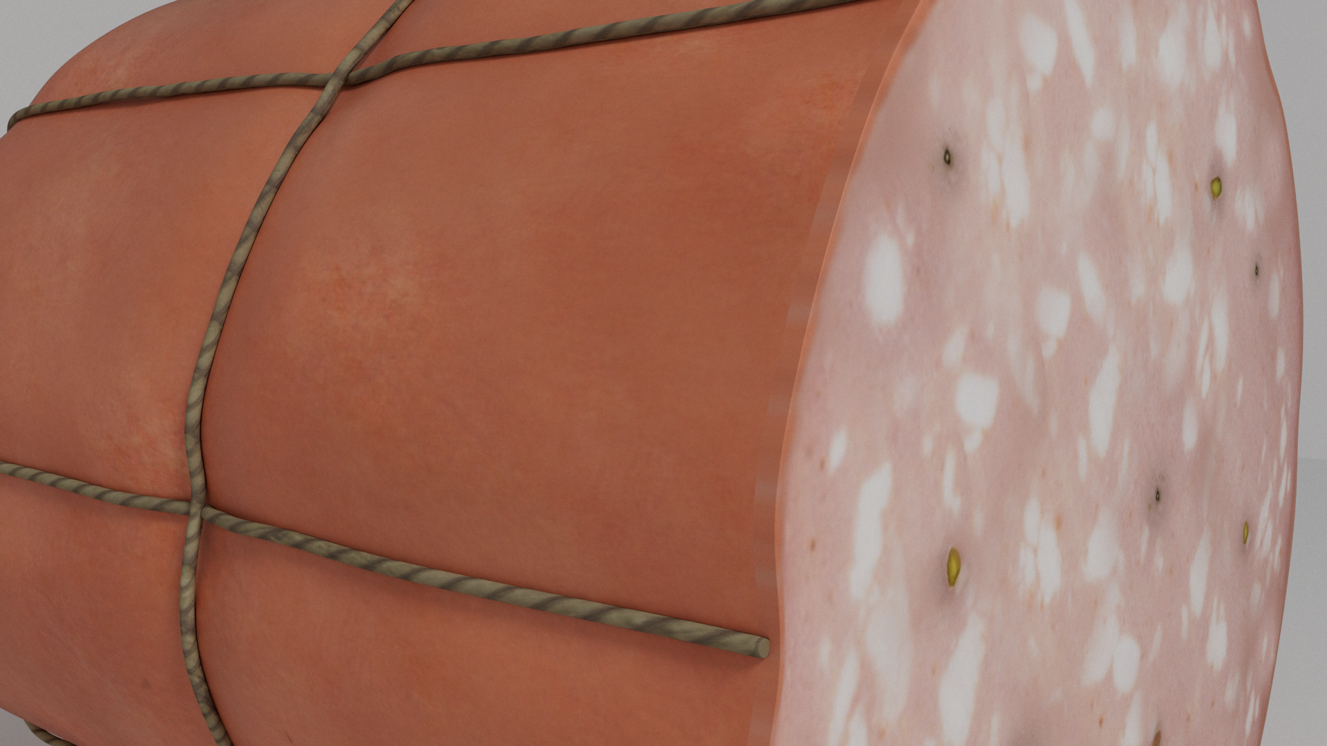 3d model of mortadella. The file contains texture maps, color maps, normal maps and meshes. Materials are not included. Preview images are rendered with vray materials and lights.